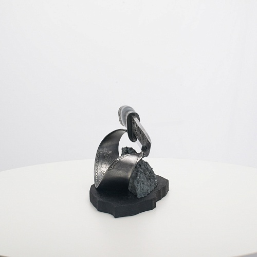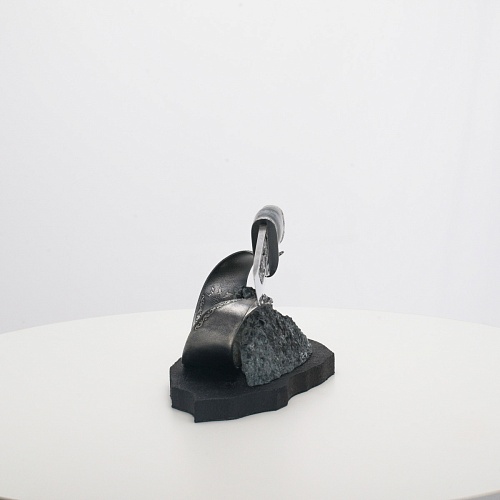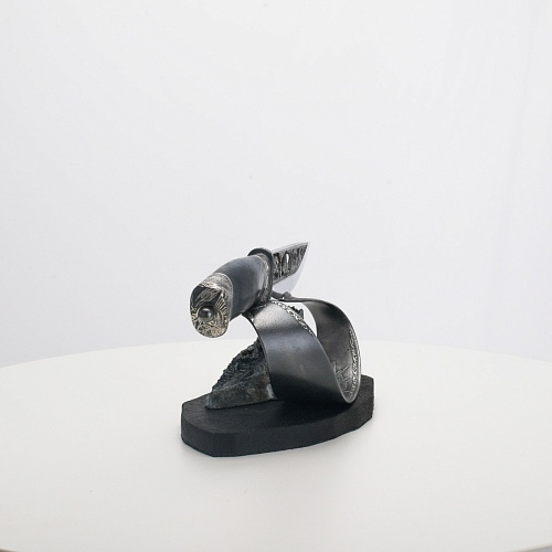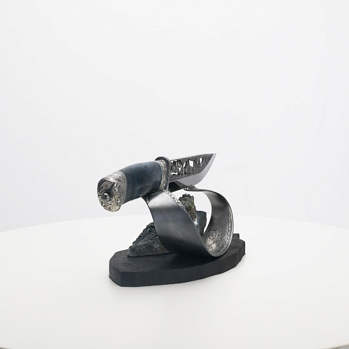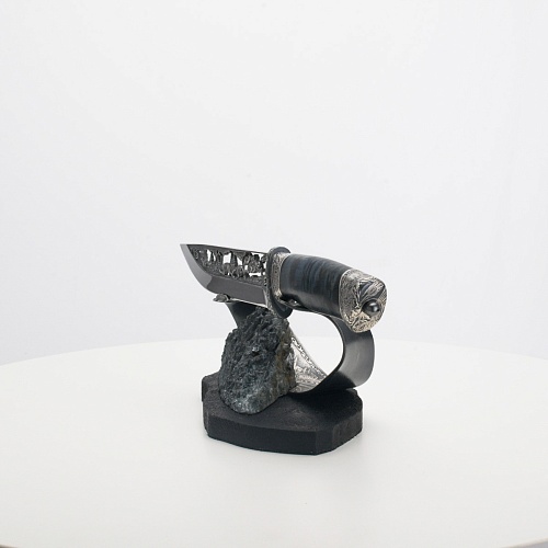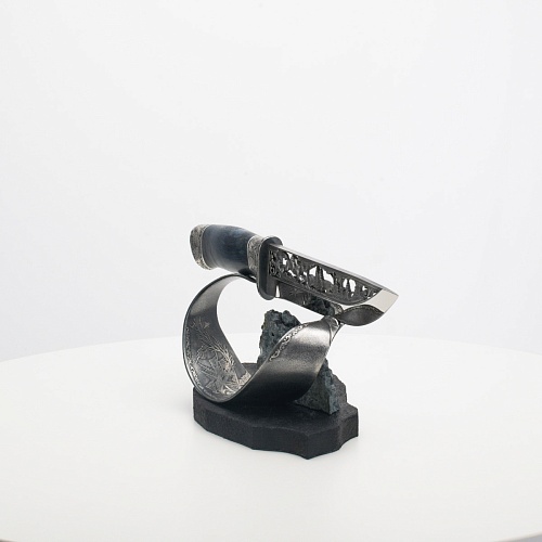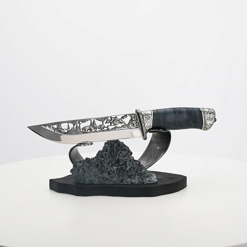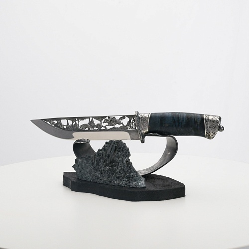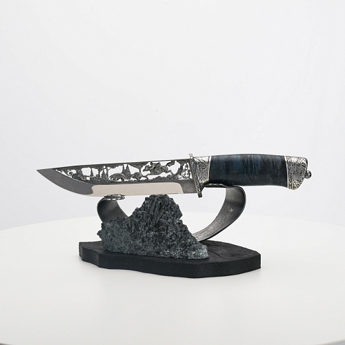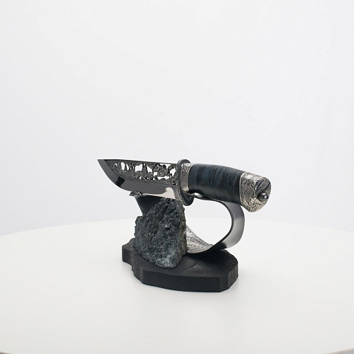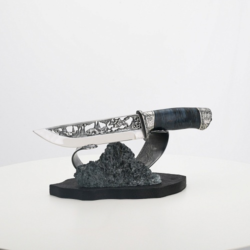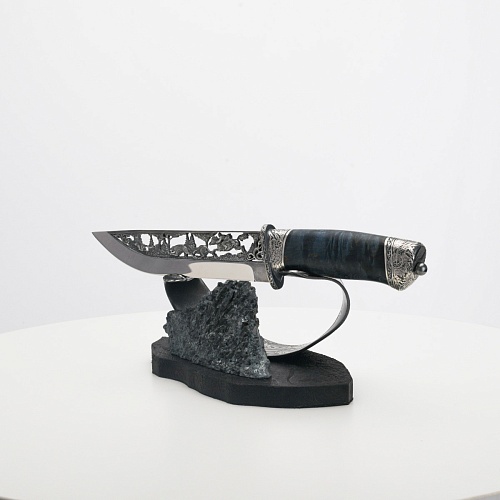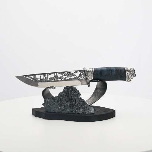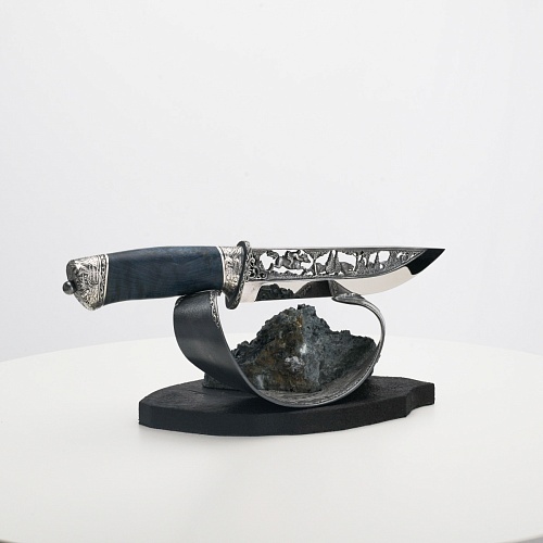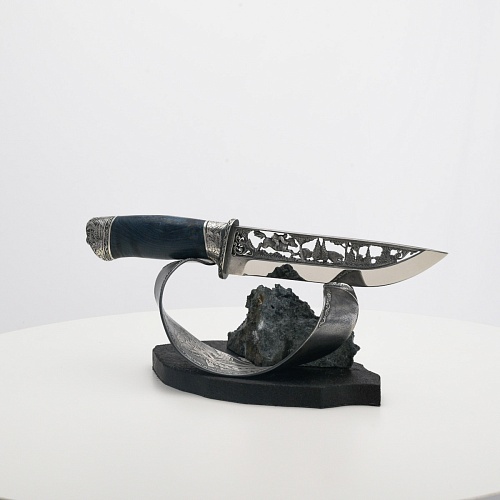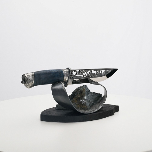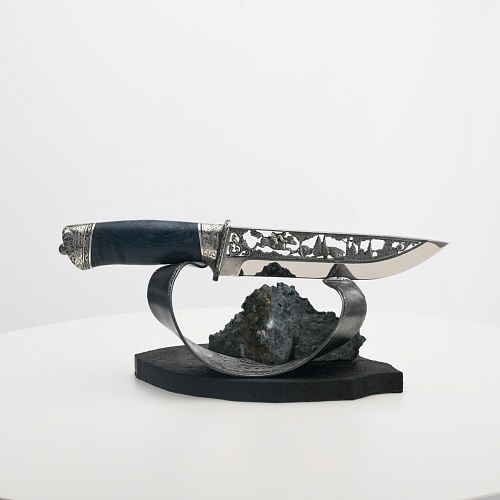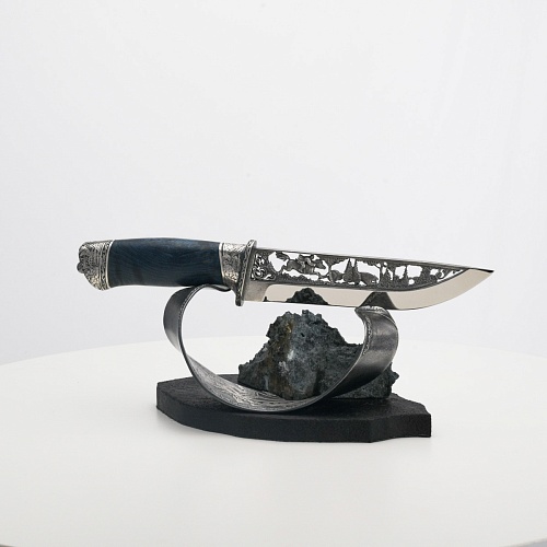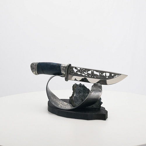 Погоня за лисами показана на искусно выполненном просечном клинке – охотничьи собаки, называемые лисогонами или красногонами, догоняют лисицу, конь несет охотника изо всех сил вперед в погоне за ценной добычей. Сложность и тонкость работы мастеров, изготовивших просечной клинок с гравировкой, можно оценить по тому факту, насколько детально выполнены все элементы и передан азарт охотника. Рукоять ножа выполнена из стабилизированной карельской березы синего цвета, навершие и гарда покрыты серебром и украшены растительными орнаментами, изображениями леса, гор, лесных троп. В композицию входит сложная, оригинальная подставка. На деревянной основе, символизирующей землю, стоит минерал индиголит – редкая разновидность турмалина интенсивно-синей окраски, назван по своему цвету индиго. Цвет индиголита синий, темно-синий, синевато-черный. В старину в России этот камень называли баусом, часто его называют синим турмалином. Сам нож возвышается над металлической деталью в виде завитка, украшенного лесными пейзажами и покрытого серебром.