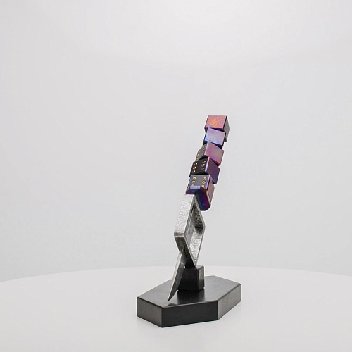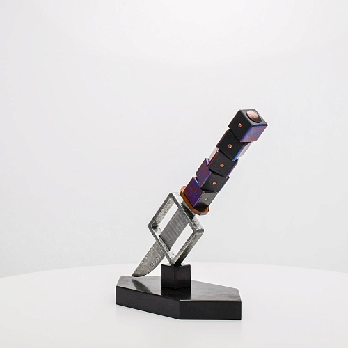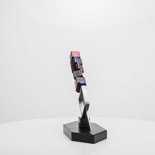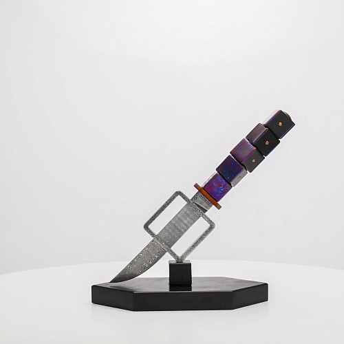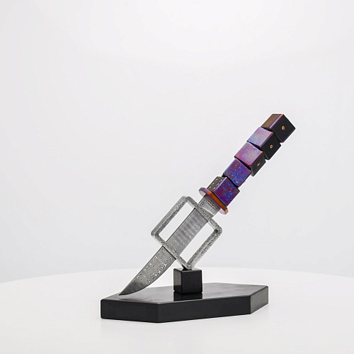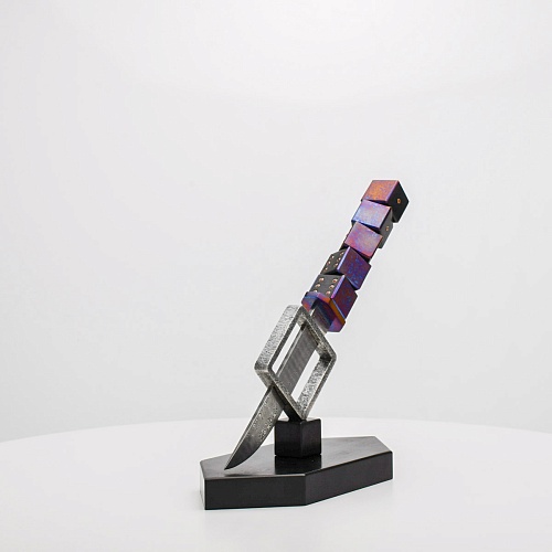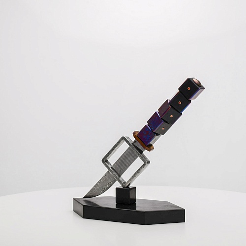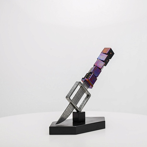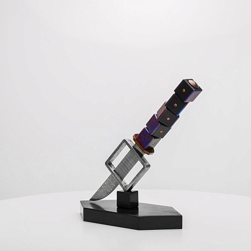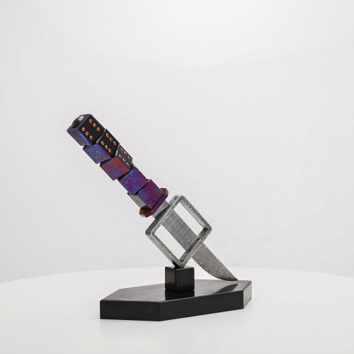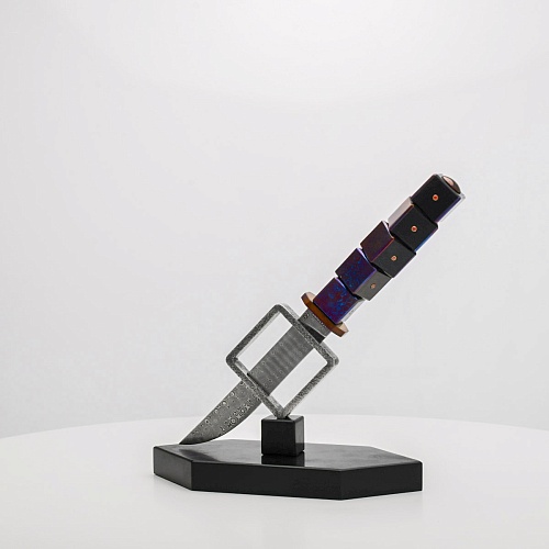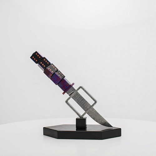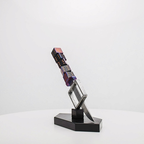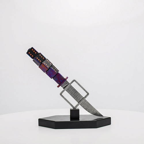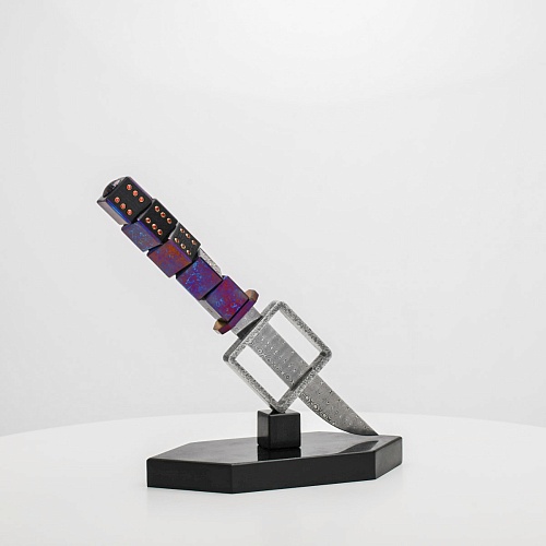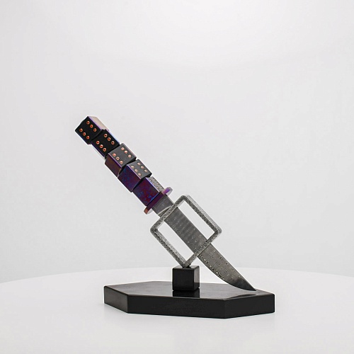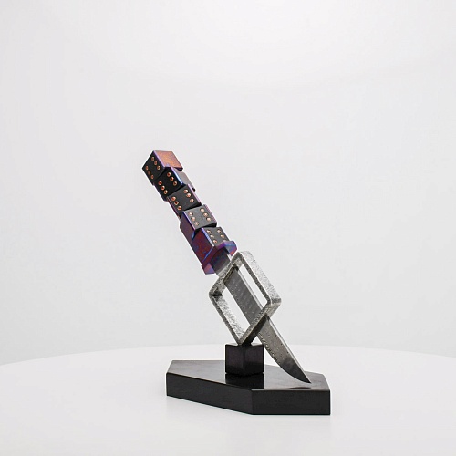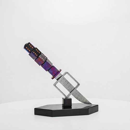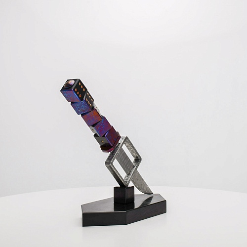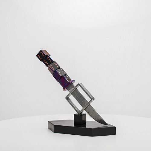 Клинок изготовлен из атмосферостойкого дамаска ZDI-1016 (узор «дикий»). А рукоять ножа представляет собой застывший момент полета игральных костей, когда кубики брошены на стол и вот-вот сложатся в самую удачную комбинацию, которая принесет игроку желаемый результат. Кубики сделаны из черного граба с инкрустированными гранатами и титанового дамаска ZlaTi с узором "дикий". Нож установлен на геометрической подставке, которая своей формой еще раз напоминает о кубиках удачи, а основание 6-гранной формы ассоциируется с 6 счастливыми цифрами на кубике.