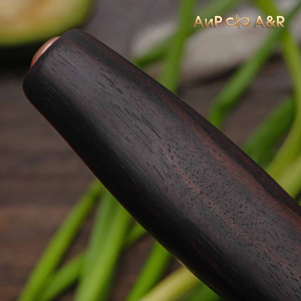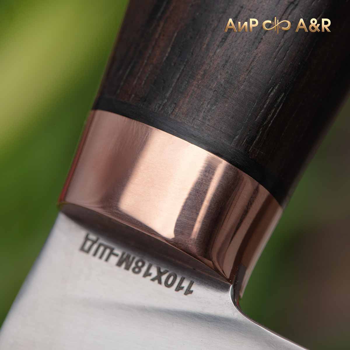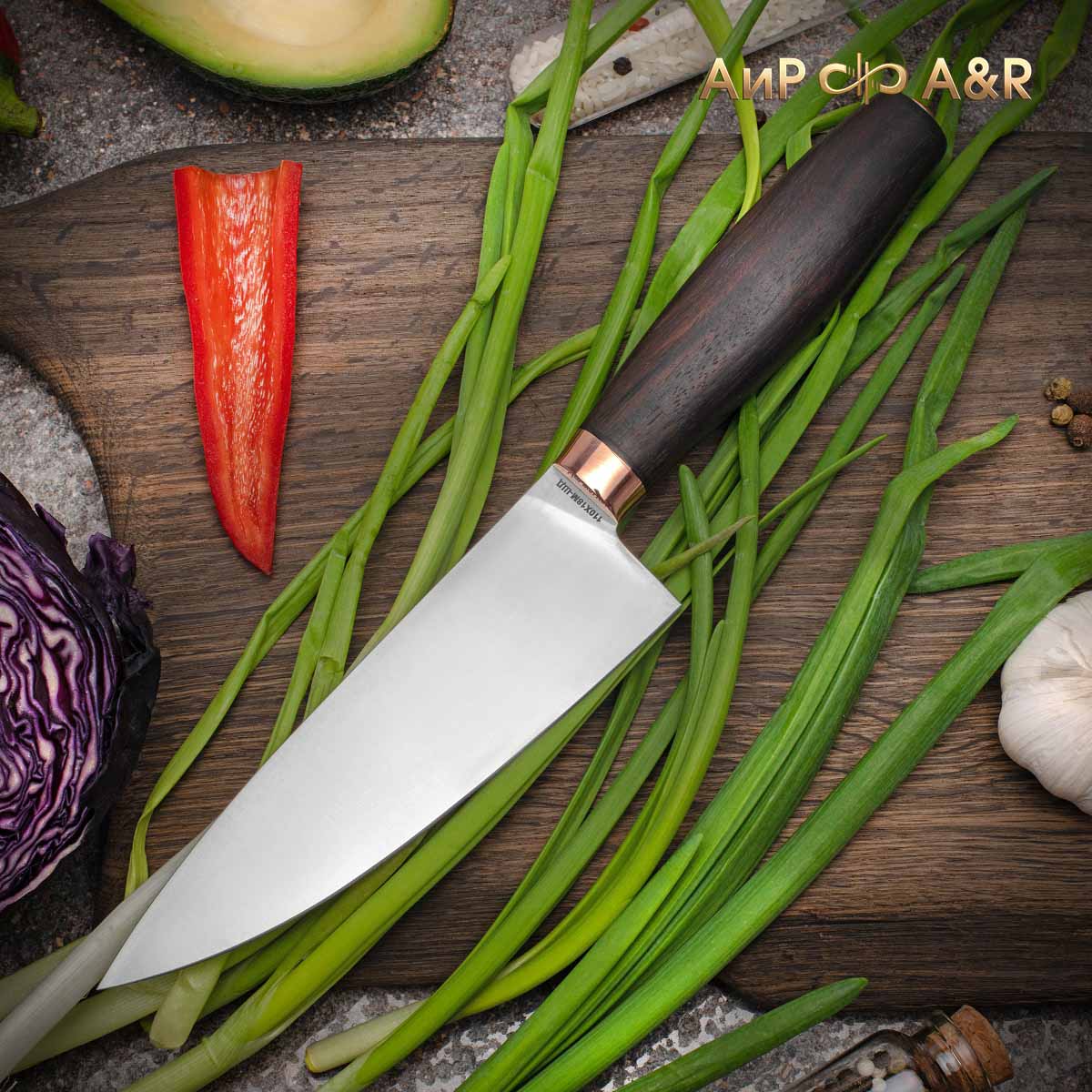 Нож «Шеф» – самый большой и массивный среди кухонных ножей. Данный поварской нож выполнен по типу гюйто (gyuto). Гюйто – это японский аналог поварского ножа, переводится как «коровий меч», т.к. был разработан для разделки говядины. В отличие от европейского шеф-ножа, у гюйто более узкий профиль и более тонкая режущая кромка. Гюйто стал использоваться в японской кухне только в начале XX века, его появление связано с распространением в Японии западной кухни. Клинок имеет прямые спуски, монтаж: сквозной, неразборный.