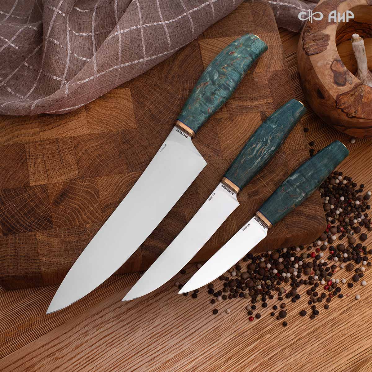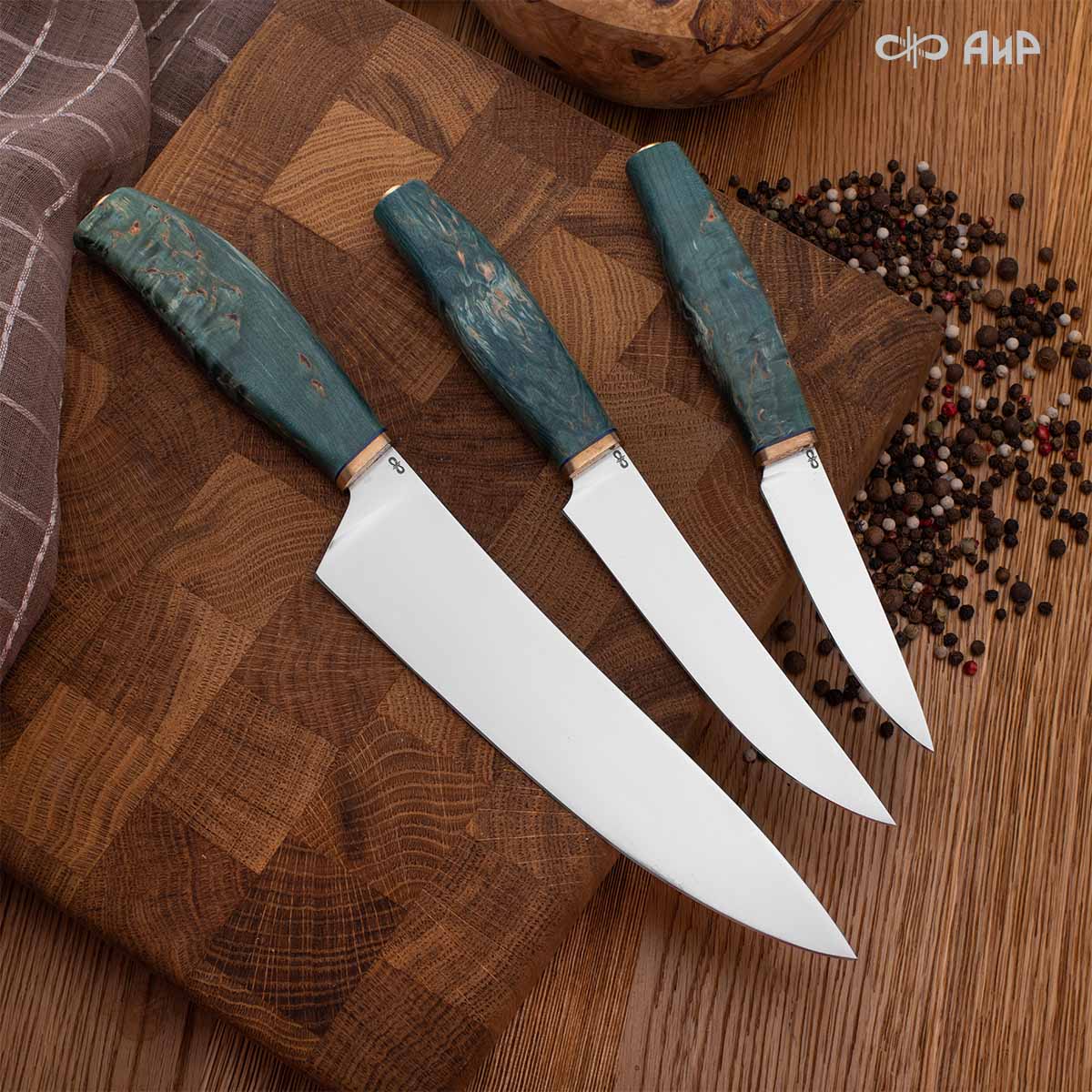 В набор входят следующие ножи: нож "Поварской", нож "Овощной" и нож "Овощной малый". Кастомная заточка