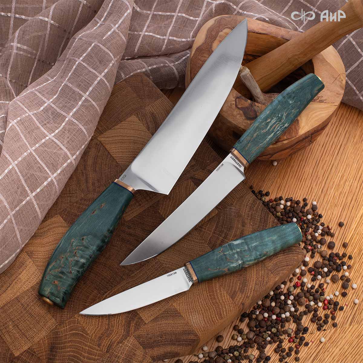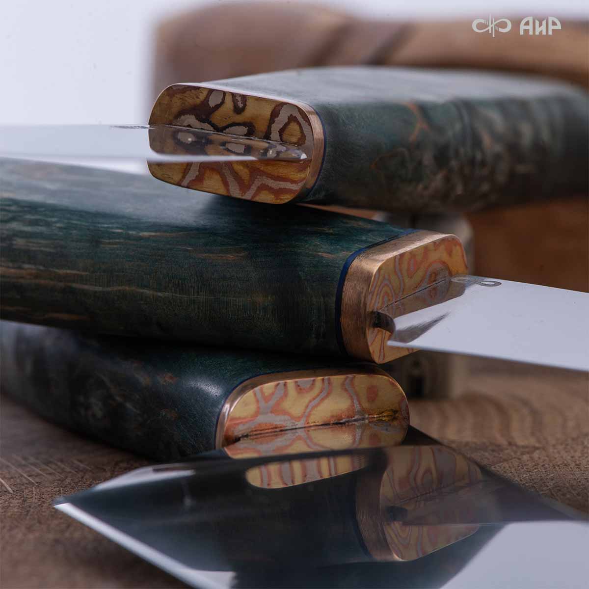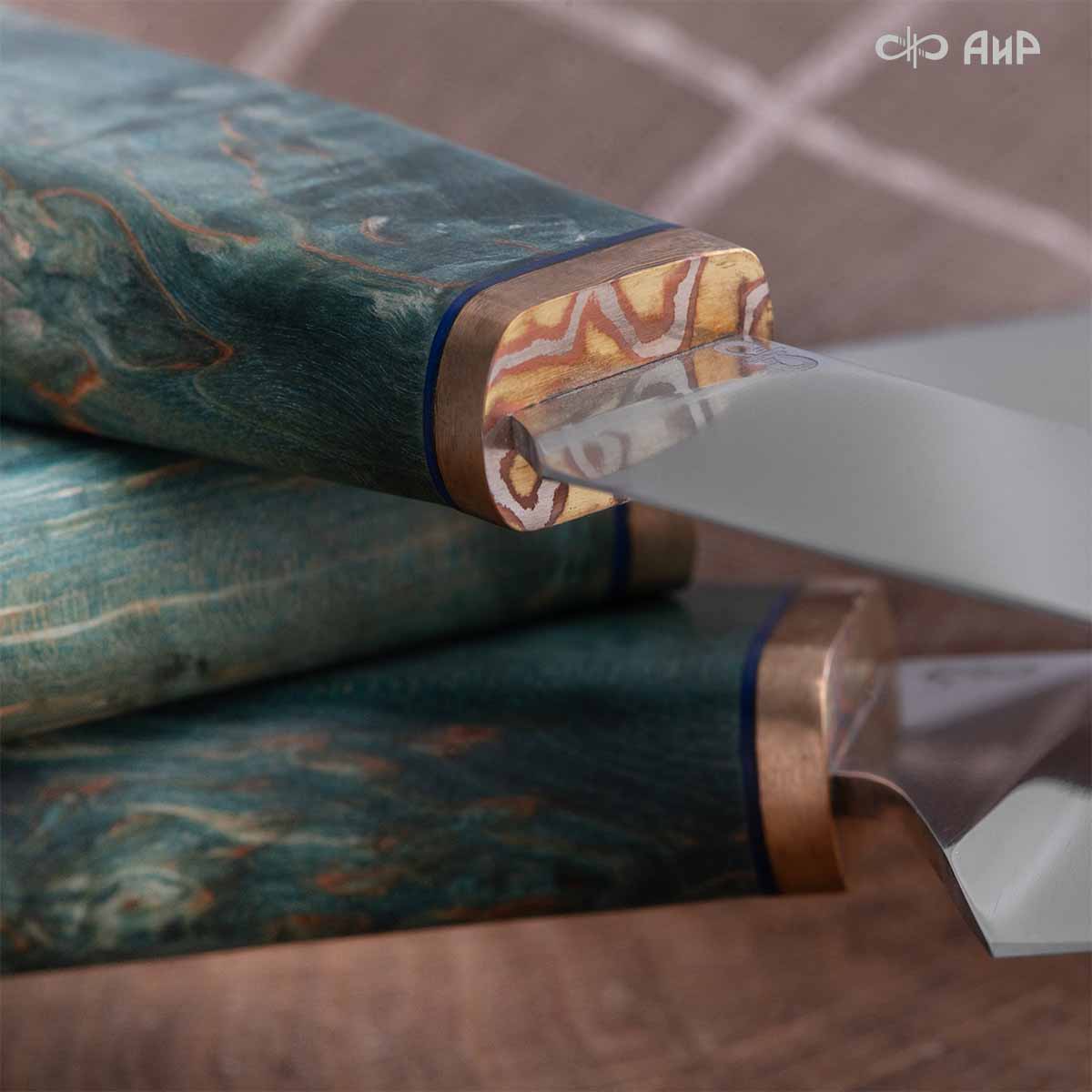 Набор Поварской-3 (стабилизированная карельская береза зеленая, мокуме гане 3 мм)