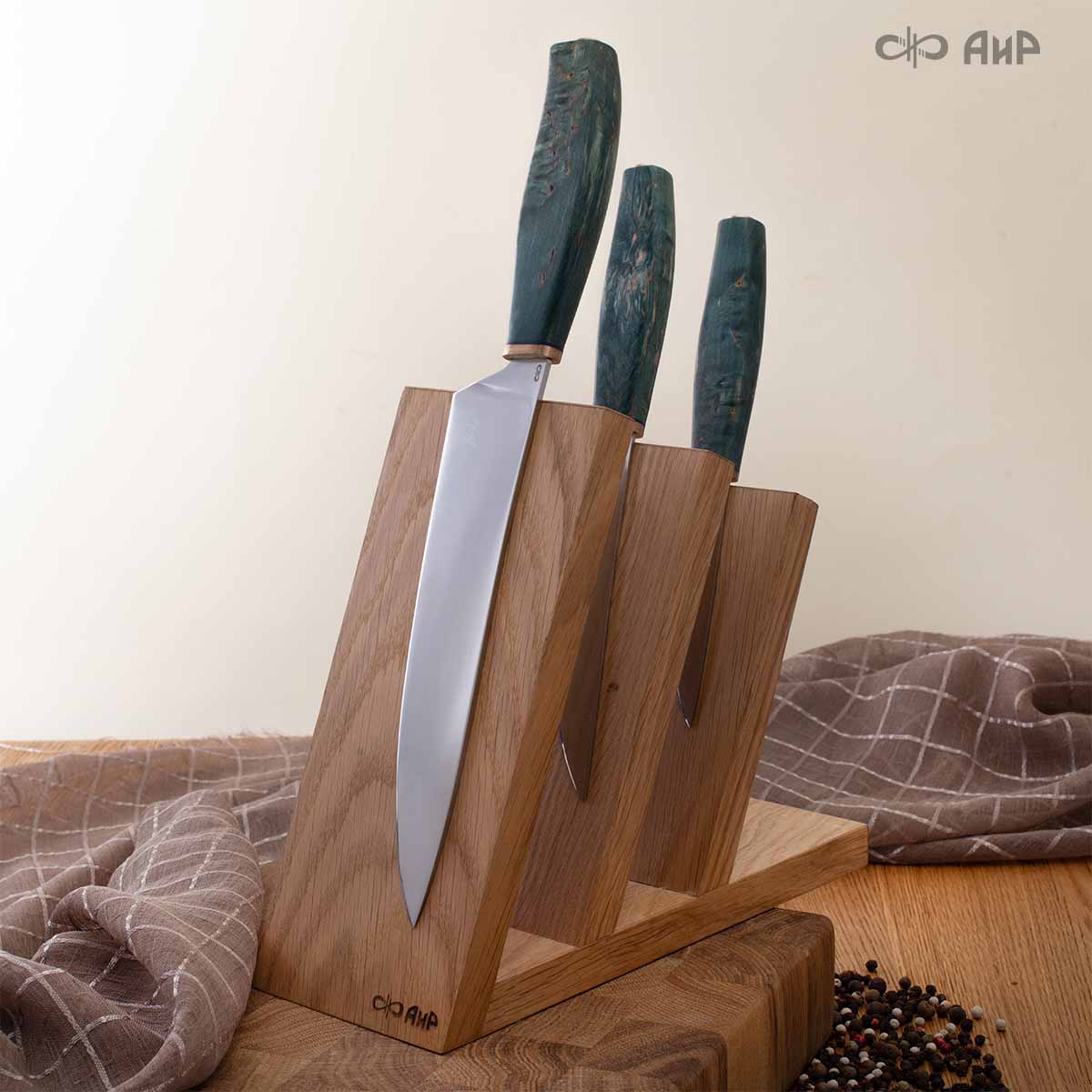 Дополнительно можно приобрести удобную подставку для 3 ножей или деревянные ножны на каждый нож из 3 видов древесины на выбор: бук, орех, береза.