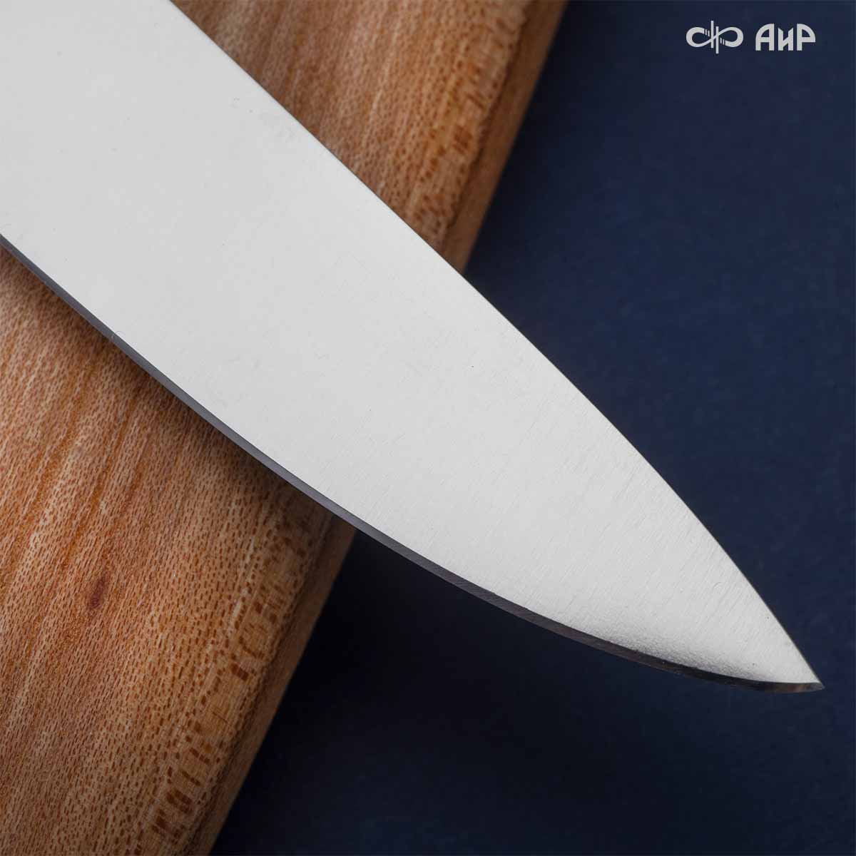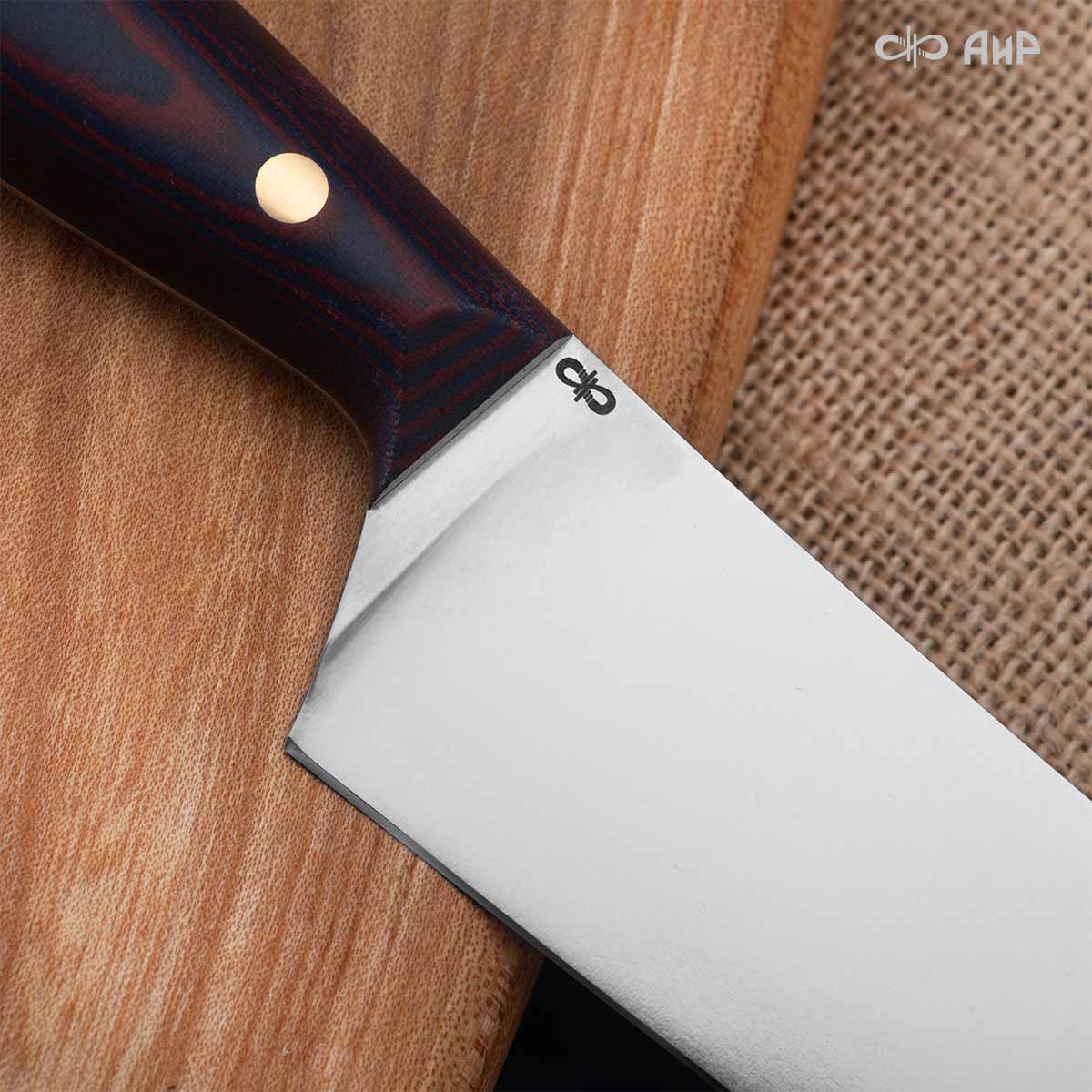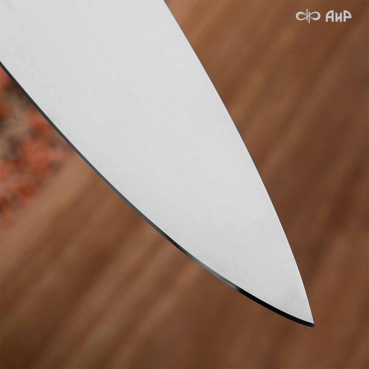 Нож «Шеф большой» – самый большой и массивный среди кухонных ножей. Он имеет широкое лезвие со слегка закругленной режущей кромкой. С его помощью чистят, режут, шинкуют и нарубают крупные овощи, например, капусту. Им же выполняют нарезку мяса, причем обухом можно отбивать мясо. Также его называют «Нож шеф-повара», «Шеф», «Нож повара» или «Французский нож», несмотря на то, что первоначальное его название – «Немецкий нож повара». Нож «Шеф большой» – это нож многоцелевого использования. Клинок имеет прямые спуски. Монтаж рукояти накладной.