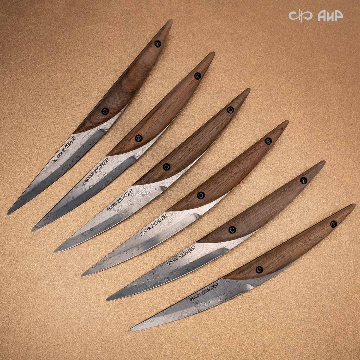 В набор входят 6 цельнометаллических ножей, рукоять - орех, клинок - дамасская сталь ZLADINOX ZDI-1016 производства Компании "АиР". Набор упакован в подарочную коробку из бука, покрытую черным лаком.