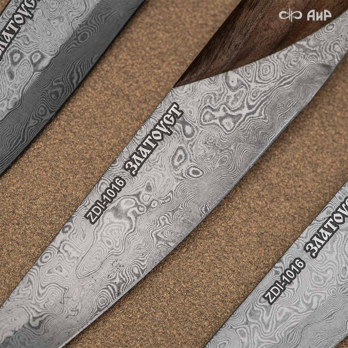 Клинки ножей выполнены из атмосферостойкой композиционной (дамасской) стали Zladinox нашего производства.