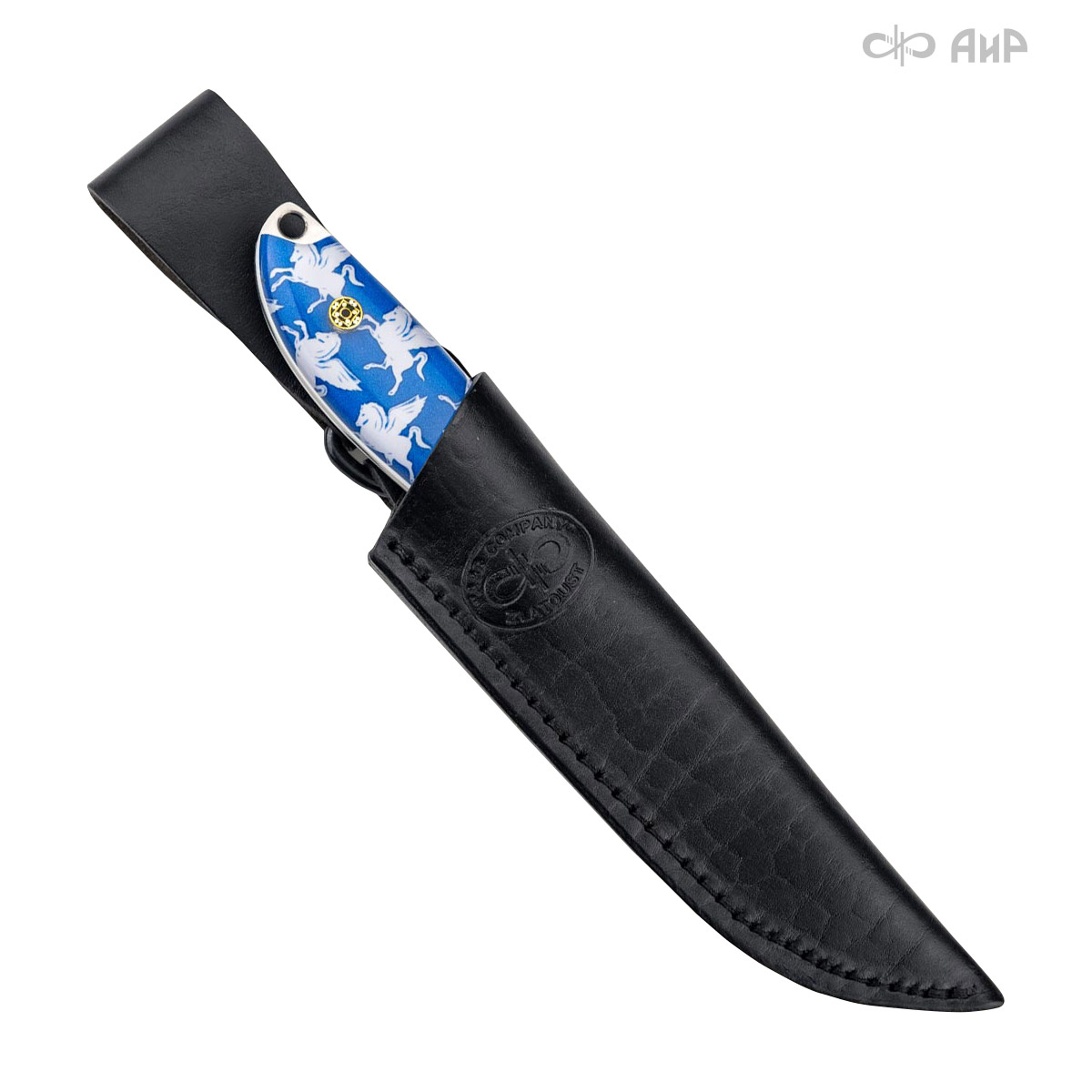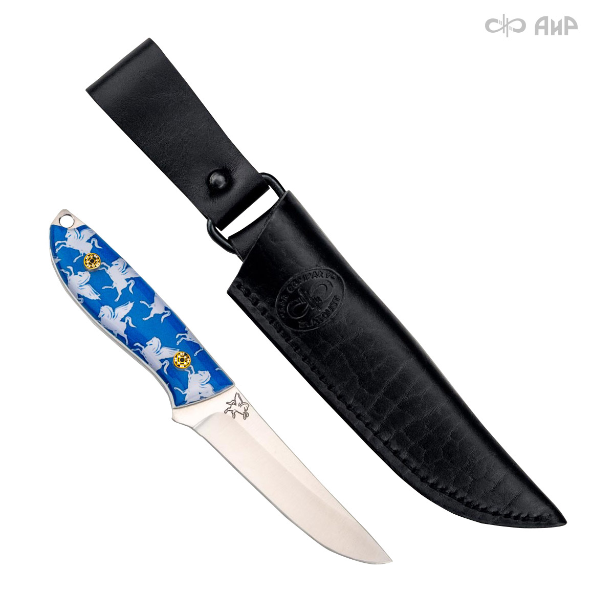 Цельнометаллический нож «Пегасик» сделан с фиксированным клинком и небольшим упором под пальцы (для большей безопасности), с удобной для ребенка рукоятью, украшенной крылатыми конями.