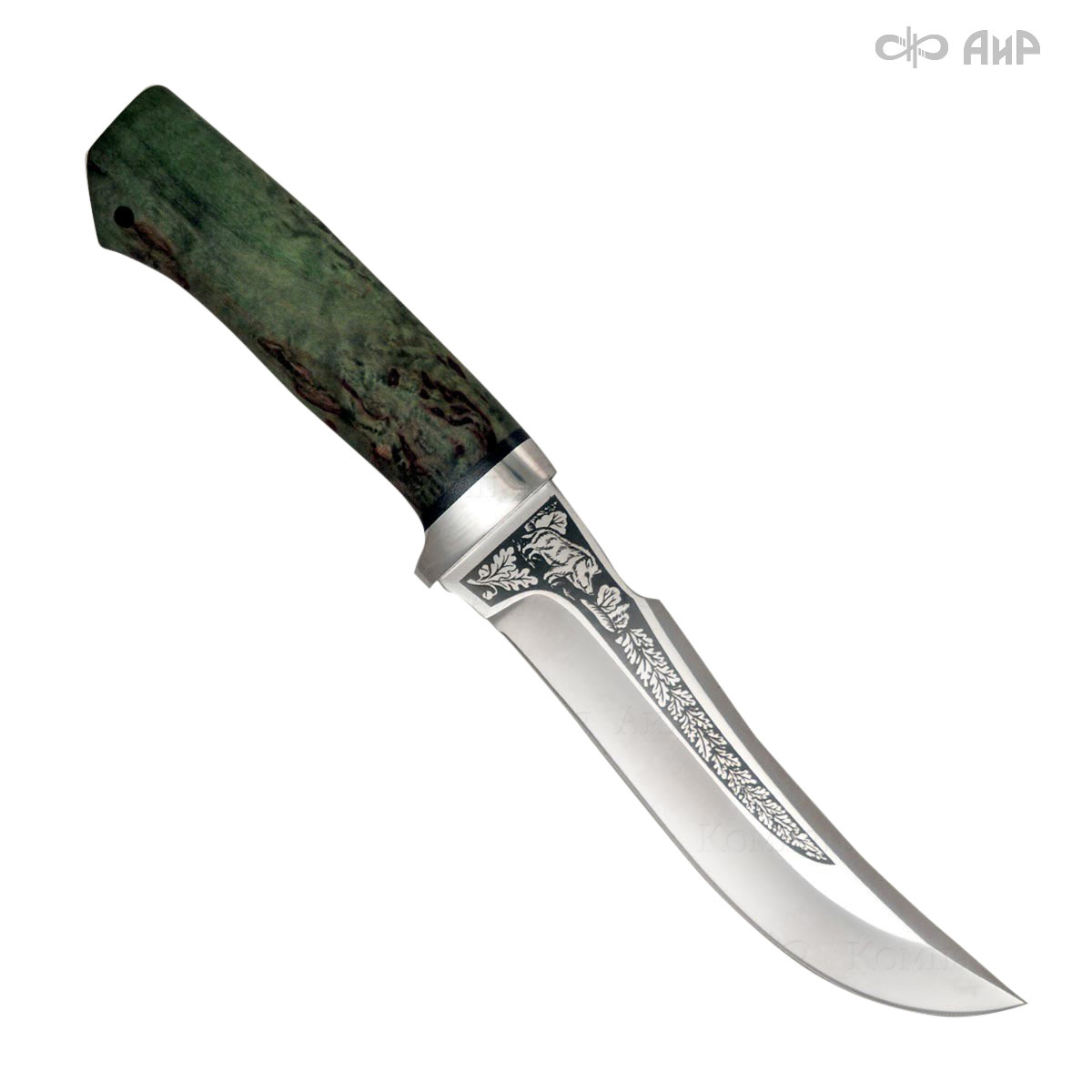 Крупный универсальный, прочный нож с хищным клинком восточного ятаганного вида, имеющим вогнутые линзовидные спуски от середины ширины клинка, образующие тонкое, прекрасно режущее лезвие. Демонстрирует отличные режущие качества. Весьма серьезный инструмент. Клинок толщиной обуха в 3,7 мм имеет прогнутое фальшлезвие на три четверти длины клинка и может быть использован для рубки мелких костей и хрящей. Эргономичная форма рукояти подкупает: она удобна даже для большой руки, уверенно и прочно ложится в любую ладонь. А полноценная гарда не дает соскользнуть пальцам при резах от себя. Монтаж рукояти сквозной, неразборный. На навершии рукояти имеется отверстие под темляк. Отличный выбор для большинства видов работы в лесу.