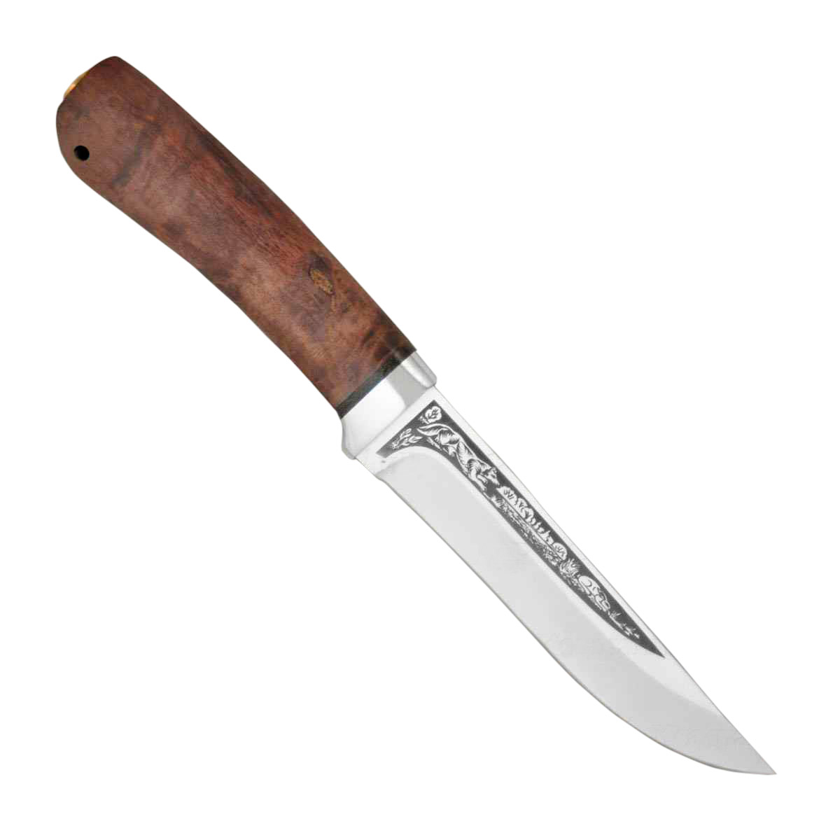 Сравнительно небольшой, универсальный, легкий и прочный нож с клинком, имеющим чуть приспущенный к острию обушок. Спуски в виде линзы на большую часть ширины клинка образуют тонкое, изумительно режущее лезвие. Толщина обуха в 2,6 мм позволяет оставить приличную голомень, что придает ему дополнительную прочность. Рукоятка имеет эргономичную форму, что позволяет пользоваться ножом человеку с любым размером ладони. Гарда умеренной величины защищает пальцы при резе. Монтаж рукояти сквозной, неразборный. На навершии рукояти имеется отверстие под темляк. Великолепное решение для тех, кто любит проводить время на природе и вдали от городской суеты. Пользуется неизменной популярностью у покупателей.