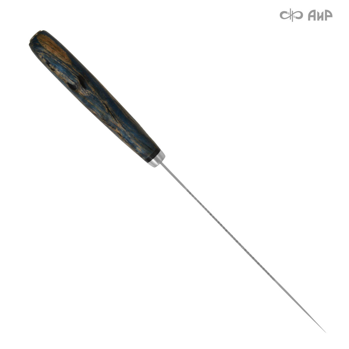 Большой разделочный нож для крупной рыбы с узким клинком и пилообразной заточкой на обухе для чистки чешуи. Клинок толщиной 2 мм имеет прямые спуски, образующие тонкое, прекрасно режущее лезвие. Классическая форма рукояти уверенно и прочно лежит в любой ладони. А оптимальной величины гарда не дает соскользнуть пальцам при резах от себя. Монтаж рукояти сквозной, неразборный. Отличный выбор для разделки крупной рыбы.