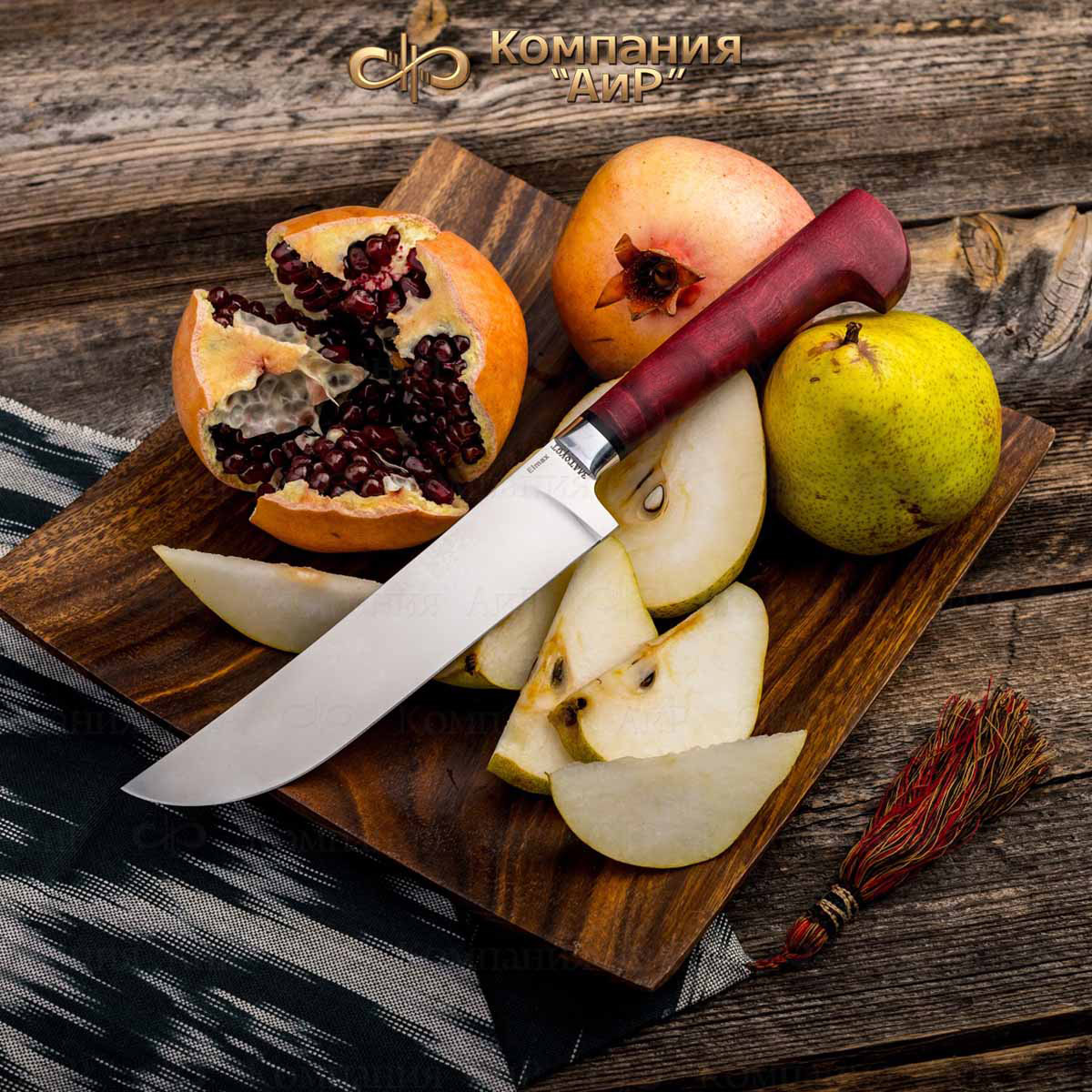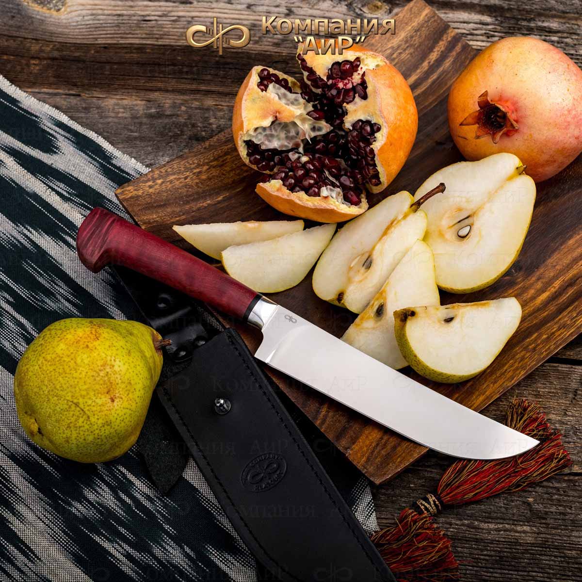 Пчак (от узб. pichoq – нож) – традиционный узбекский нож. Отличительная особенность пчаков – это клинообразный в сечении, достаточно широкий клинок (значительно шире рукояти), рукоять, продолжающая линию обуха и соединяющаяся с клинком посредством больстера. Клинок может изготавливаться из различных сталей, как нержавеющей, так и дамасской. Форма острия у Пчака от Компании «АиР» называется «тугри» – то есть с прямым обухом. Рукоять достаточно узкая, ее головка имеет клювообразный изгиб – чакмок. Монтаж рукояти сквозной, неразборный.