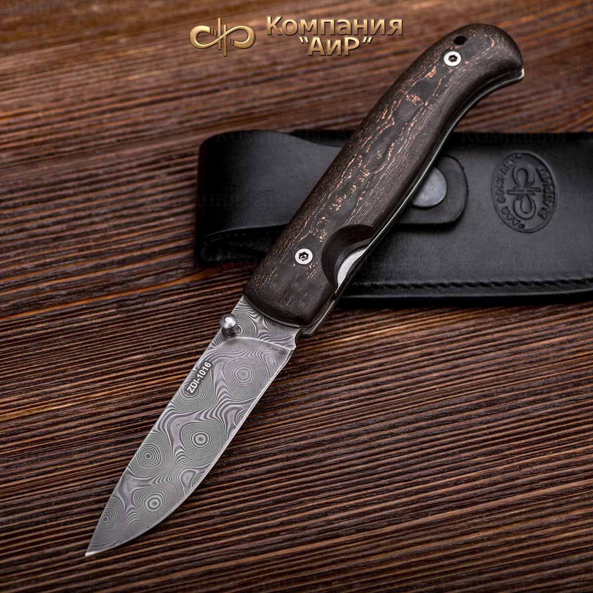 Складной нож с фиксатором удобен для повседневного ношения и использования. Клинок с прямыми спусками от обуха. Классический ручной механизм раскрытия/складывания лезвия имеет жесткий пружинный фиксатор. Монтаж рукояти накладной. Болты, стягивающие накладки рукояти, открыты, не спрятаны пинами, при необходимости их можно раскрутить и собрать заново. Довольно длинная рукоять удобно лежит в любой, даже крупной, ладони. Клеймо с логотипом «АиР» нанесено на обух, а не на традиционную пяту клинка ножа. За счет крайне надежного фиксатора такой складной нож прослужит долго и верно.