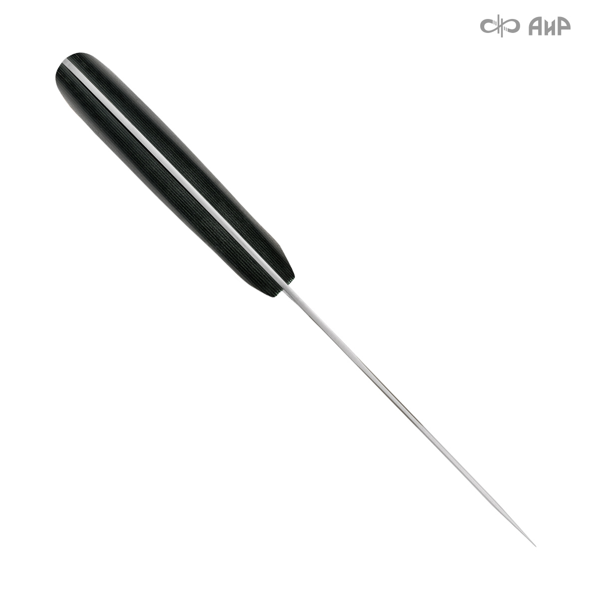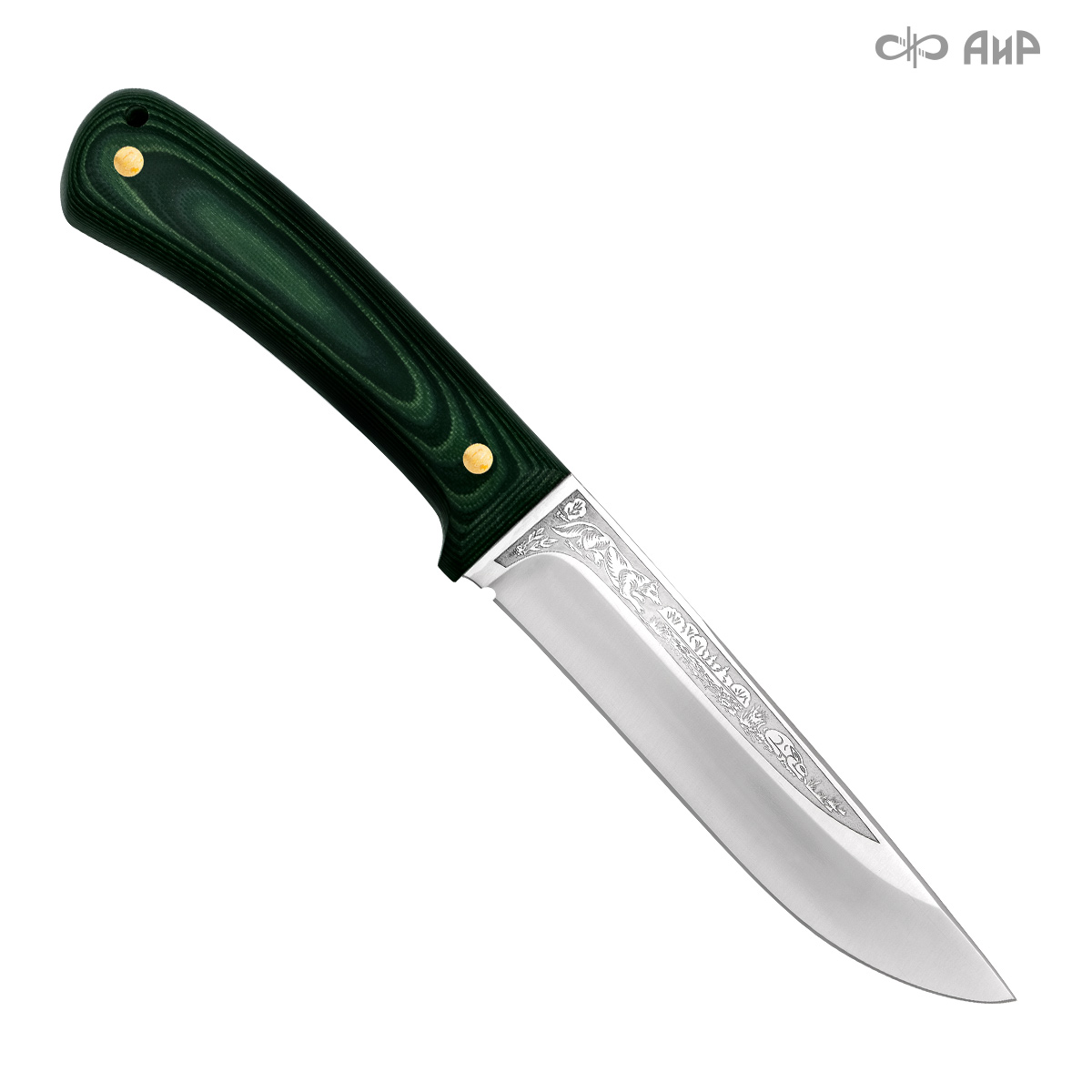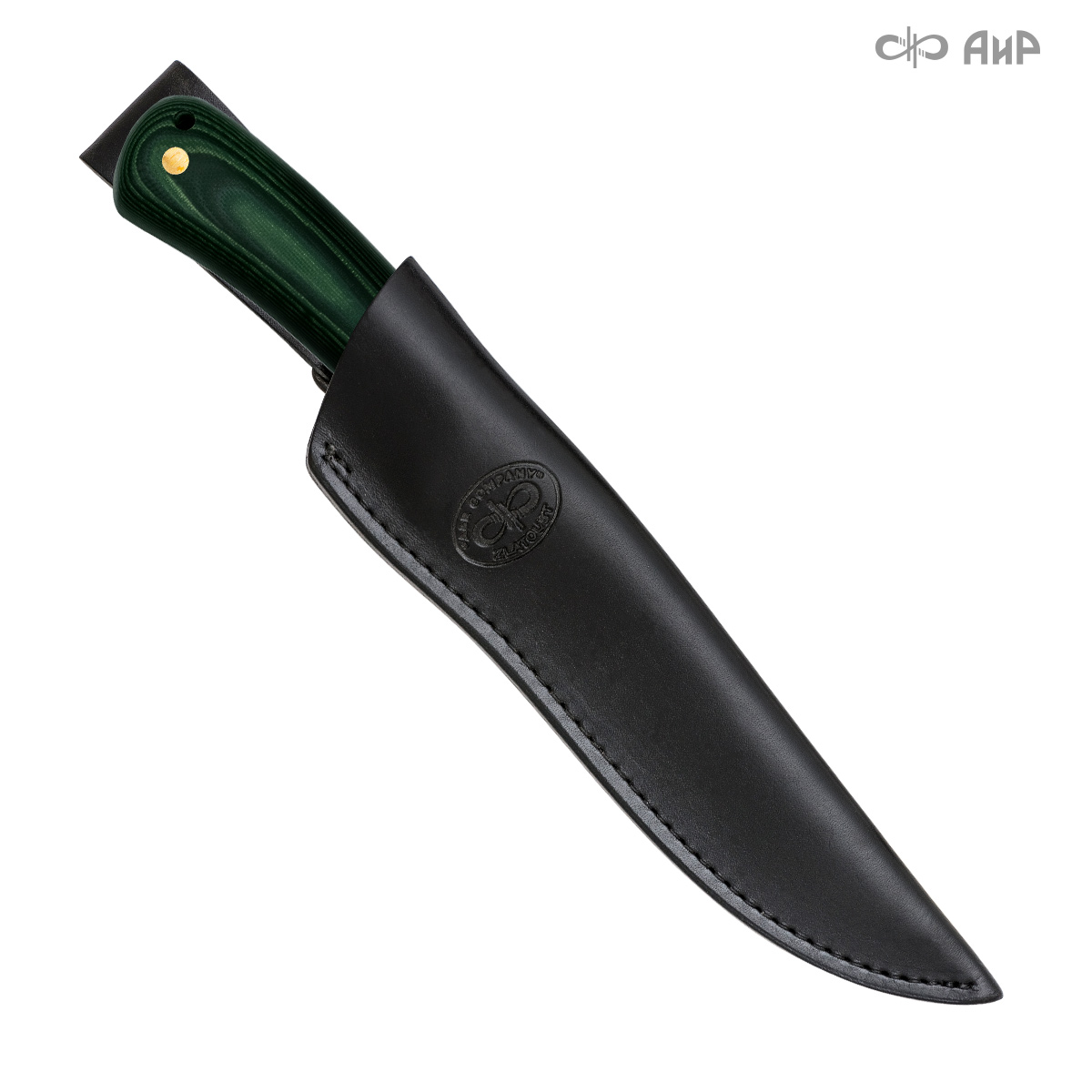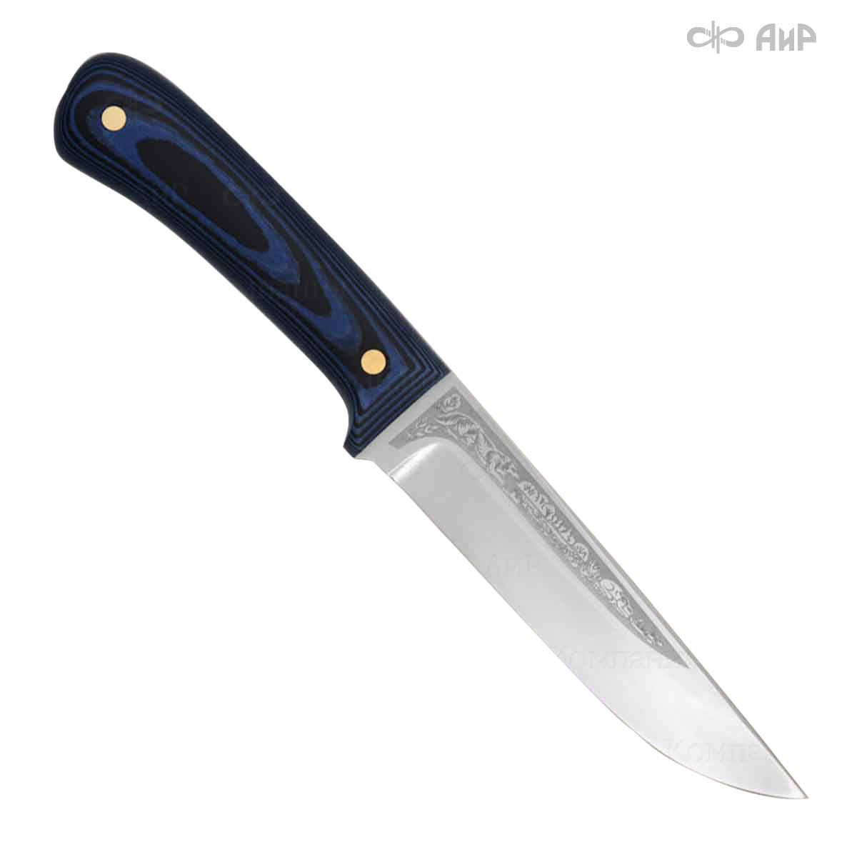 Сравнительно небольшой, универсальный легкий и прочный нож с клинком, имеющим чуть приспущенный к острию обушок. Спуски в виде линзы на большую часть ширины клинка образуют тонкое, изумительно режущее лезвие. Толщина обуха в 2,6 мм позволяет оставить приличную голомень, что придает ему дополнительную прочность. Рукоятка имеет эргономичную форму, что позволяет пользоваться ножом человеку с любым размером ладони. Гарда умеренной величины защищает пальцы при резе. Монтаж рукояти накладной, неразборный. Великолепное решение для тех, кто любит проводить время на природе и вдали от городской суеты. Пользуется неизменной популярностью у покупателей.