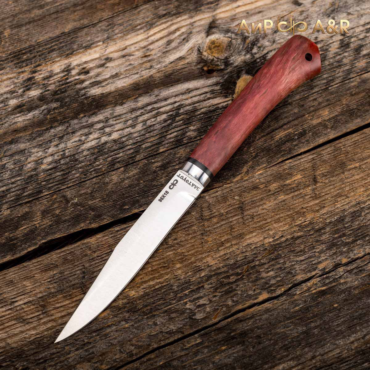 Небольшой универсальный и очень легкий нож с узким клинком классической формы заслуженно пользуется популярностью у приверженцев активного отдыха. Клинок имеет вогнутые линзовидные спуски от половины ширины клинка. При толщине обуха в 2 мм клинок имеет неширокую пяту. Ножом легко не только освежевать трофей, ошкурить, выпотрошить, разделать тушку, но и приготовить в лагере праздничный ужин. Удобная форма рукояти позволяет уверенно работать с мелкими трофеями, а сквозной (неразборный) монтаж придает ножу хорошую прочность. На навершии рукояти имеется отверстие под темляк. Прекрасный нож для разделки мелкого пушного зверя, боровой и водоплавающей дичи, а также рыбы.