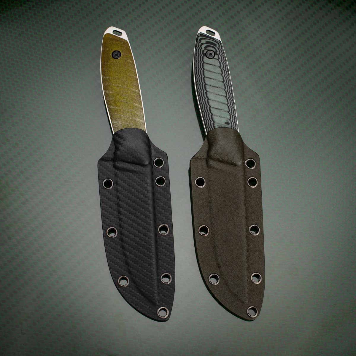 Ножи из линейки «ТЕХНО» (Жулан-Т, Леший-Т, Стриж-Т, Ронин-Т) стандартно комплектуются практичными кайдексовыми ножнами. При желании, заказчики могут заменить кайдексовые ножны на ножны из хольстекс карбона (с доплатой) и дополнительно заказать крепление Tek-Lok для ножен.