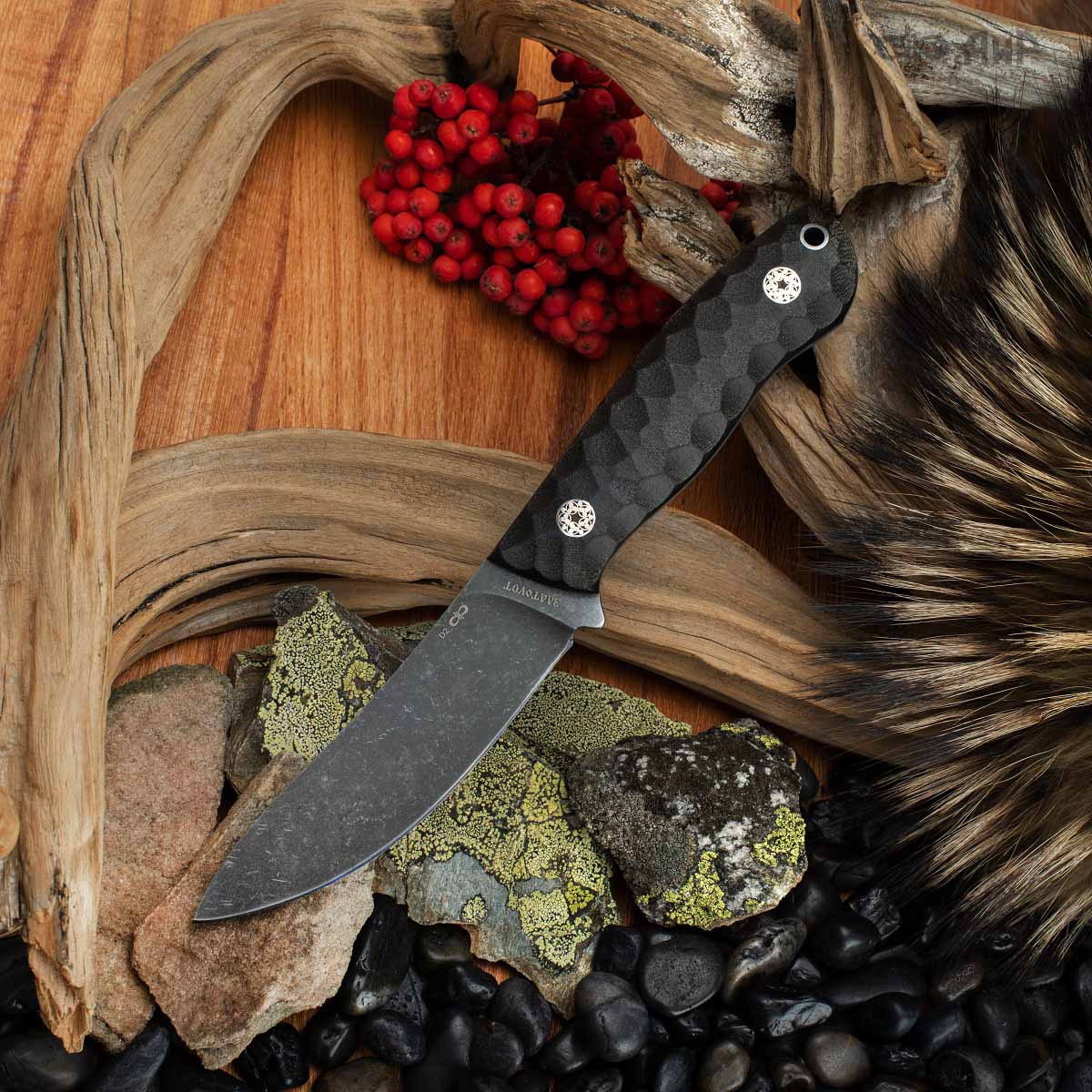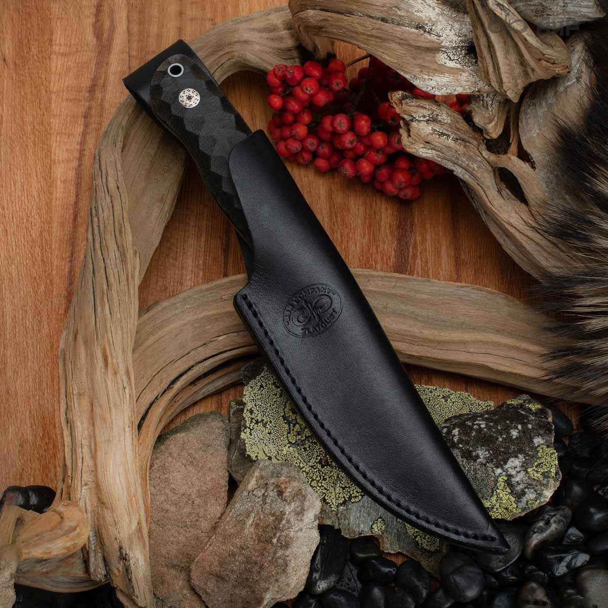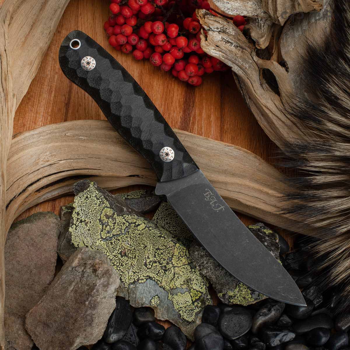 Красивый и удобный малый разделочный нож с клинком, имеющим прямые спуски от обуха, образующие тонкое, прекрасно режущее лезвие. Демонстрирует отличные режущие качества. Форма клинка, типичная для скинера, позволяет снимать шкуру разделываемого животного, без риска при этом повредить брюшину. Клинок имеет длину 89 мм и толщину обуха 3,4 мм. Рукоять удобно ложится практически в любую ладонь. Монтаж рукояти накладной, неразборный. Отличный выбор для разделочных работ на охоте и на ферме.