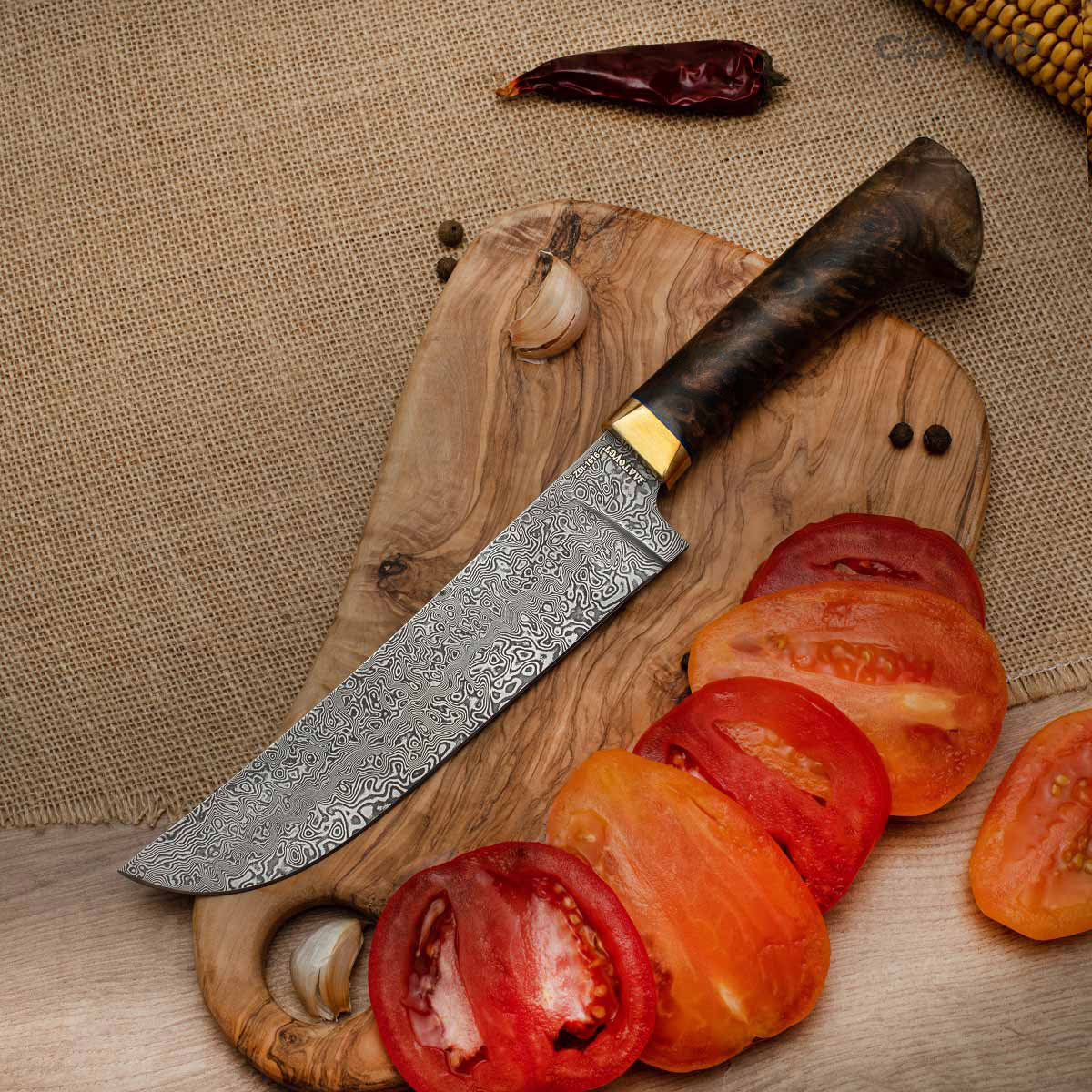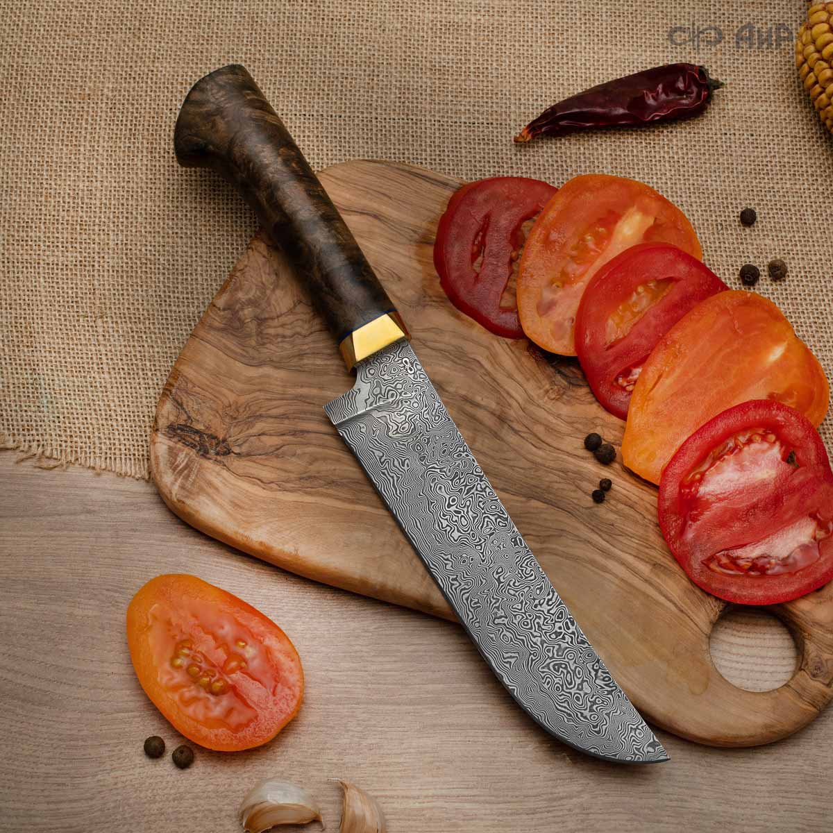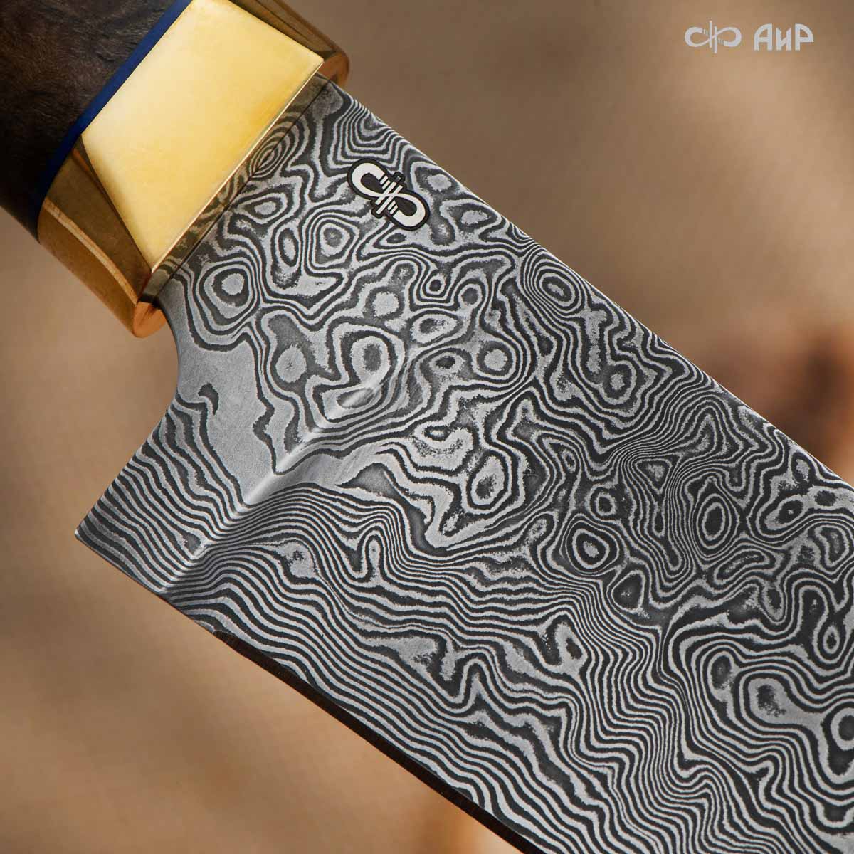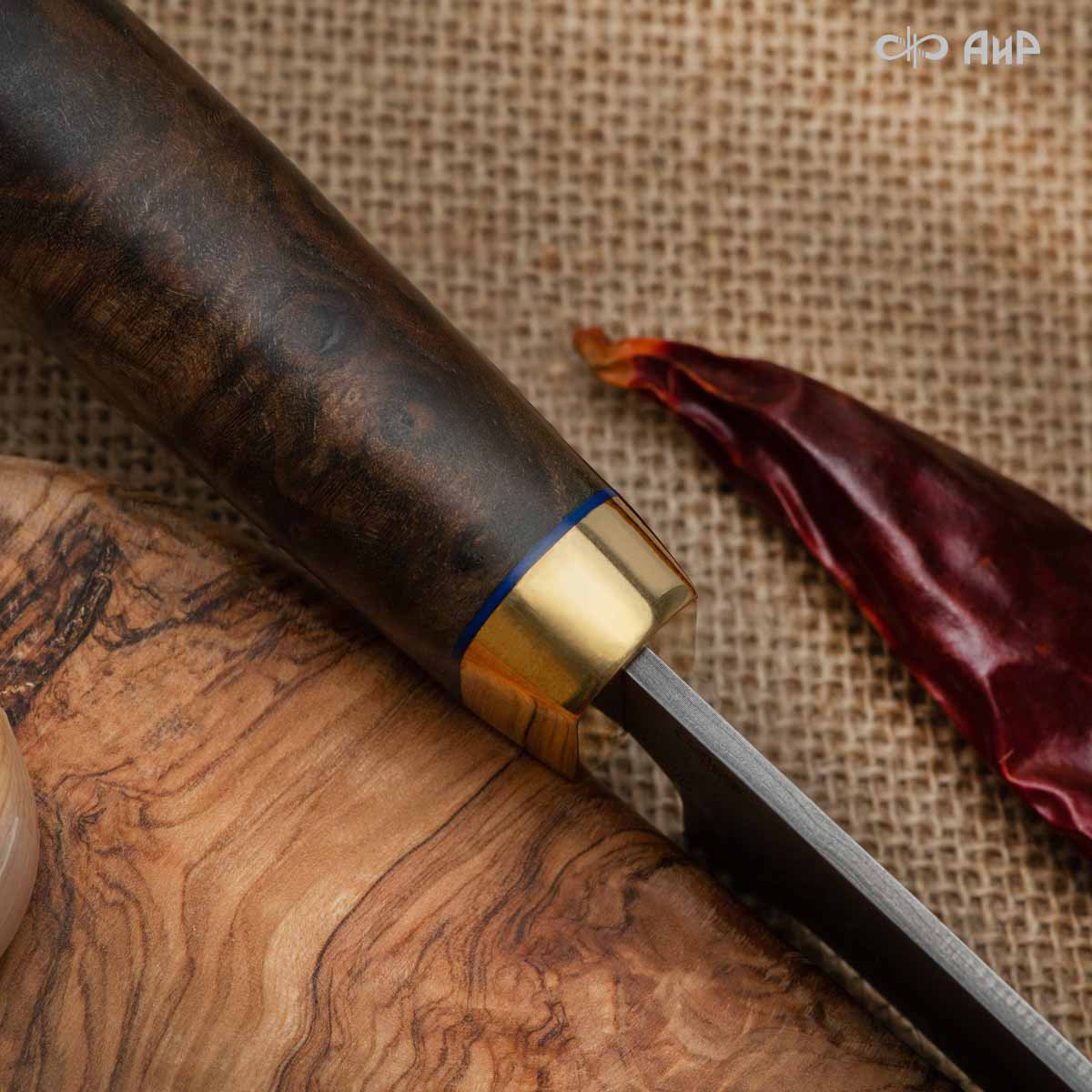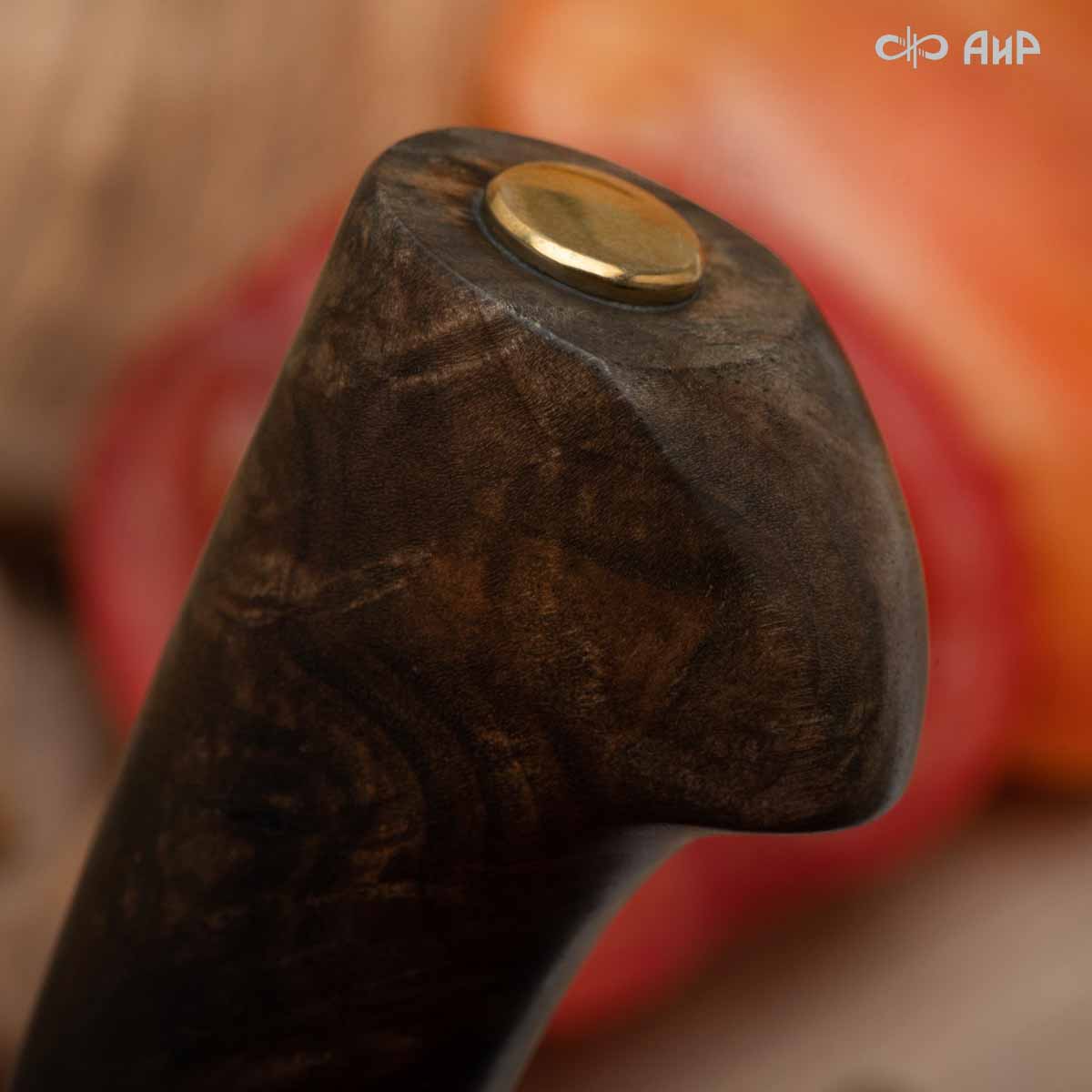 Пчак (стабилизированный ореховый кап, латунь, фибра) дамасская сталь ZDI-1016