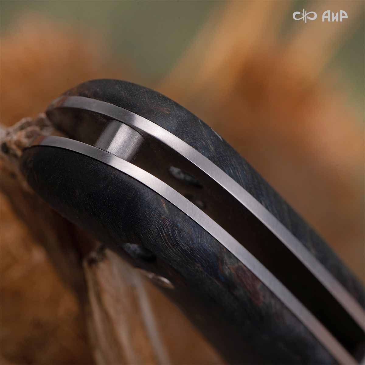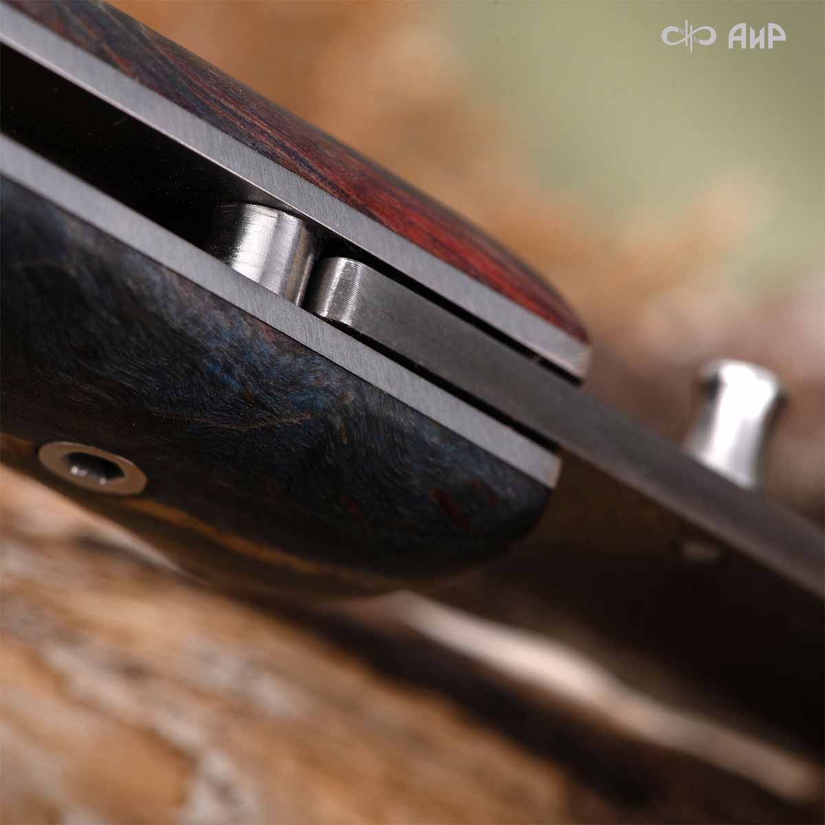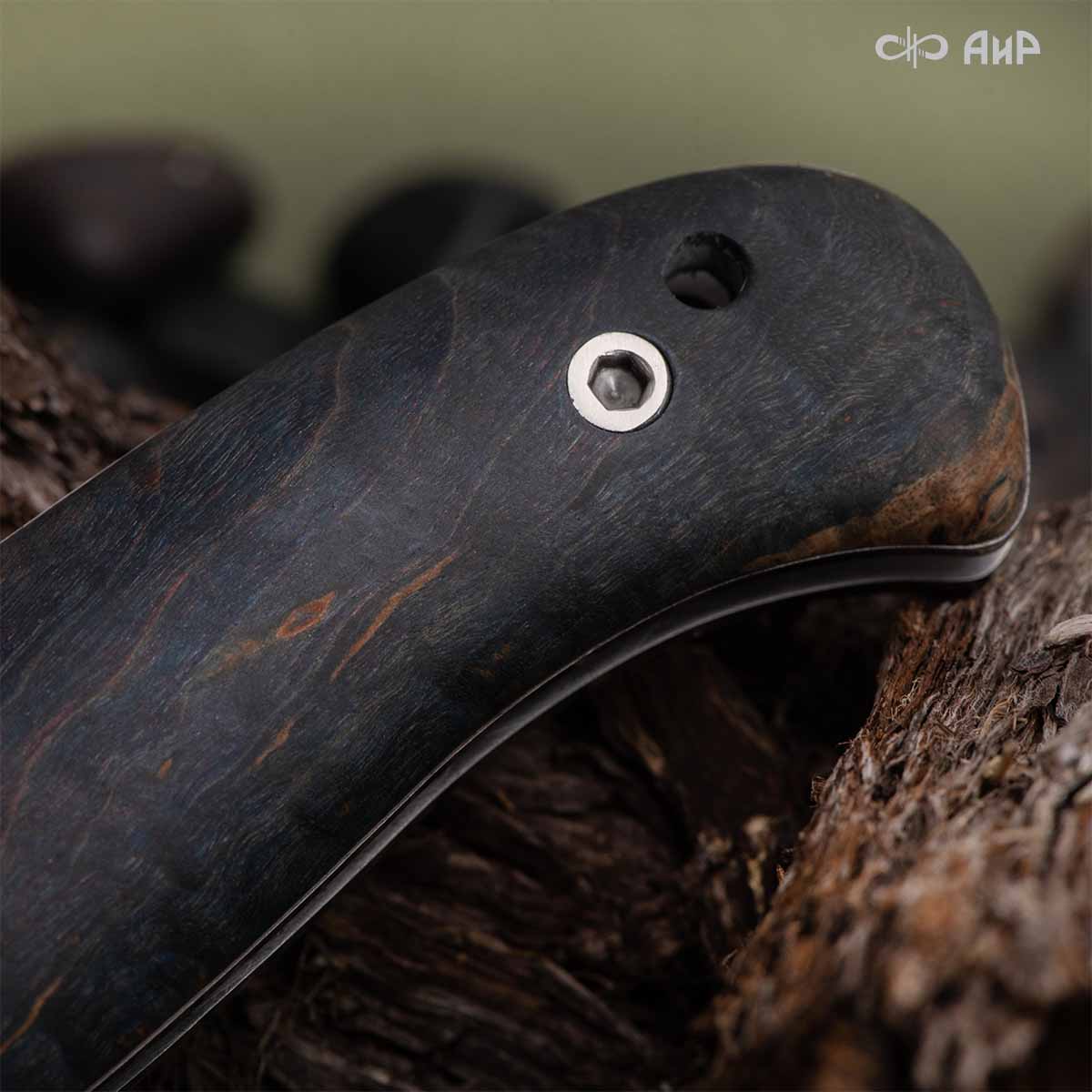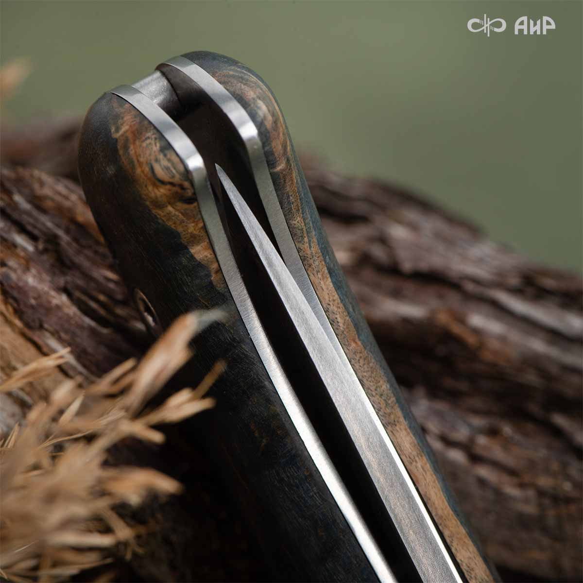 Складной нож с фиксатором удобен для повседневного ношения и использования. Клинок с прямыми спусками от обуха. Классический ручной механизм раскрытия/складывания лезвия имеет жесткий пружинный фиксатор. Монтаж рукояти накладной. Болты, стягивающие накладки рукояти, открыты, не спрятаны пинами, при необходимости их можно раскрутить и собрать заново. Довольно длинная рукоять удобно лежит в любой, даже крупной, ладони. Клеймо с логотипом «АиР» нанесено на обух, а не на традиционную пяту клинка ножа. За счет крайне надежного фиксатора такой складной нож прослужит долго и верно.