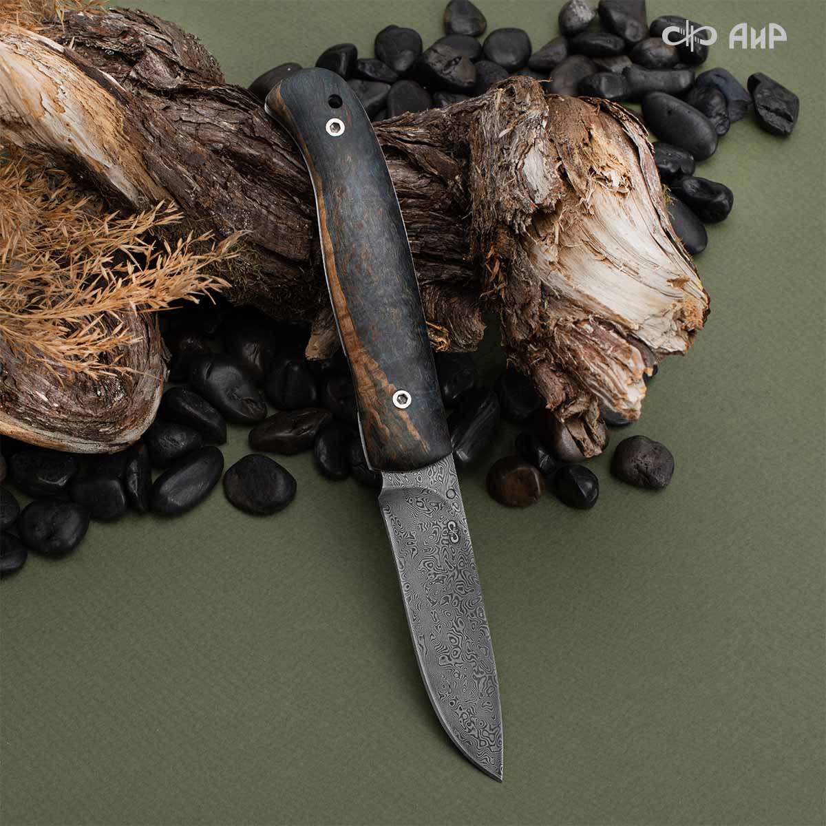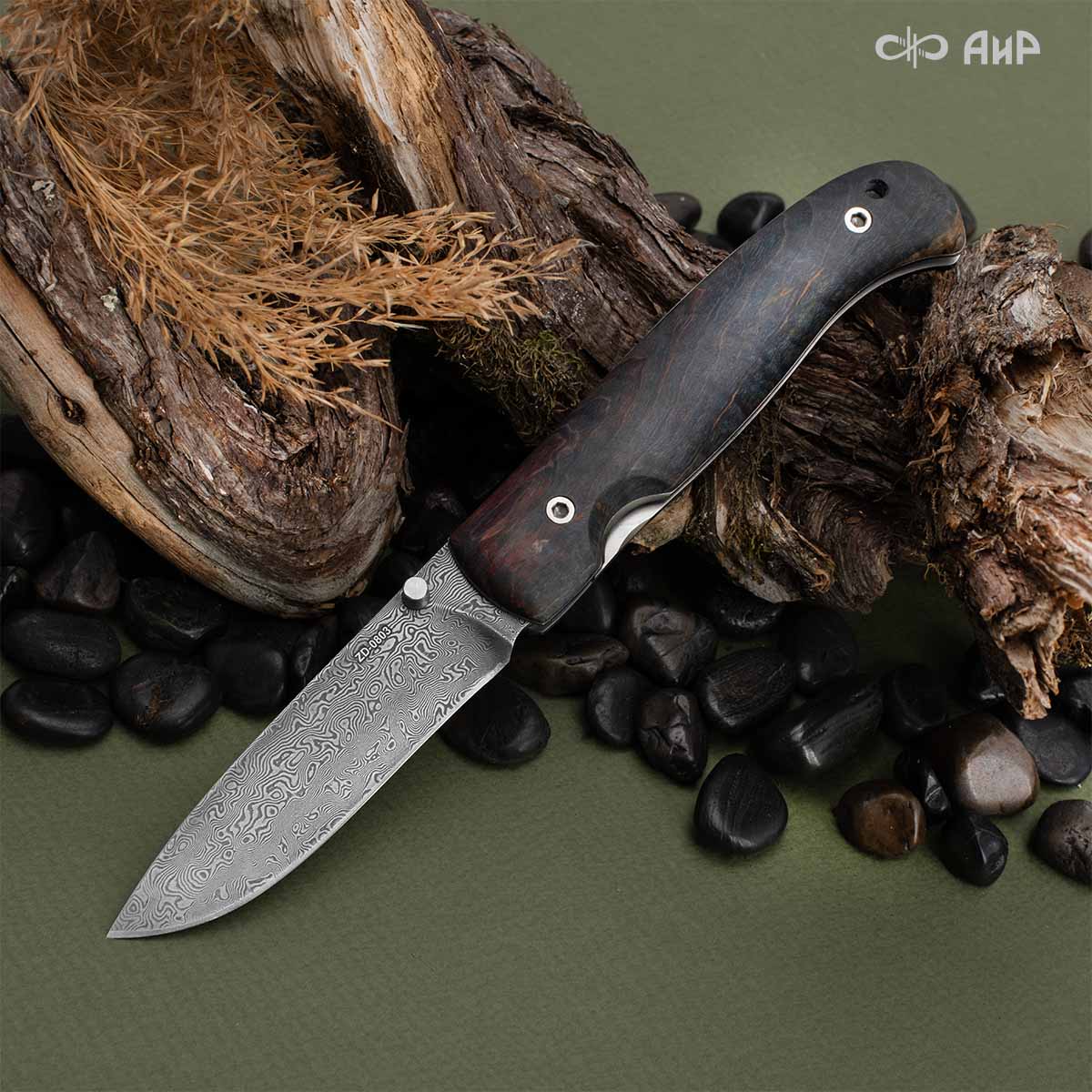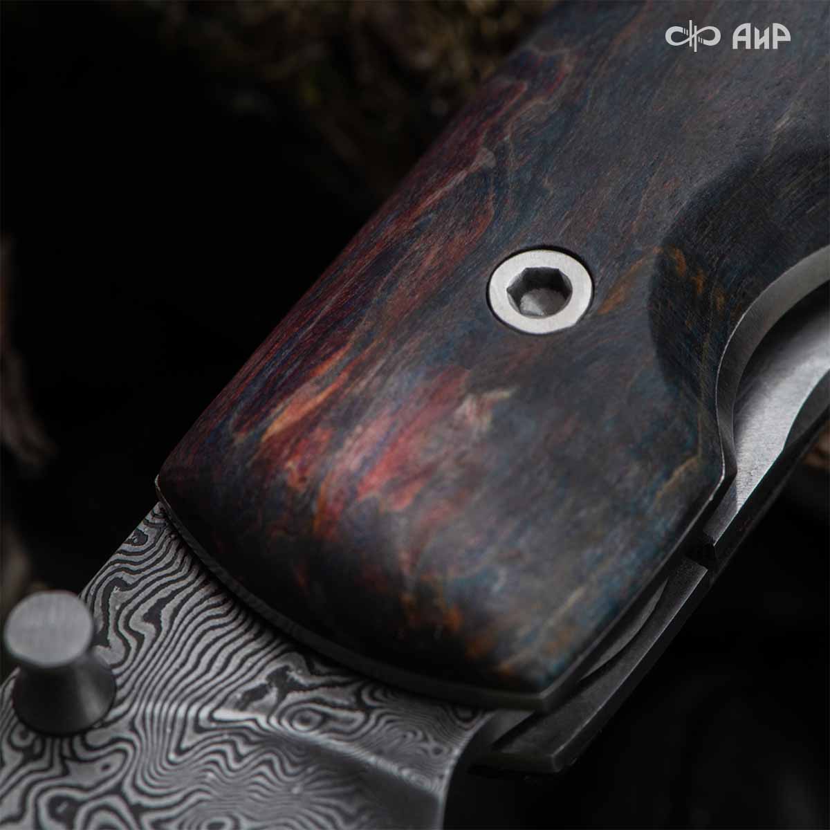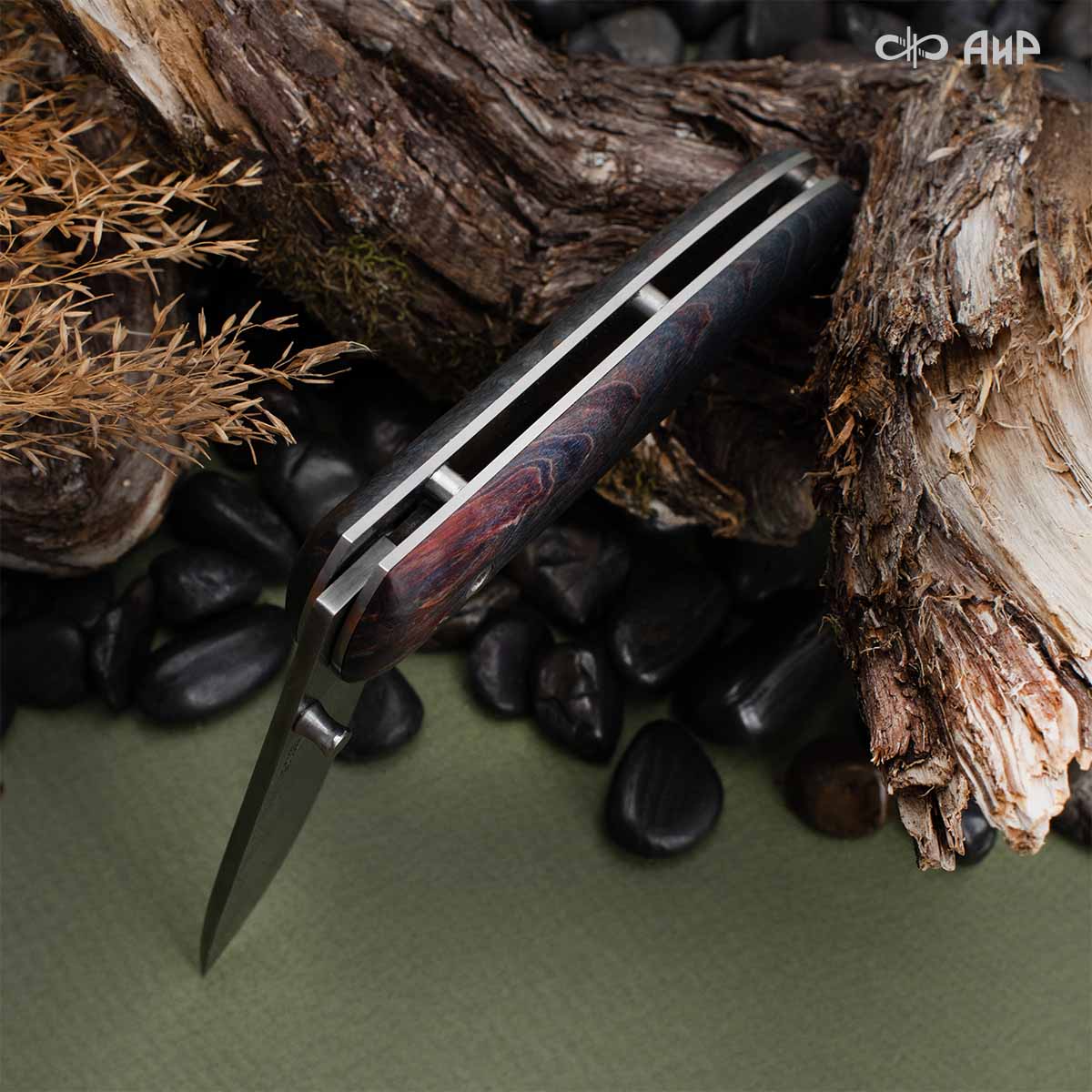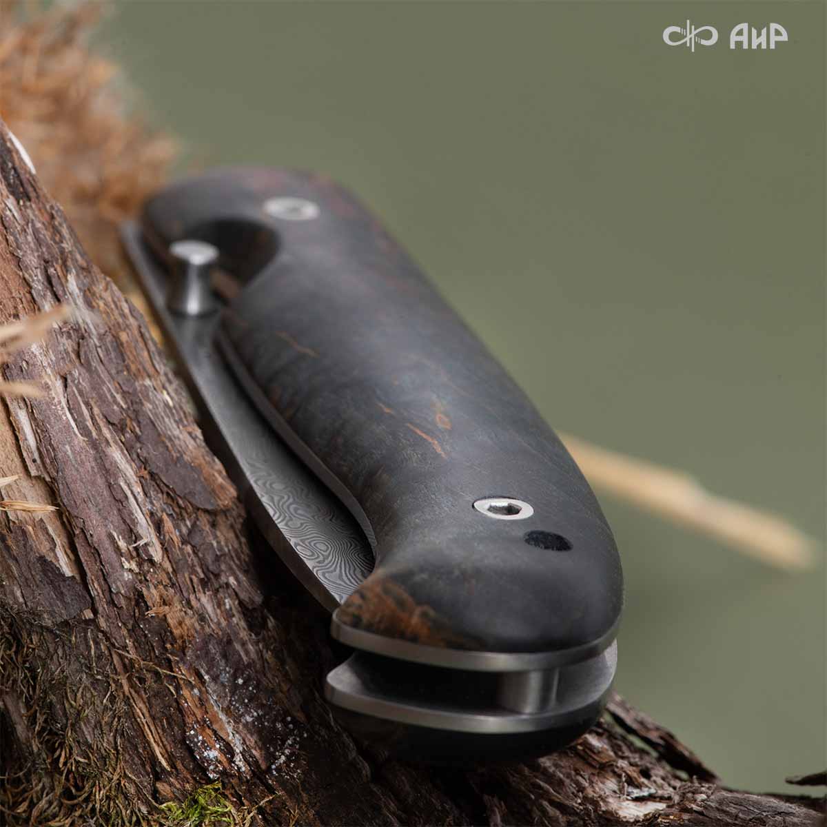 Складной нож с фиксатором удобен для повседневного ношения и использования. Клинок с прямыми спусками от обуха. Классический ручной механизм раскрытия/складывания лезвия имеет жесткий пружинный фиксатор. Монтаж рукояти накладной. Болты, стягивающие накладки рукояти, открыты, не спрятаны пинами, при необходимости их можно раскрутить и собрать заново. Довольно длинная рукоять удобно лежит в любой, даже крупной, ладони. Клеймо с логотипом «АиР» нанесено на обух, а не на традиционную пяту клинка ножа. За счет крайне надежного фиксатора такой складной нож прослужит долго и верно.