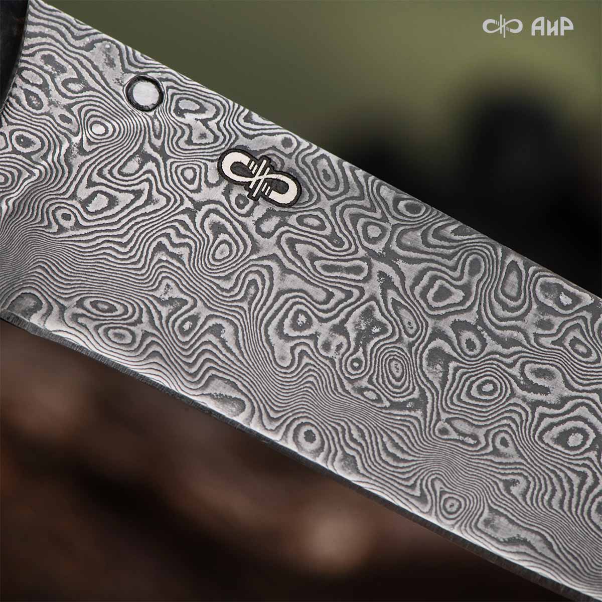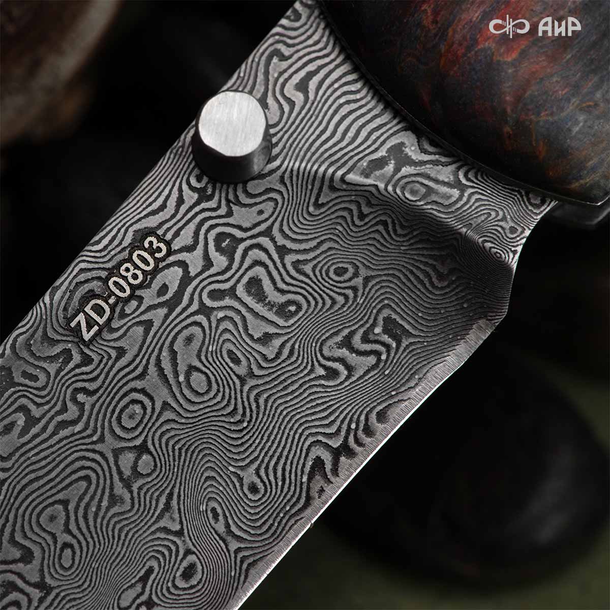 Клинок из композиционной (дамасской) стали производства Компании "АиР" ZD-0803 (ZLAtoust+Damast, 08 – среднее содержание углерода 0,8%, 03 – среднее содержание легирующих элементов (хром, никель, молибден, ванадий и т.д.).