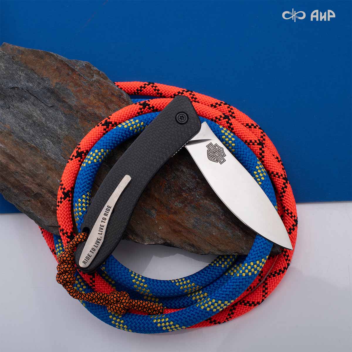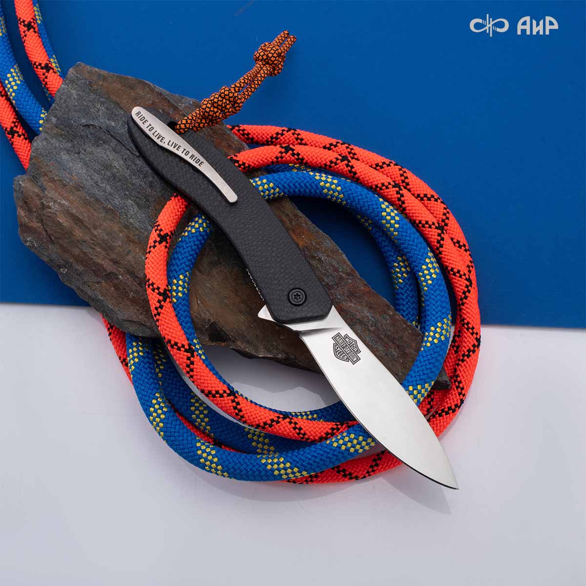 Форму клинка «Хантер» унаследовал от «Канадского малого (траппера)» – каплевидный клинок с прямыми спусками от обуха, который демонстрирует эффективность как в резе, так и в уколе. Клинок из нержавеющей стали стандартно выполняется с полировкой «сатин». Примечательно, что логотип производителя и марка стали нанесены на обух ножа, они видны даже в закрытом положении.