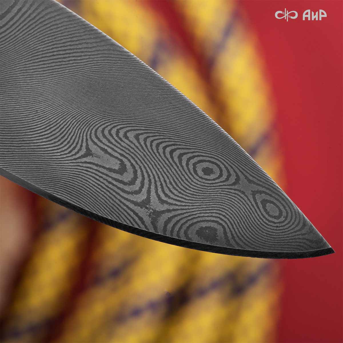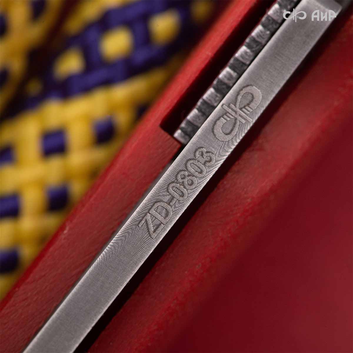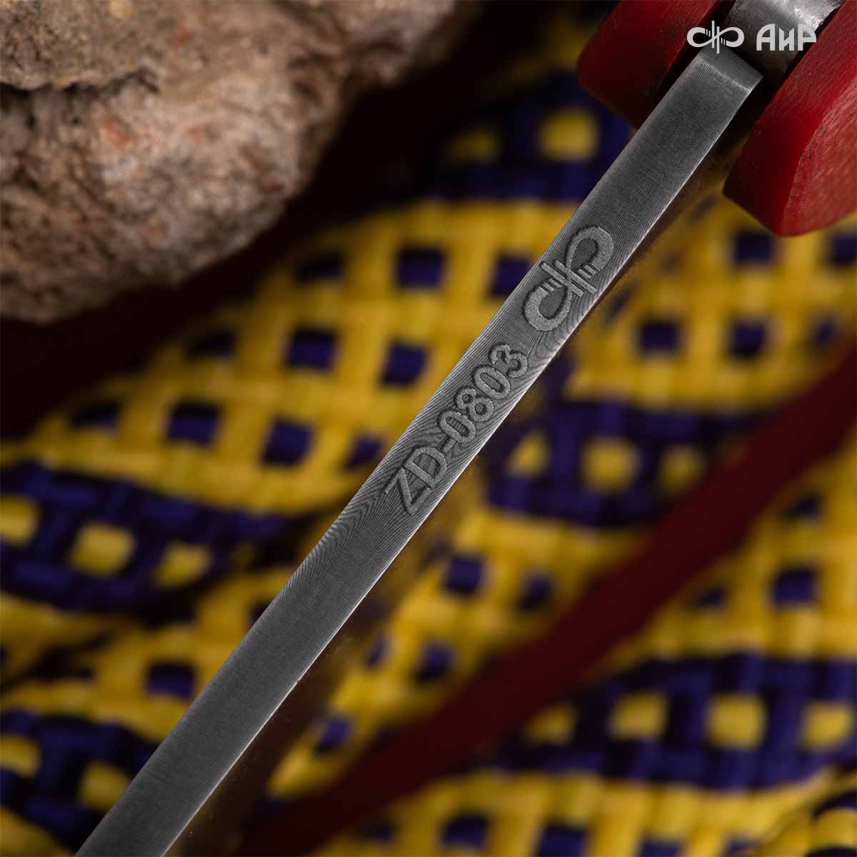 Клинок из композиционной (дамасской) стали производства Компании "АиР" ZD-0803 (ZLAtoust+Damast, 08 – среднее содержание углерода 0,8%, 03 – среднее содержание легирующих элементов (хром, никель, молибден, ванадий и т.д.).