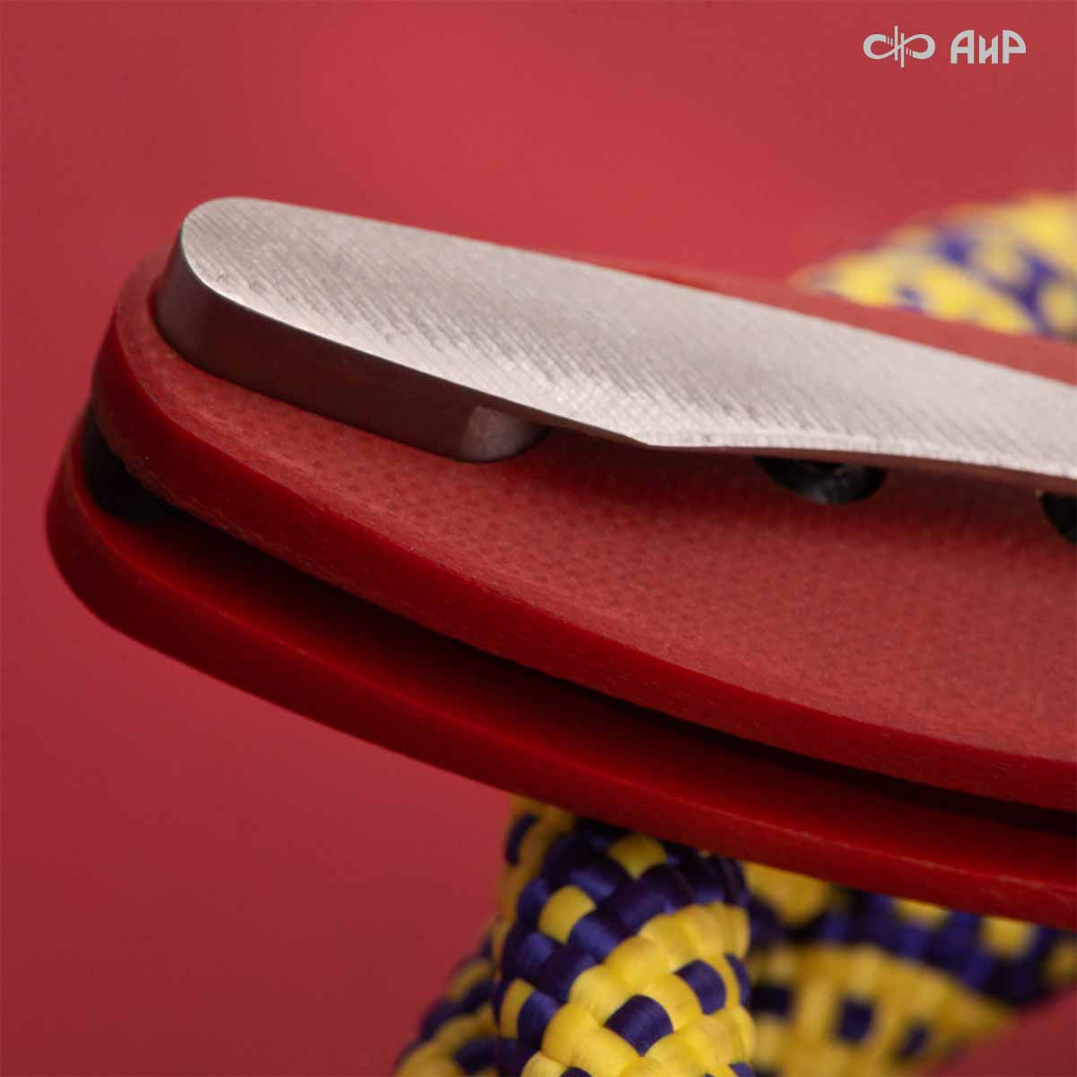 «Хантер» оснащен титановой клипсой для крепления ножа на кармане или поясе. Так нож всегда будет под рукой и не потеряется во время активных действий. Фрезеровка на клипсе дополняет эстетичный образ ножа. Кроме того, для уверенного удержания ножа и как элемент дизайна служит бэкспейсер (так называемая «спинка»), который закрывает все внутренности ножа и режущую кромку.