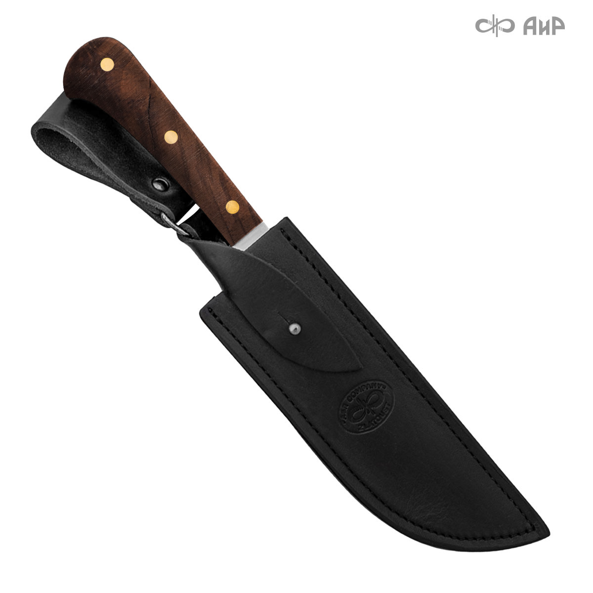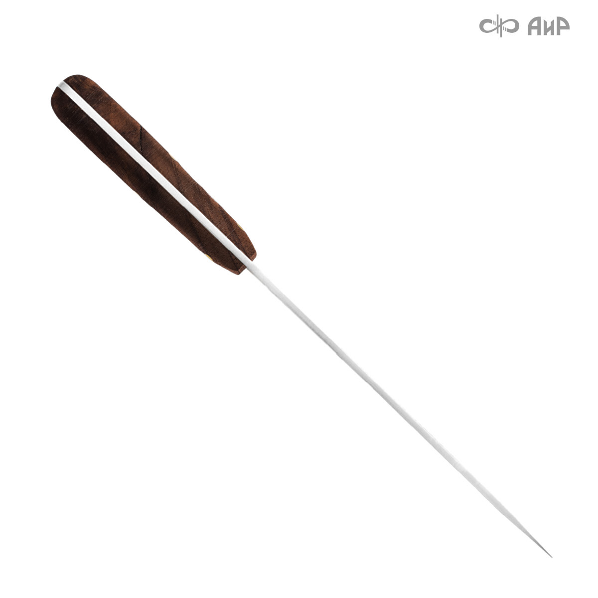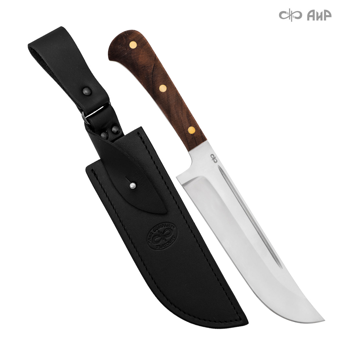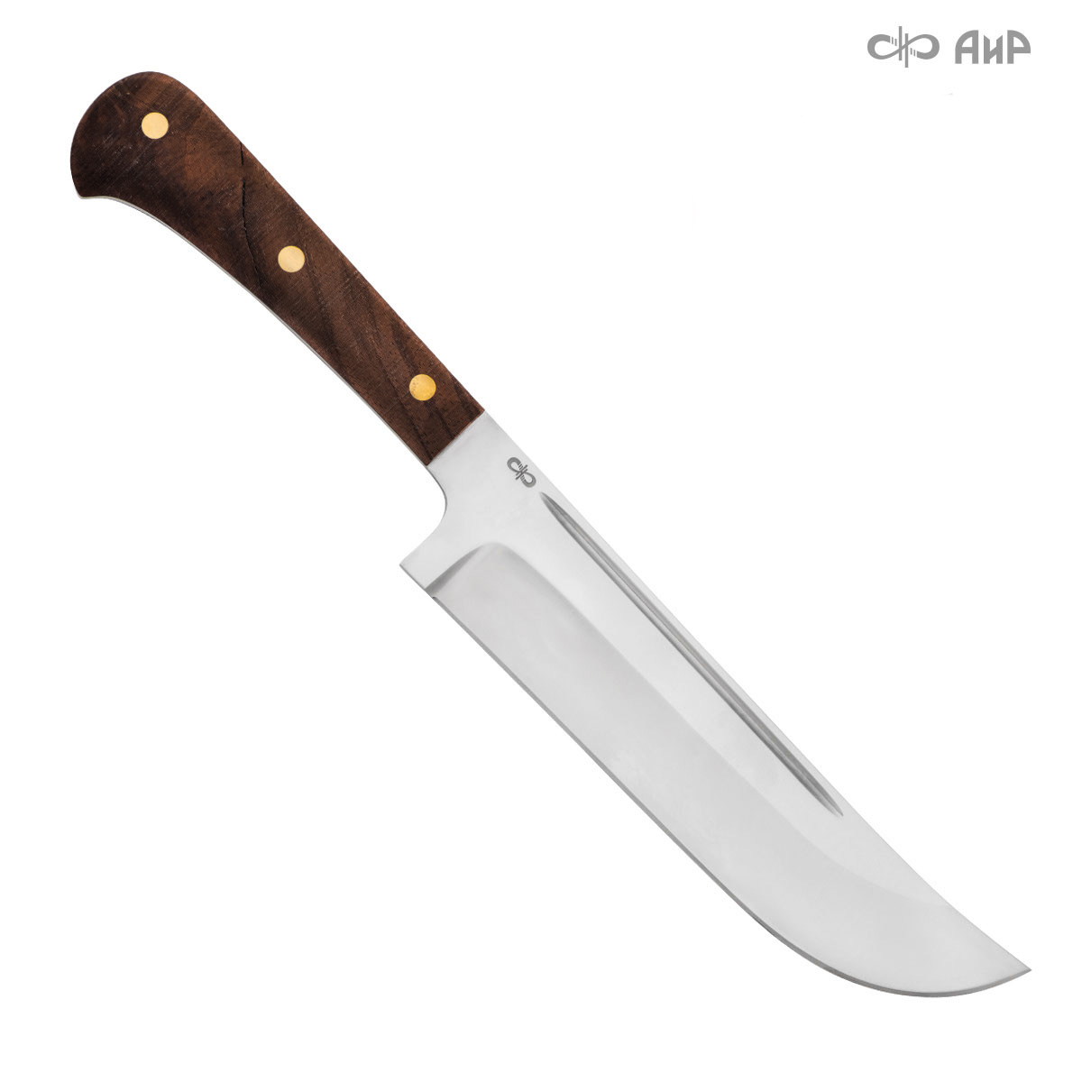 Пчак цельнометаллический (от узб. pichoq – нож) – традиционный узбекский нож. Отличительная особенность пчаков – это клинообразный в сечении, достаточно широкий клинок (значительно шире рукояти), рукоять, продолжающая линию обуха и соединяющаяся с клинком посредством больстера. Клинок может изготавливаться из различных сталей, как нержавеющей, так и дамасской. Форма острия у Пчака от Компании «АиР» называется «тугри» – то есть с прямым обухом. Вполне традиционен узкий дол «кома», идущий вдоль обуха с обеих сторон клинка. Рукоять достаточно узкая, ее головка имеет клювообразный изгиб – чакмок. Монтаж рукояти накладной, неразборный.