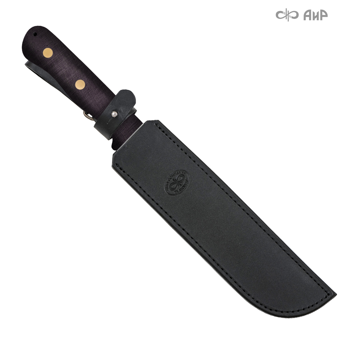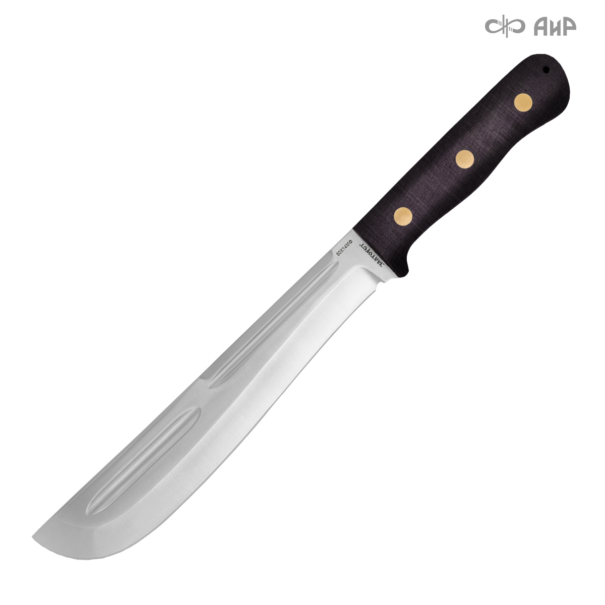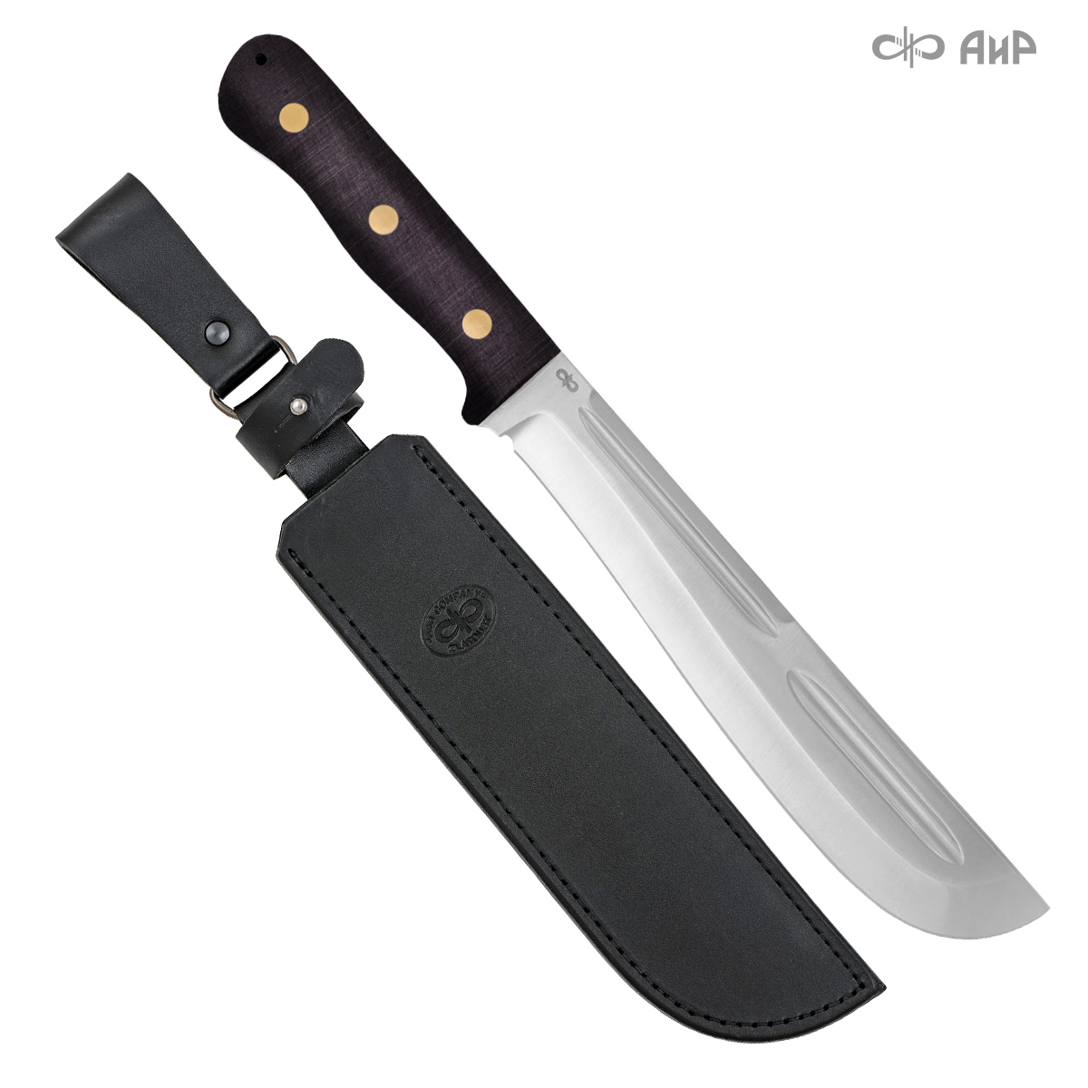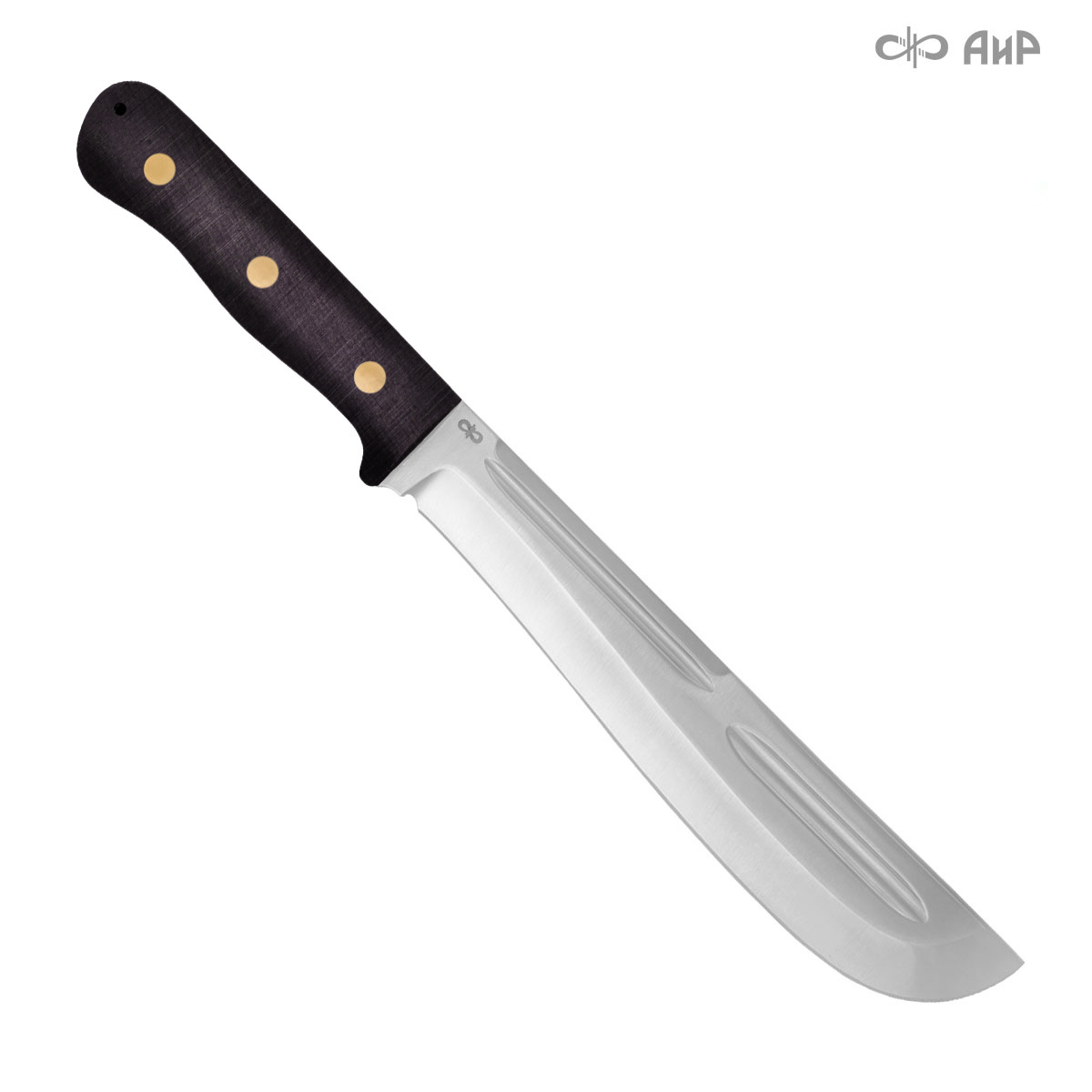 Внушительный нож с огромным клинком переменной ширины, с толщиной обуха 6 мм. Жесткость клинка дополнительно усилена четырьмя долами. На обухе клинка от середины до пяты клинка выведено фальшлезвие, что переносит центр тяжести еще ближе к острию ножа для эффективности рубящих ударов. Это же фальшлезвие хорошо рубит кости при разделке туши. Рукоять большая, удобной для рубки формы, имеет на навершии отверстие для темляка. Монтаж рукояти накладной, неразборный. Этот нож рекомендуется брать в багажник автомобиля вместо топорика при выездах на природу, ему нет равных при необходимости нарубить веток под колеса застрявшей машины и при обустройстве стоянки.
