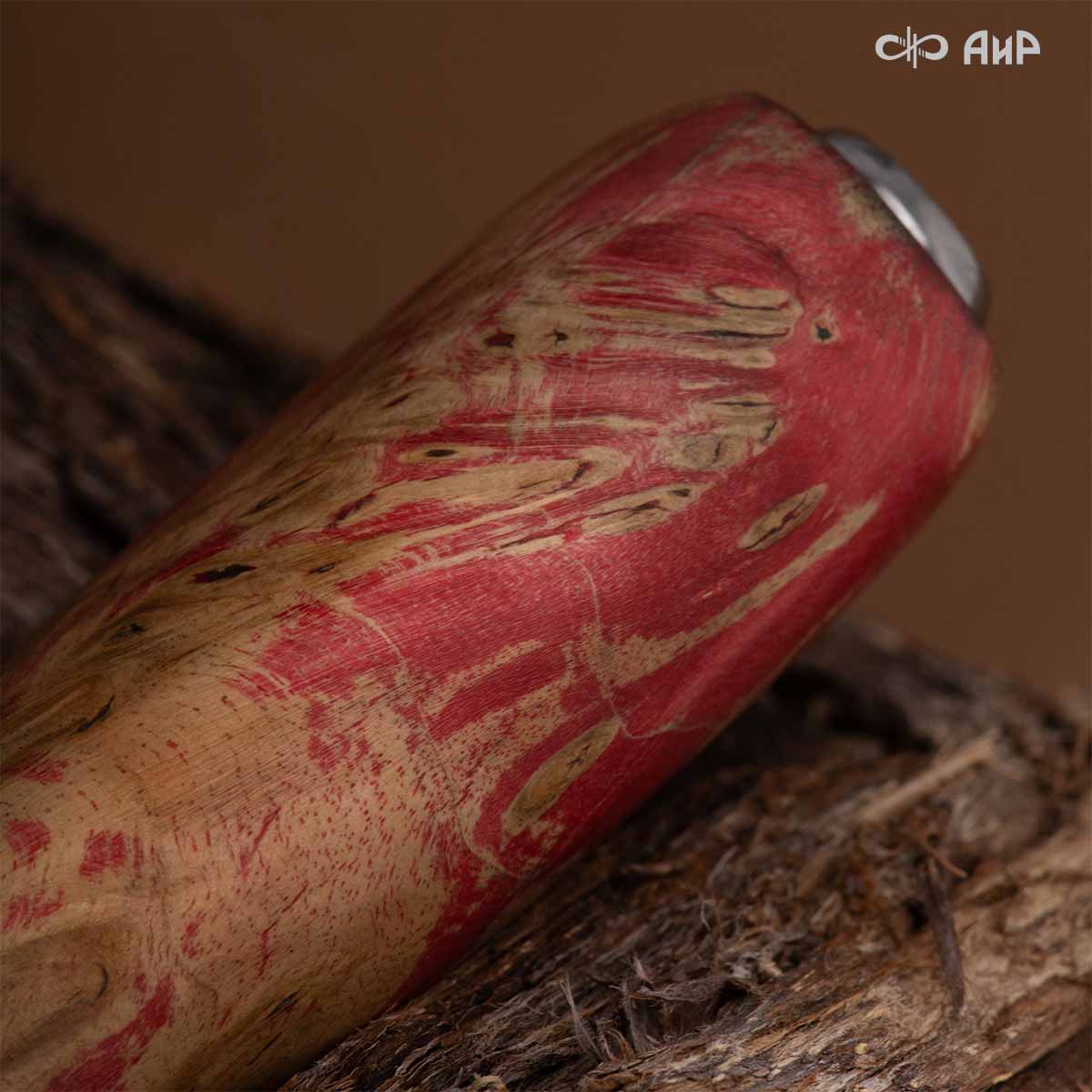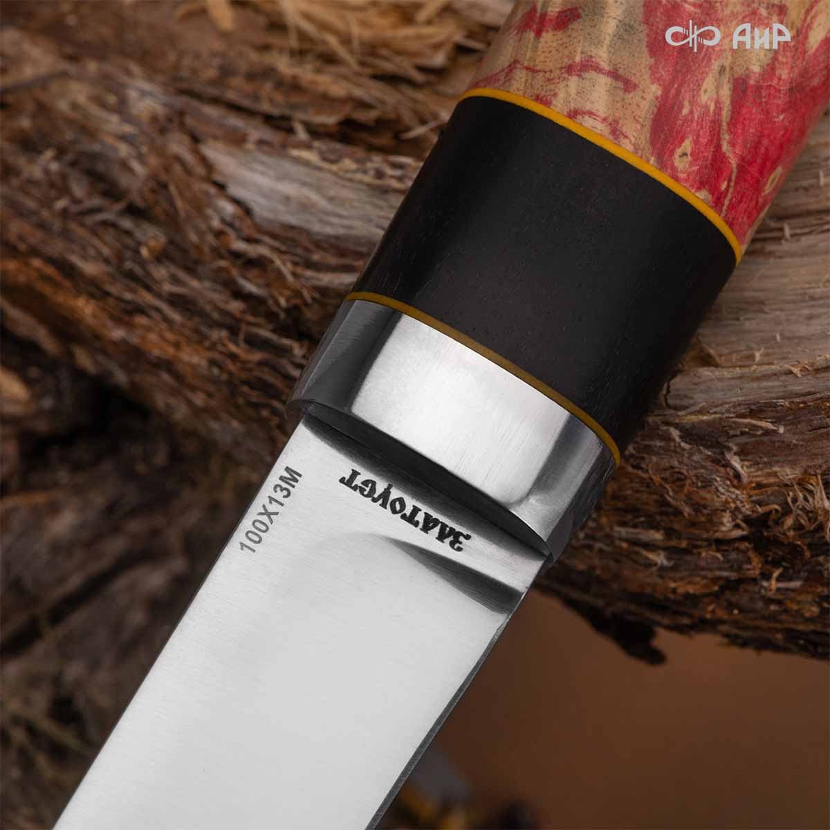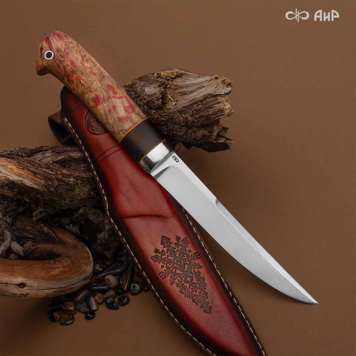 Финка Нью (наборная: стабилизированный граб, стабилизированный кап клена красный, фибра желтая, алюмин.втулка, авторские ножны, кастомная заточка) 100Х13М, № 23