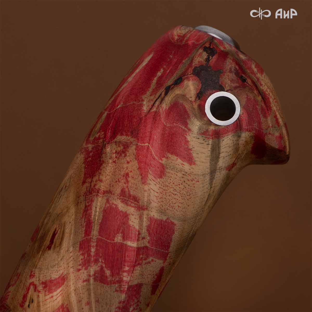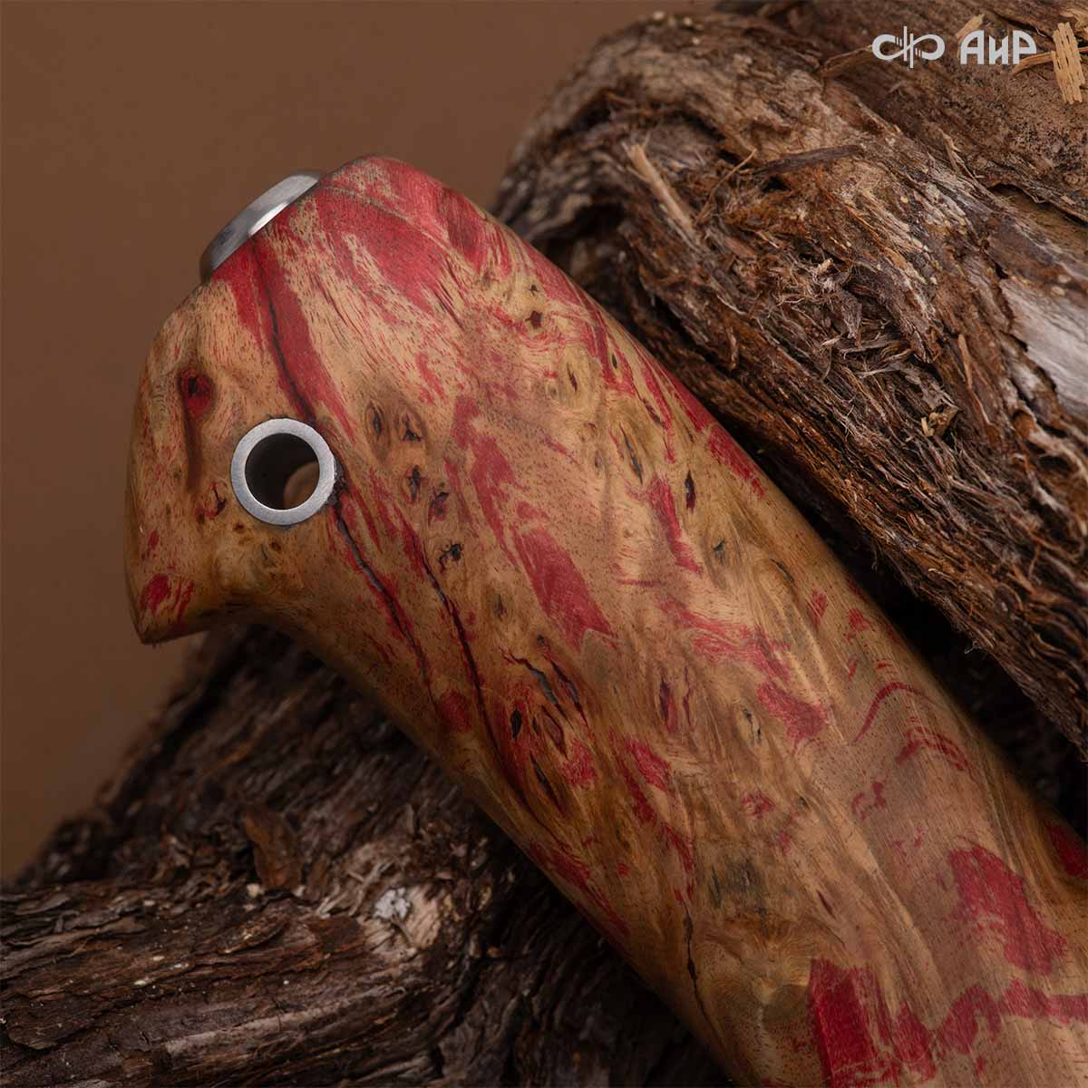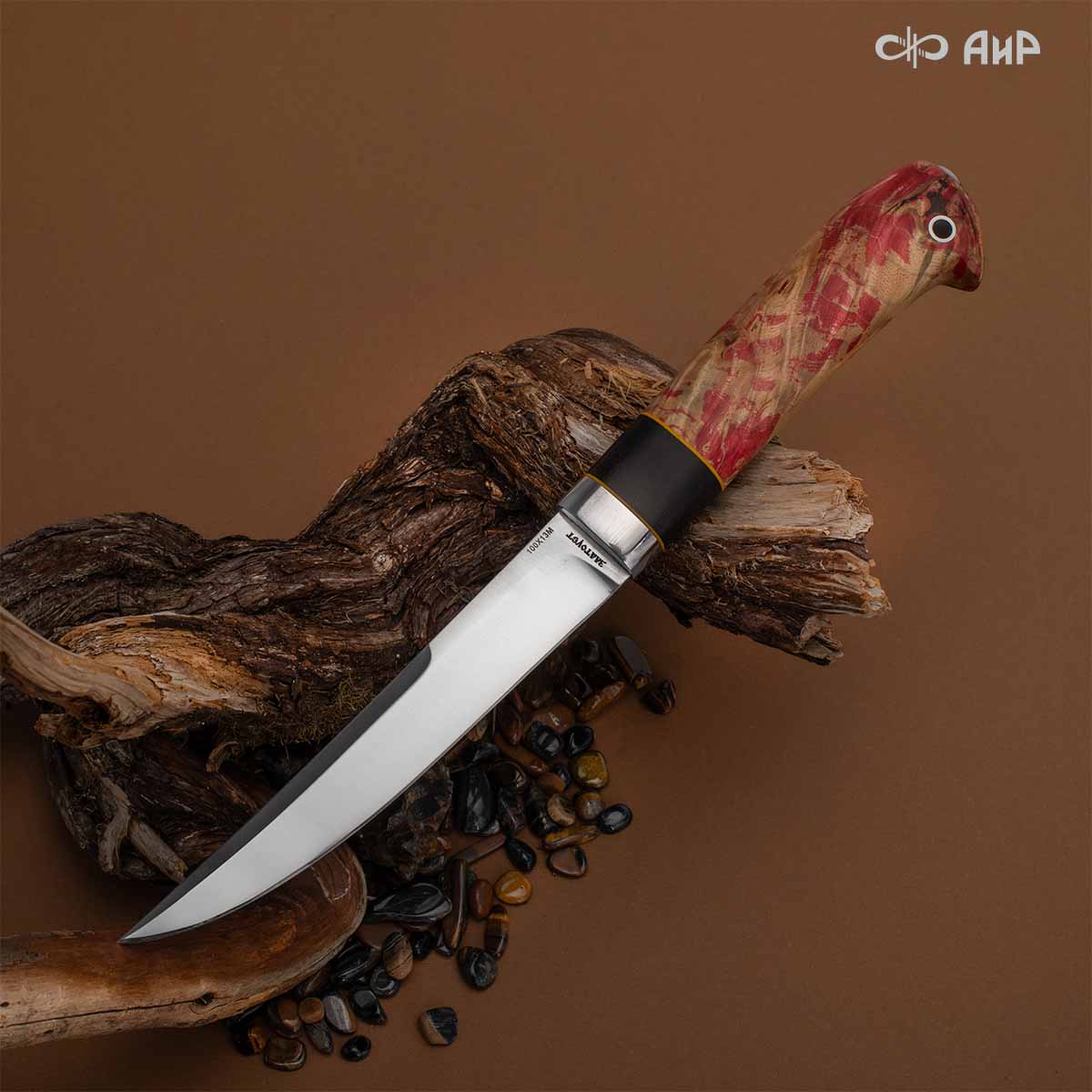 Финка Нью (наборная: стабилизированный граб, стабилизированный кап клена красный, фибра желтая, алюмин.втулка, авторские ножны, кастомная заточка) 100Х13М, № 23
