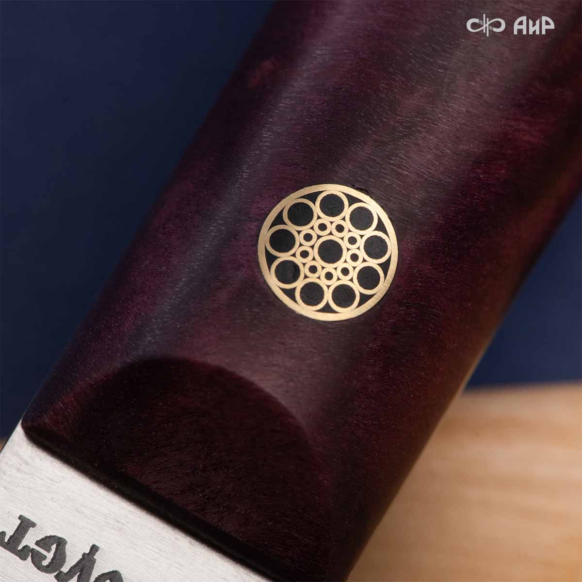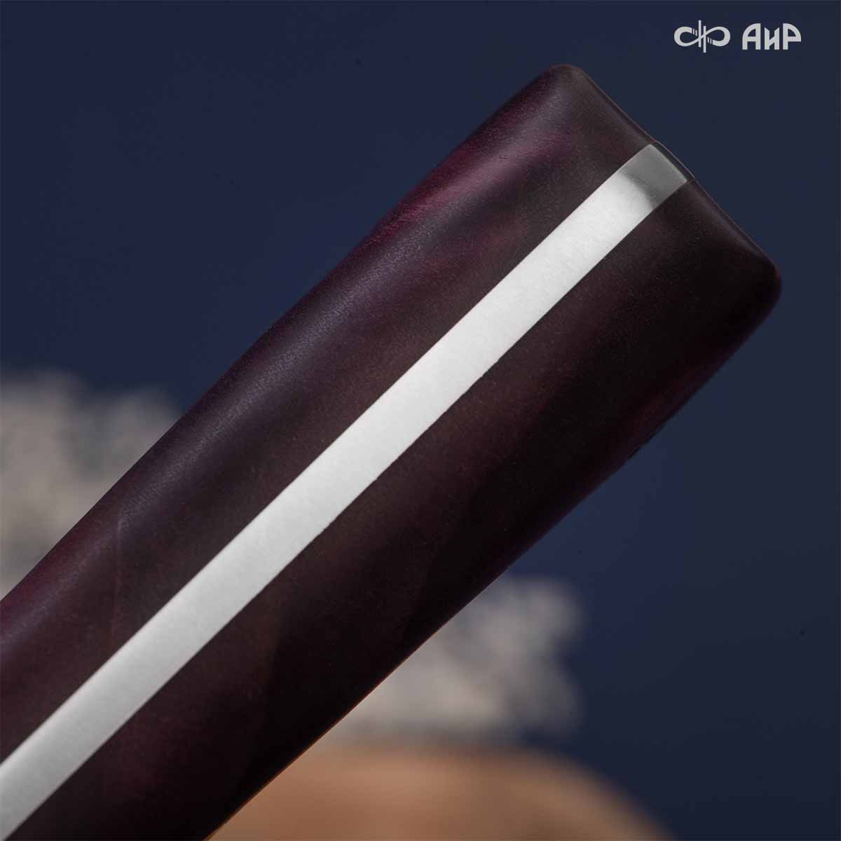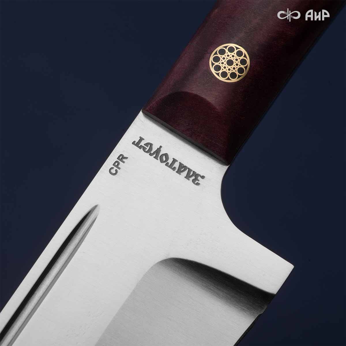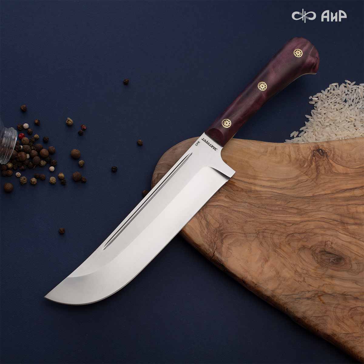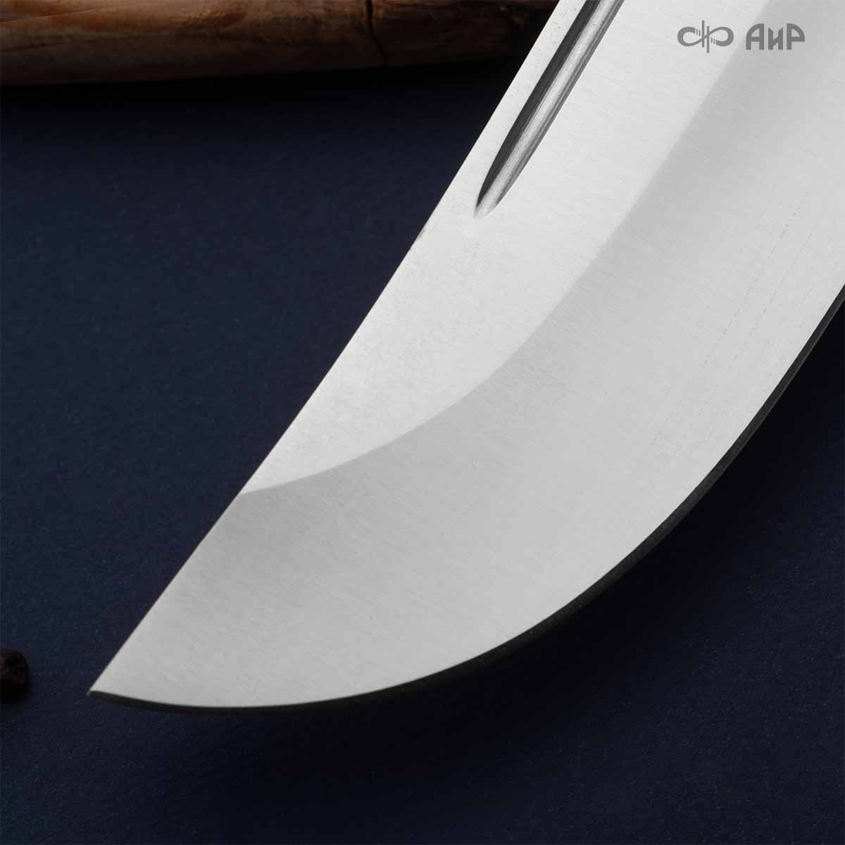 Пчак цельнометаллический (от узб. pichoq – нож) – традиционный узбекский нож. Отличительная особенность пчаков – это клинообразный в сечении, достаточно широкий клинок (значительно шире рукояти), рукоять, продолжающая линию обуха и соединяющаяся с клинком посредством больстера. Клинок может изготавливаться из различных сталей, как нержавеющей, так и дамасской. Форма острия у Пчака от Компании «АиР» называется «тугри» – то есть с прямым обухом. Вполне традиционен узкий дол «кома», идущий вдоль обуха с обеих сторон клинка. Рукоять достаточно узкая, ее головка имеет клювообразный изгиб – чакмок. Монтаж рукояти накладной, неразборный.