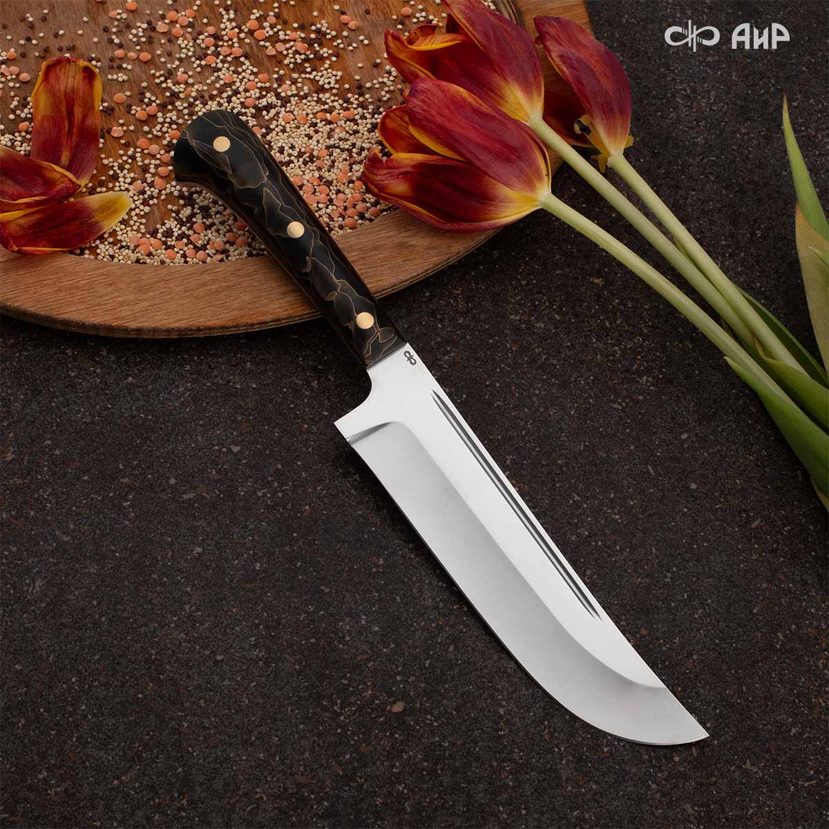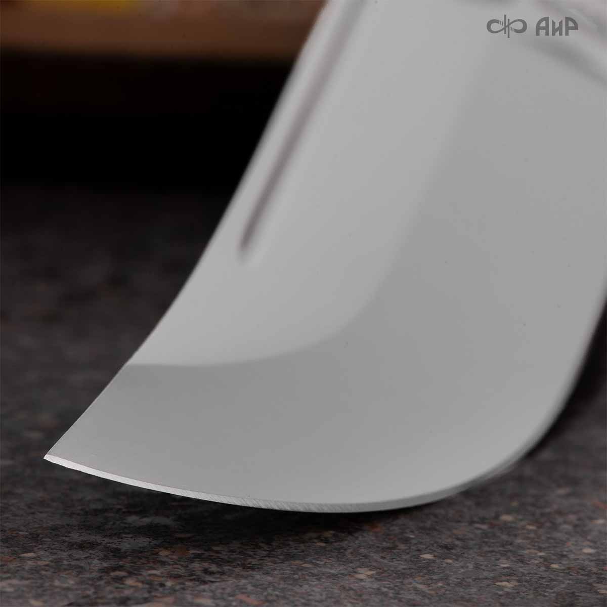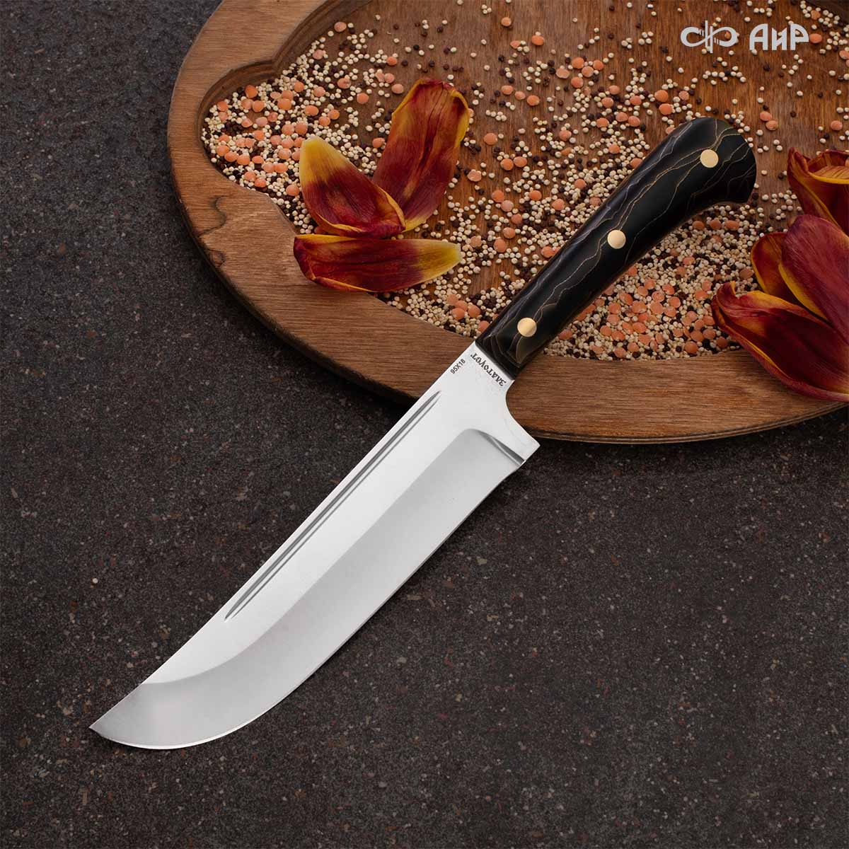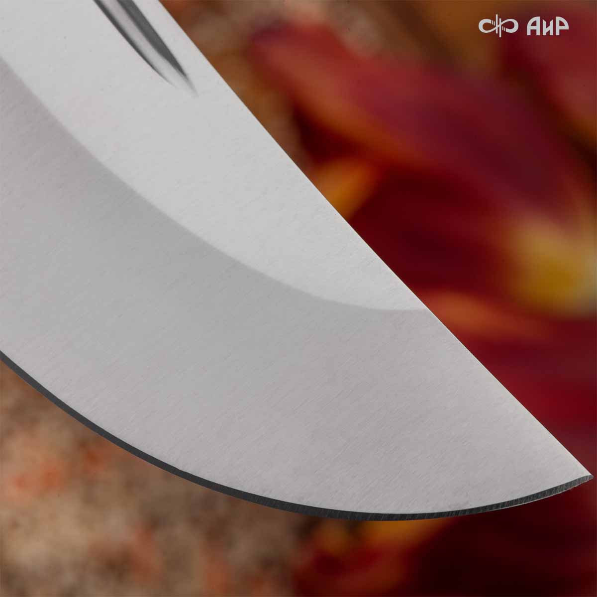 Пчак цельнометаллический (от узб. pichoq – нож) – традиционный узбекский нож. Отличительная особенность пчаков – это клинообразный в сечении, достаточно широкий клинок (значительно шире рукояти), рукоять, продолжающая линию обуха и соединяющаяся с клинком посредством больстера. Клинок может изготавливаться из различных сталей, как нержавеющей, так и дамасской. Форма острия у Пчака от Компании «АиР» называется «тугри» – то есть с прямым обухом. Вполне традиционен узкий дол «кома», идущий вдоль обуха с обеих сторон клинка. Рукоять достаточно узкая, ее головка имеет клювообразный изгиб – чакмок. Монтаж рукояти накладной, неразборный.