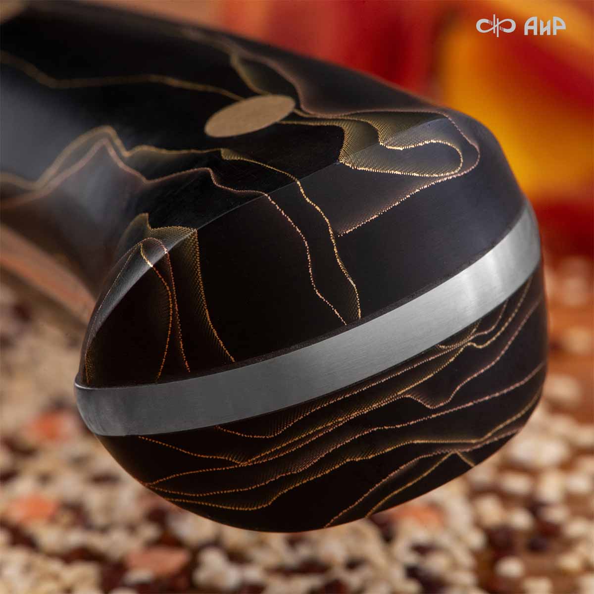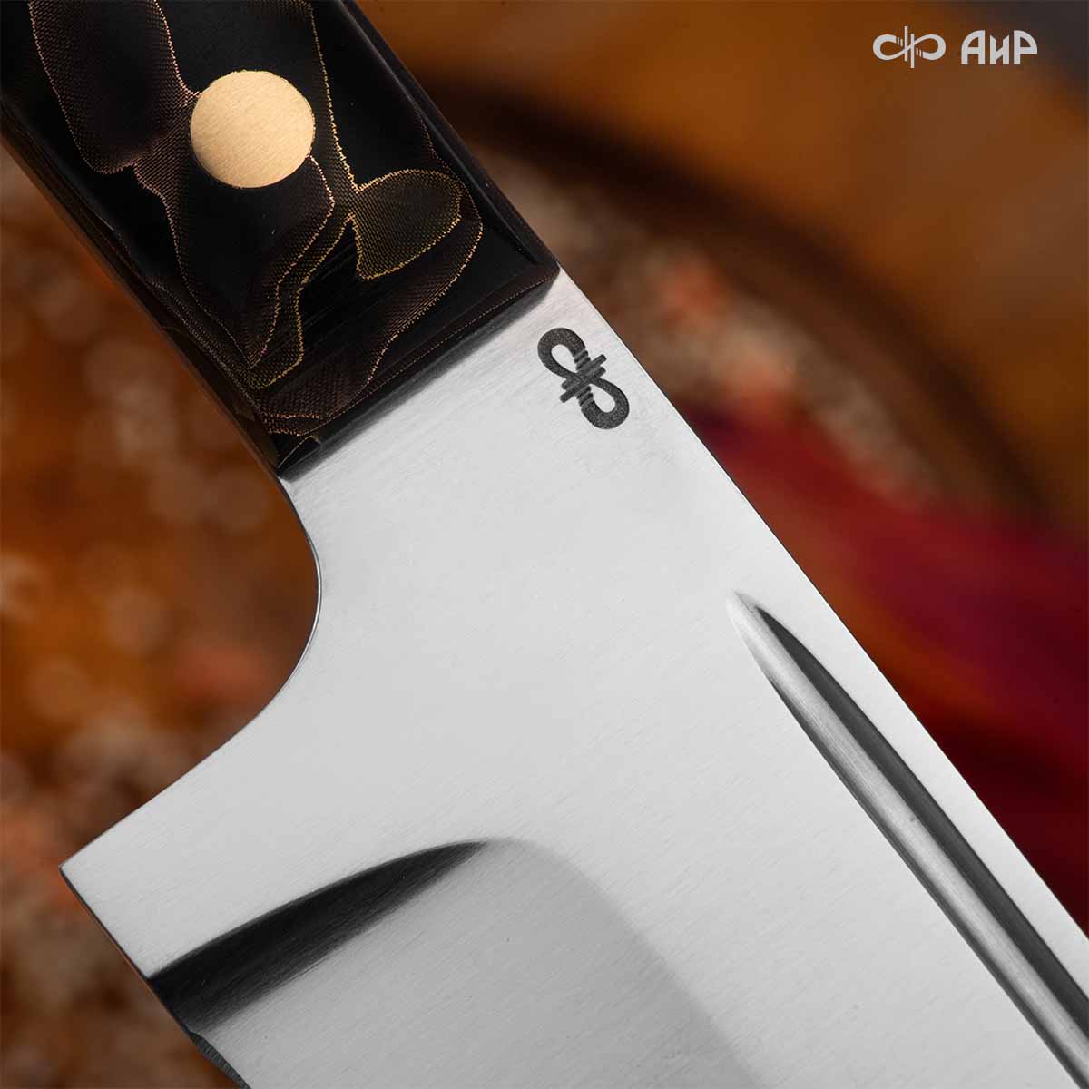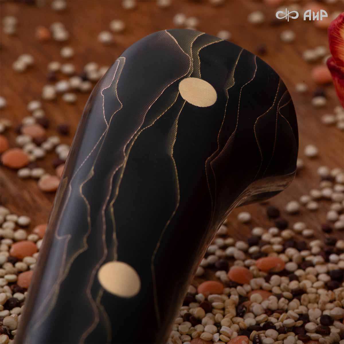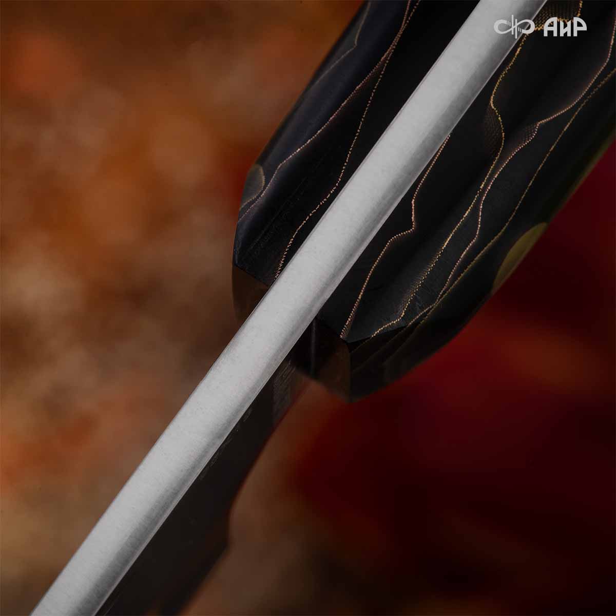 Пчак цельнометаллический (от узб. pichoq – нож) – традиционный узбекский нож. Отличительная особенность пчаков – это клинообразный в сечении, достаточно широкий клинок (значительно шире рукояти), рукоять, продолжающая линию обуха и соединяющаяся с клинком посредством больстера. Клинок может изготавливаться из различных сталей, как нержавеющей, так и дамасской. Форма острия у Пчака от Компании «АиР» называется «тугри» – то есть с прямым обухом. Вполне традиционен узкий дол «кома», идущий вдоль обуха с обеих сторон клинка. Рукоять достаточно узкая, ее головка имеет клювообразный изгиб – чакмок. Монтаж рукояти накладной, неразборный.