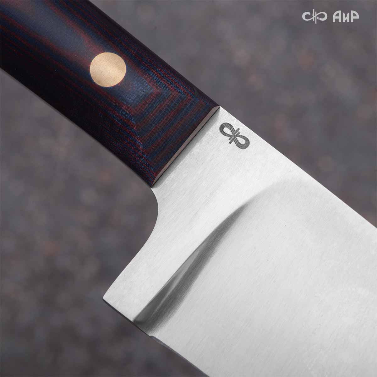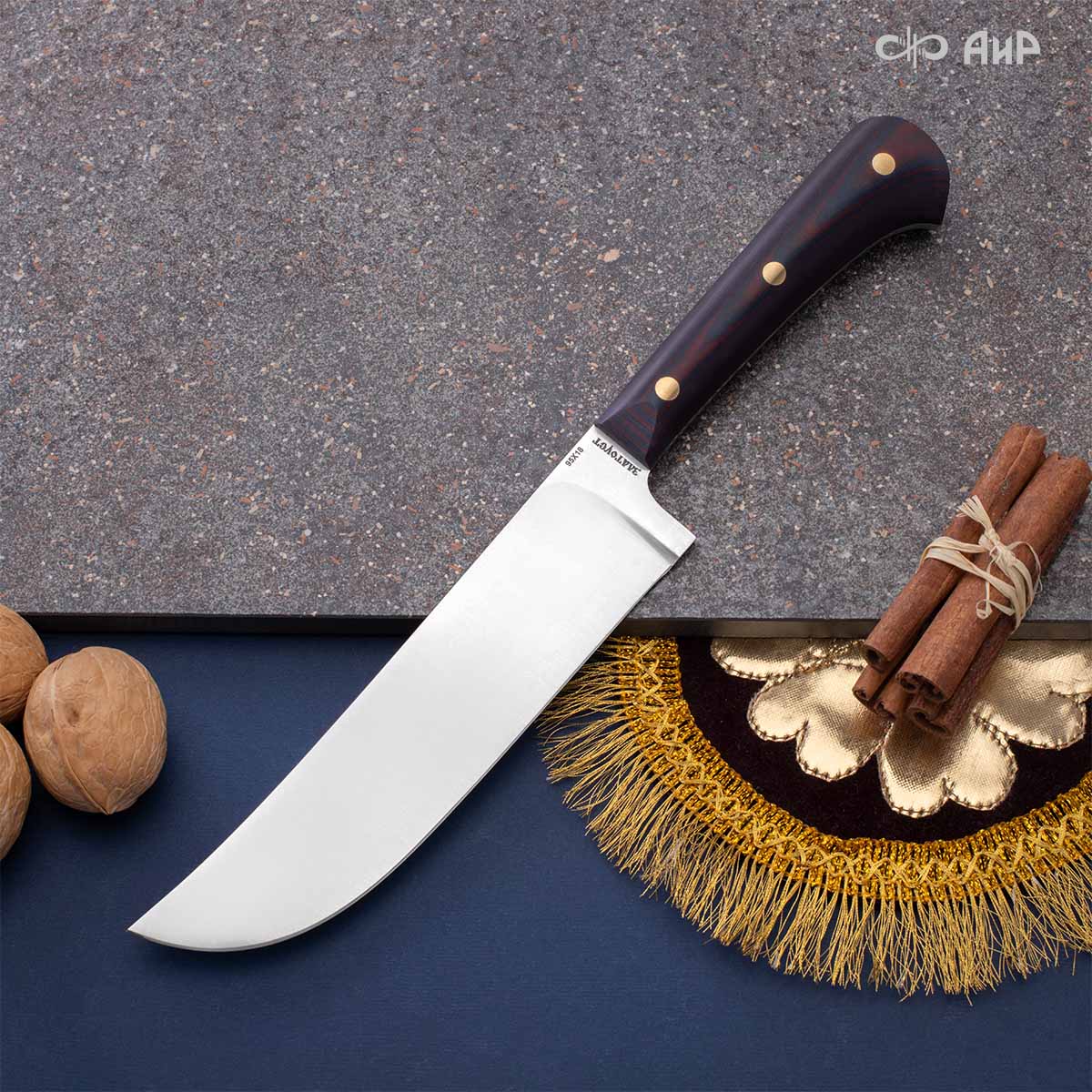 Пчак цельнометаллический (от узб. pichoq – нож) – традиционный узбекский нож. Отличительная особенность пчаков – это клинообразный в сечении, достаточно широкий клинок (значительно шире рукояти), рукоять, продолжающая линию обуха и соединяющаяся с клинком посредством больстера. Клинок может изготавливаться из различных сталей, как нержавеющей, так и дамасской. Форма острия у Пчака от Компании «АиР» называется «тугри» – то есть с прямым обухом. Вполне традиционен узкий дол «кома», идущий вдоль обуха с обеих сторон клинка. Рукоять достаточно узкая, ее головка имеет клювообразный изгиб – чакмок. Монтаж рукояти накладной, неразборный.