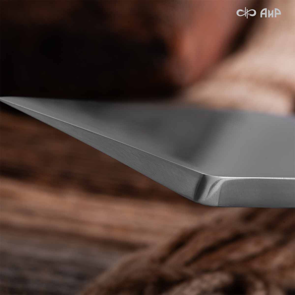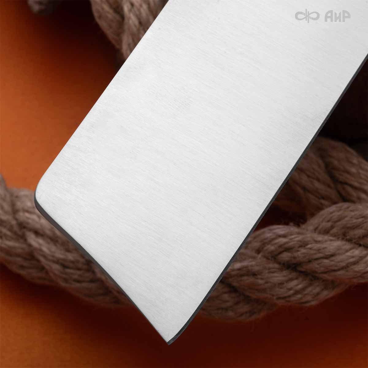 Специально для любителей ножевого спорта Компания «АиР» представляет тесак «Уралмаш». Геометрия клинка из базовой стали 50Х14МФ позволяет наносить мощные рубящие удары и легко разрезать различные предметы (пластик, бумага, канат, нить и пр.). Накладной монтаж рукояти, цельнометаллический клинок толщиной 6,5 мм обеспечивают практически «неубиваемость» этому ножу. Травмобезопасная ухватистая рукоять из микарты или G10 отлично фиксируется в ладони за счет упора и ограничителя. На рукояти ближе к клинку имеется отверстие с втулкой под темляк. Использование темляка обязательно, чтобы нож не выскочил из рук и не травмировал участников и зрителей. На тренировках и соревнованиях рекомендуется обматывать рукоять эластичным самофиксирующимся бинтом во избежание скольжения. «Уралмаш» – довольно увесистый тесак, в среднем его масса составляет 640 г, при этом он хорошо сбалансирован.
