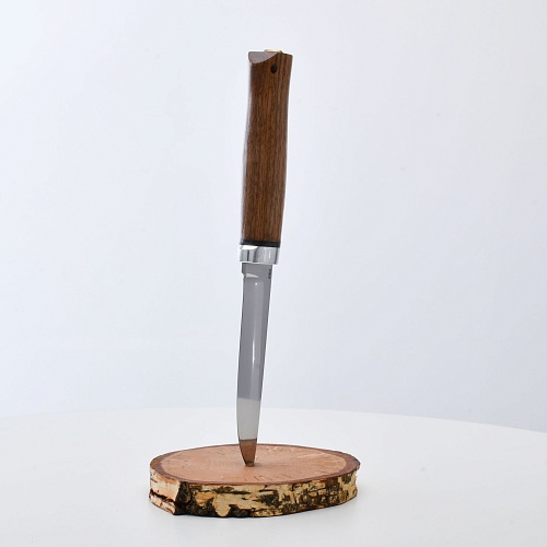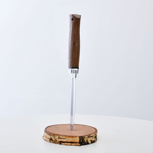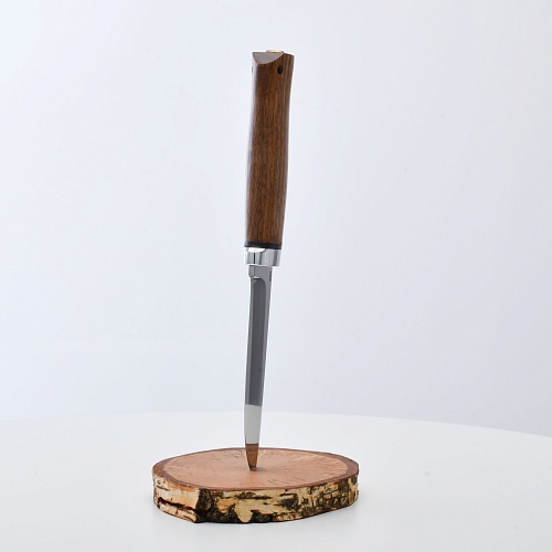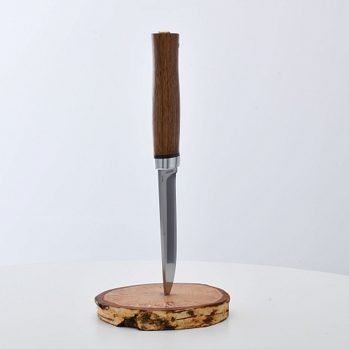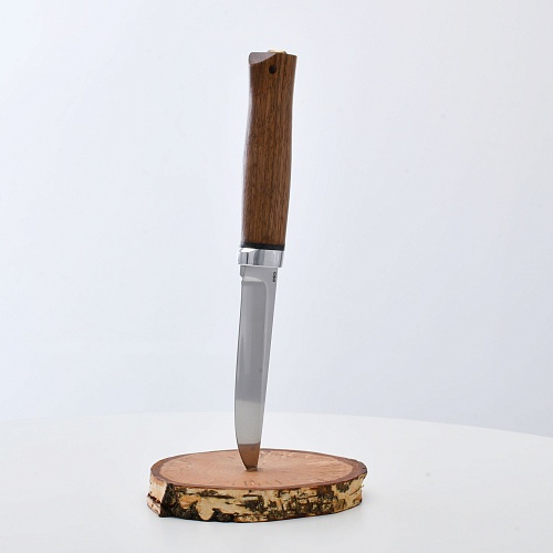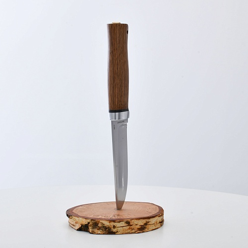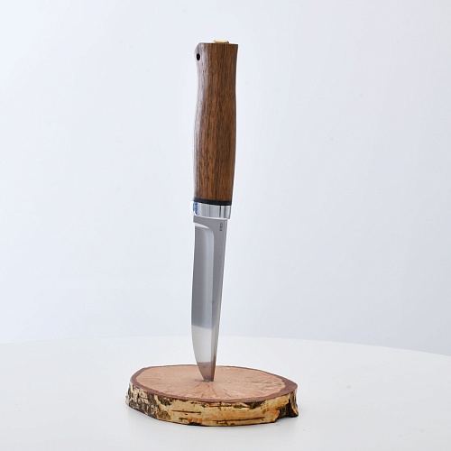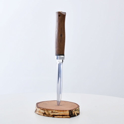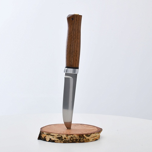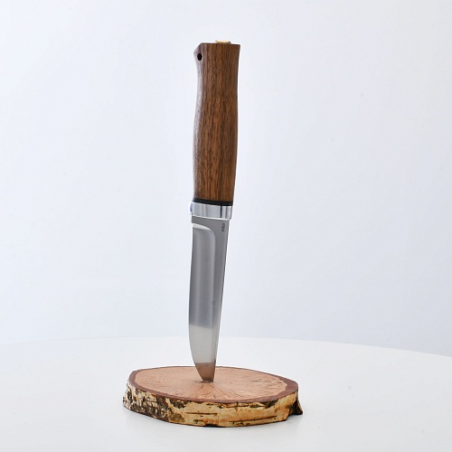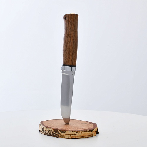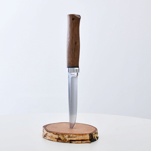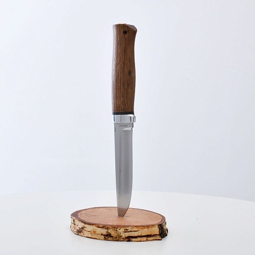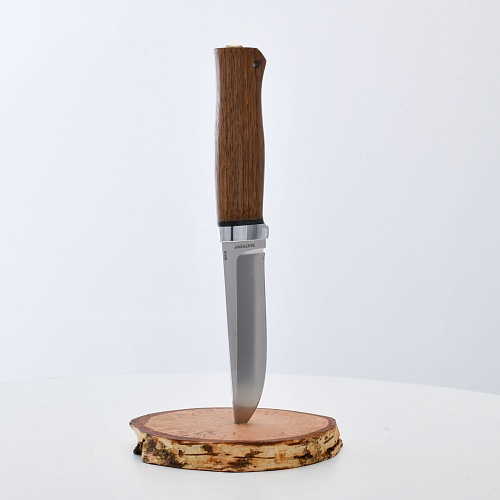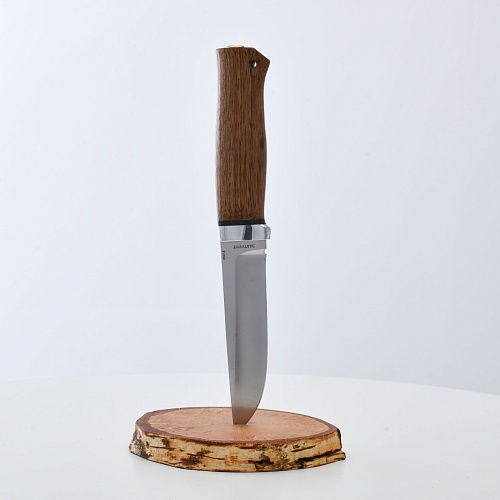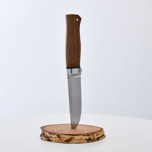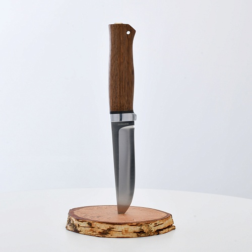 Солидный нож с серьезным клинком. Спуски высокие, слегка вогнутые. Пята узкая – нож «заточен» под серьезную работу по обдирке и разделке туши. Толщина клинка в обухе составляет 3,5 мм, что оптимально для охотничьего и туристического ножа, который не предполагается использовать в качестве топора или кинжала. Обух клинка чуть заметно спущен вниз. Подводы очень тонкие, что дает ножу хорошее подспорье в резе, ошкуривании, а также работе по дереву строганием. Нож имеет сквозной монтаж рукояти, со стяжным креплением на гайку в торце рукояти. Рукоять довольно толстая, но в работе она вполне удобна. Нож великолепно сбалансирован и посадист. Имеется отверстие под темляк.