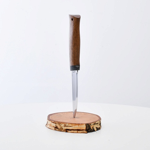 Небольшой универсальный, легкий и прочный нож классической скандинавской формы с нешироким клинком, имеющим популярные у скандинавов неширокие прямые спуски, образующие агрессивно режущее лезвие. Клинок имеет чуть приспущенный к острию обушок. Нож демонстрирует отличные режущие качества. Клинок с толщиной обуха в 2,4 мм имеет широкую голомень с обеих сторон, что придает ему дополнительную прочность. Скандинавская форма рукояти подкупает: она удобна даже для большой руки, уверенно и прочно ложится в любую, даже усталую ладонь. Оптимальной величины гарда не дает соскользнуть пальцам при резах от себя. Навершие рукояти «грибком» позволяет с большей уверенностью извлекать нож из глубоких ножен. Монтаж рукояти всадной, неразборный. На навершии рукояти имеется отверстие под темляк. Первоначально планировался как бюджетный нож с дамасским клинком и деревянной рукоятью, но по желанию покупателей стал выпускаться во всех вариантах исполнения, используемых компанией. «Кузюк» ‒ отличный выбор для большинства видов работы в лесу.