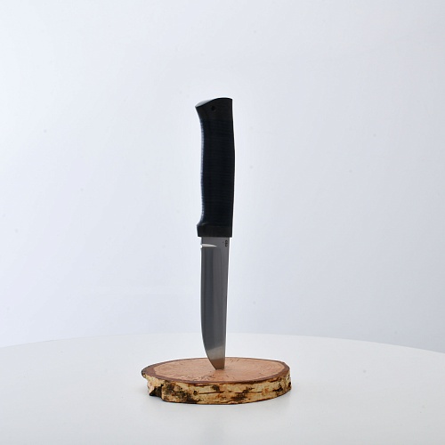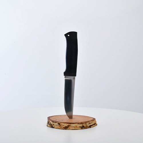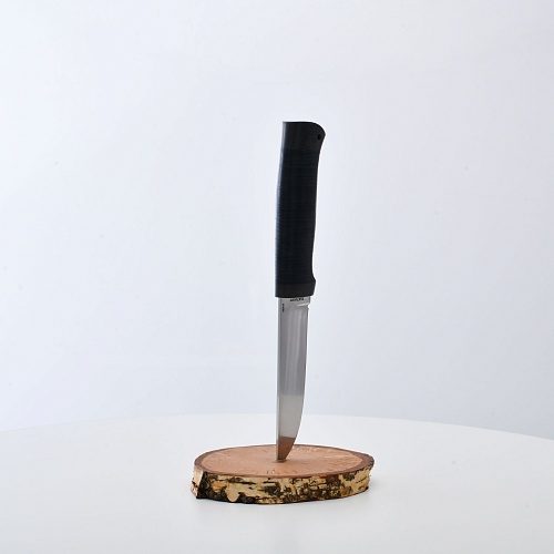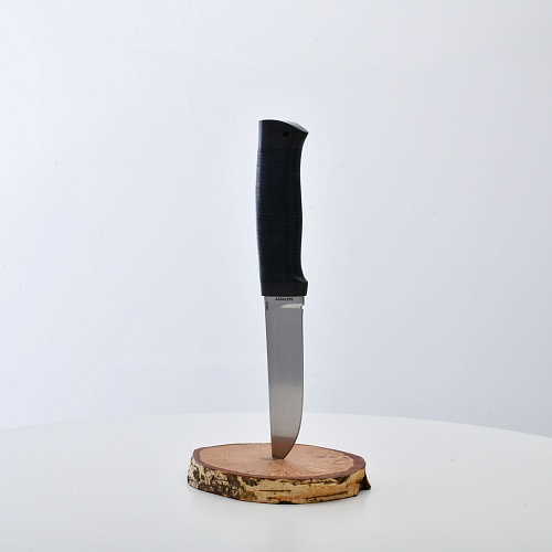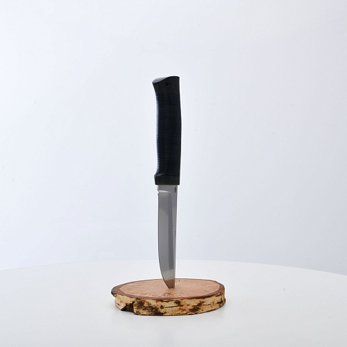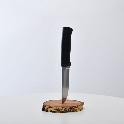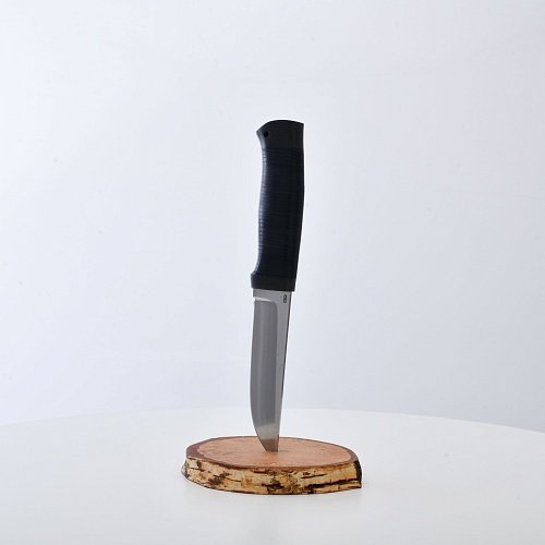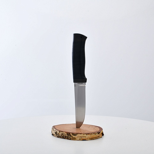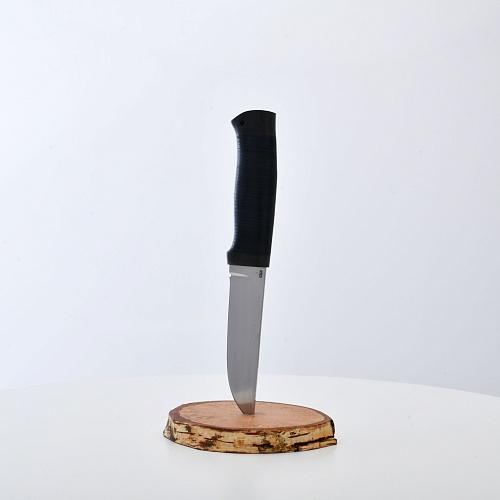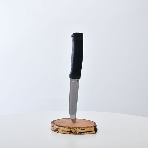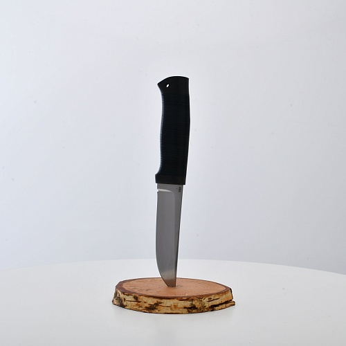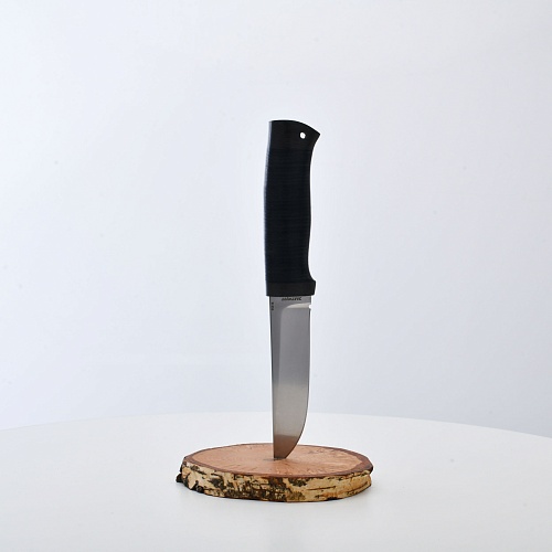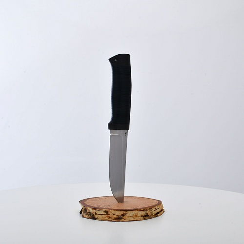 Солидный нож с серьезным клинком. Спуски высокие, слегка вогнутые. Пята узкая – нож «заточен» под серьезную работу по обдирке и разделке туши. Толщина клинка в обухе составляет 3,5 мм, что оптимально для охотничьего и туристического ножа, который не предполагается использовать в качестве топора или кинжала. Обух клинка чуть заметно спущен вниз. Подводы очень тонкие, что дает ножу хорошее подспорье в резе, ошкуривании, а также работе по дереву строганием. Нож имеет сквозной монтаж, со стяжным креплением на гайку в торце рукояти. Рукоять довольно толстая, но в работе она вполне удобна. Нож великолепно сбалансирован и посадист. Имеется отверстие под темляк.