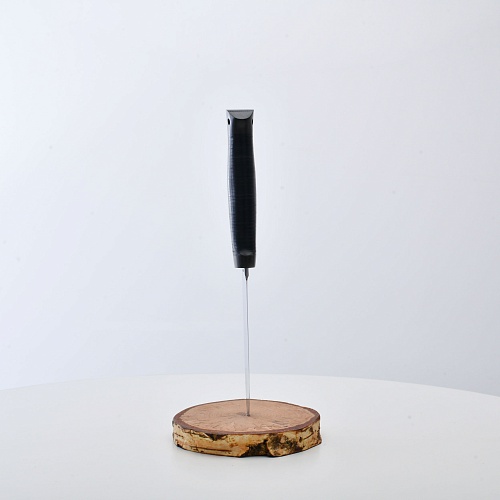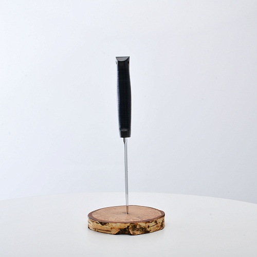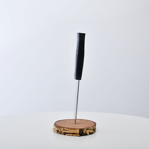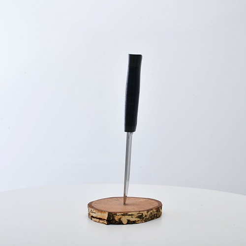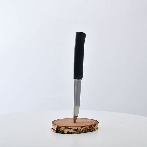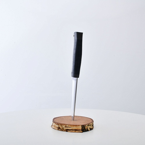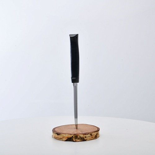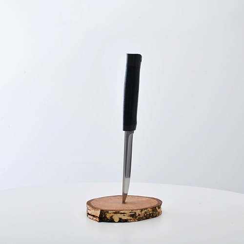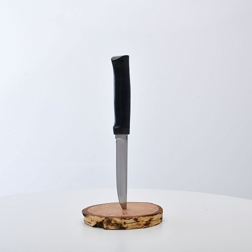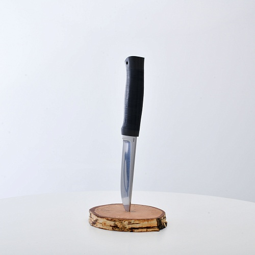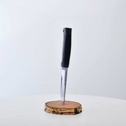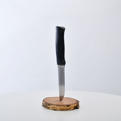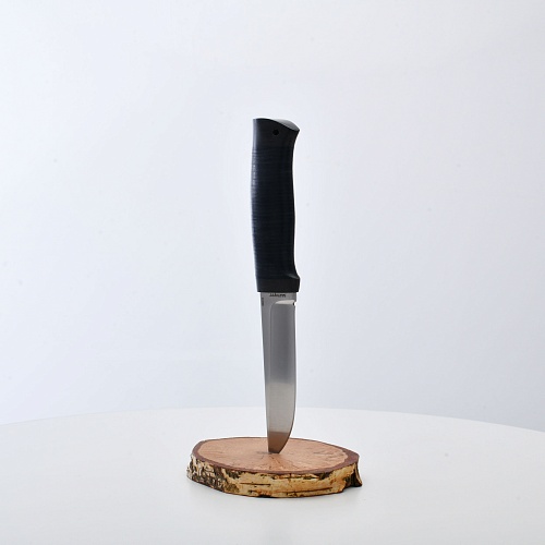 Солидный нож с серьезным клинком. Спуски высокие, слегка вогнутые. Пята узкая – нож «заточен» под серьезную работу по обдирке и разделке туши. Толщина клинка в обухе составляет 3,5 мм, что оптимально для охотничьего и туристического ножа, который не предполагается использовать в качестве топора или кинжала. Обух клинка чуть заметно спущен вниз. Подводы очень тонкие, что дает ножу хорошее подспорье в резе, ошкуривании, а также работе по дереву строганием. Нож имеет сквозной монтаж, со стяжным креплением на гайку в торце рукояти. Рукоять довольно толстая, но в работе она вполне удобна. Нож великолепно сбалансирован и посадист. Имеется отверстие под темляк.