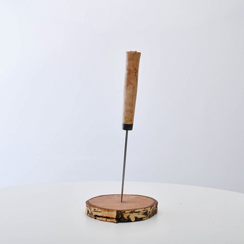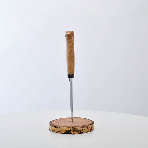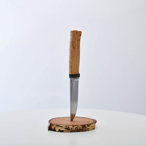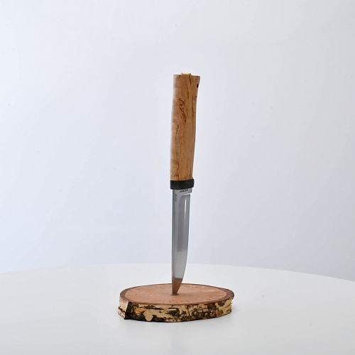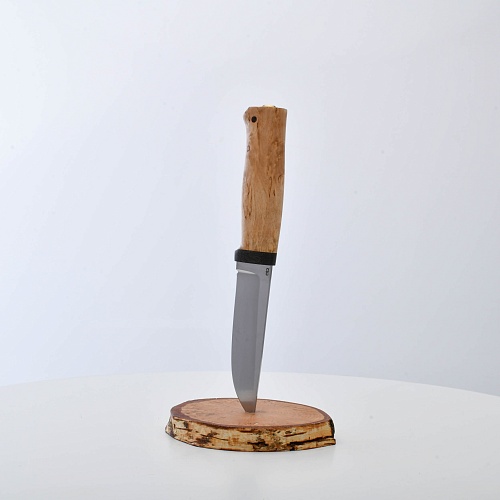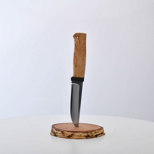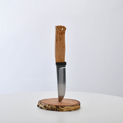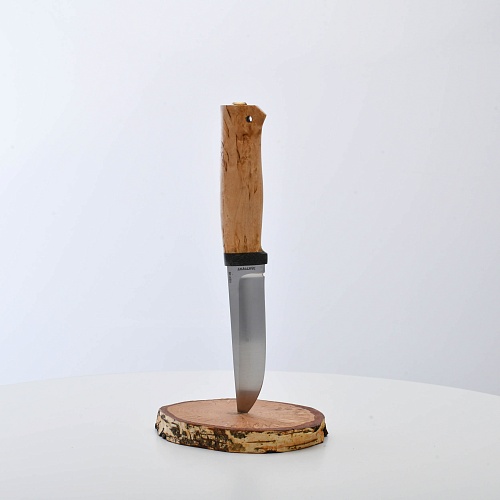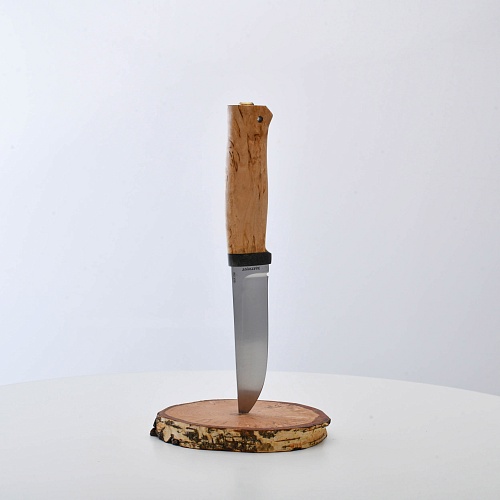 Солидный нож с серьезным клинком. Спуски высокие, слегка вогнутые. Пята узкая – нож «заточен» под серьезную работу по обдирке и разделке туши. Толщина клинка в обухе составляет 3,5 мм, что оптимально для охотничьего и туристического ножа, который не предполагается использовать в качестве топора или кинжала. Обух клинка чуть заметно спущен вниз. Подводы очень тонкие, что дает ножу хорошее подспорье в резе, ошкуривании, а также работе по дереву строганием. Нож имеет сквозной монтаж, со стяжным креплением на гайку в торце рукояти. Рукоять довольно толстая, но в работе она вполне удобна. Нож великолепно сбалансирован и посадист. Имеется отверстие под темляк.