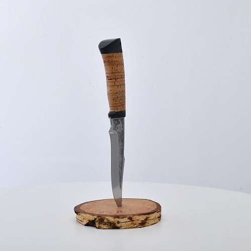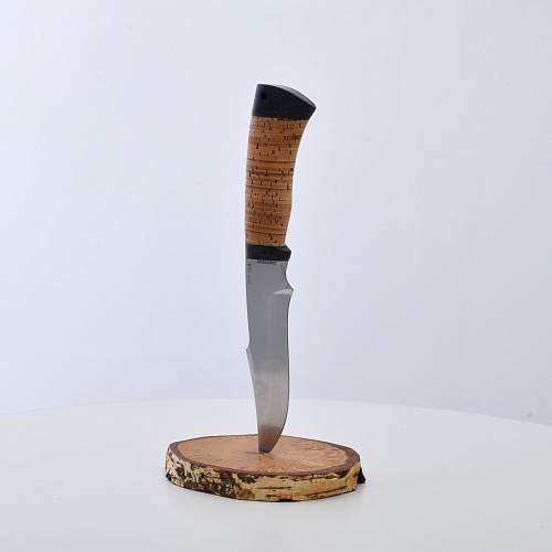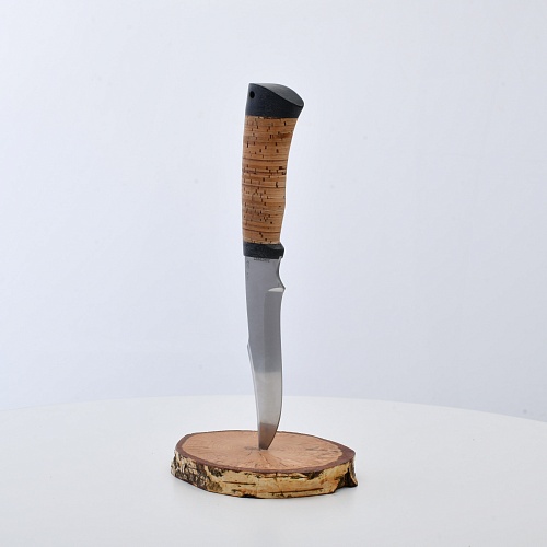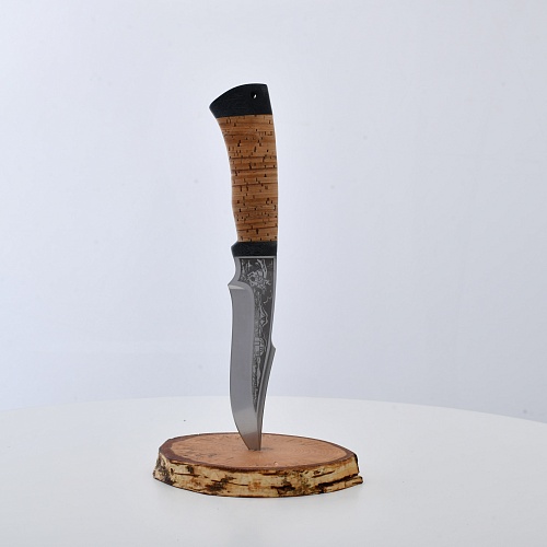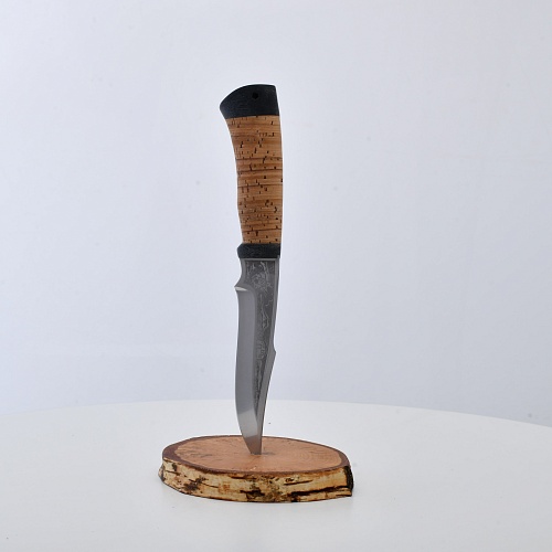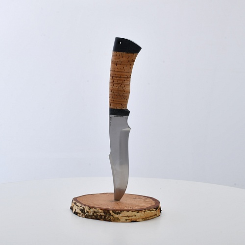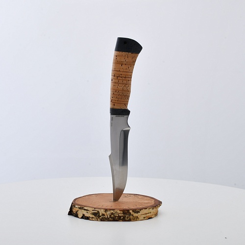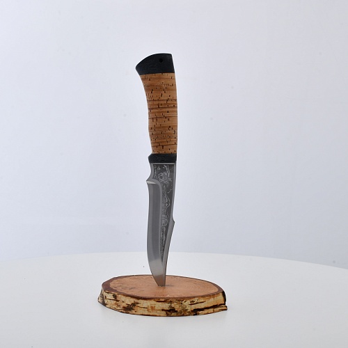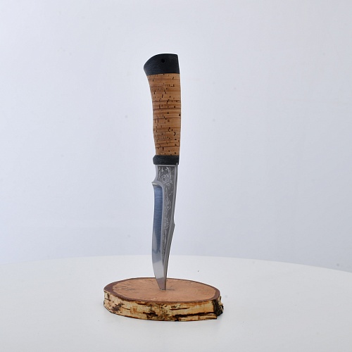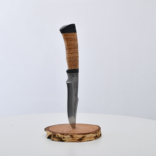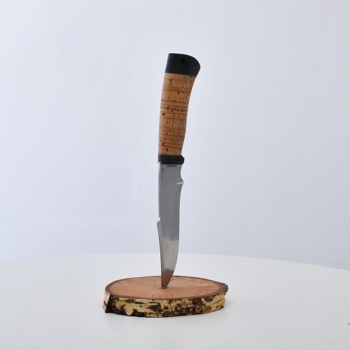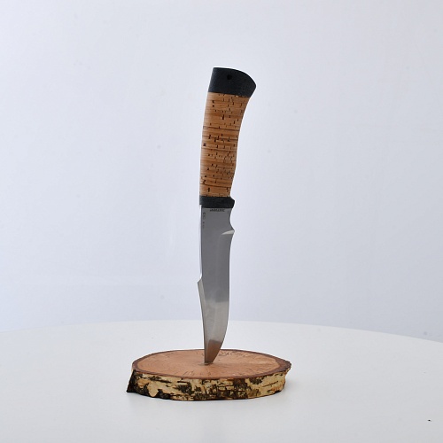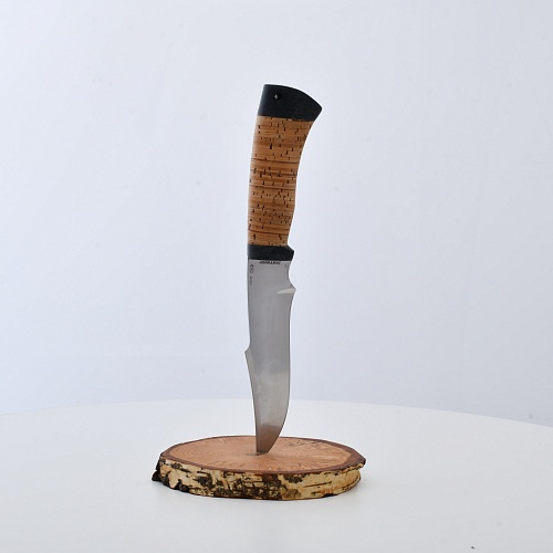 Купил этот нож, внешне очень понравился . Сталь 95х18 . Ручка удобная , но заточка.... Честно говоря удивился она ассиметрична и не острая . Это мой первый собственный нож ( до этого покупал на подарок другой компании ) но то что он шкурку помидора без давления не разрезал .... Да и жена повар отметила что он туповат . думаю заточка всё решит ... Гравировка методом травления видимо смотрится на любителя . Покупал из стали эи 107 нож соболь другой Златоустовской компании там гравировка объёмная ну это с точки зрения эстетики . Ручка береста это конечно класс лично мне нравится. Вообще думаю купить вулканус и точить самому .