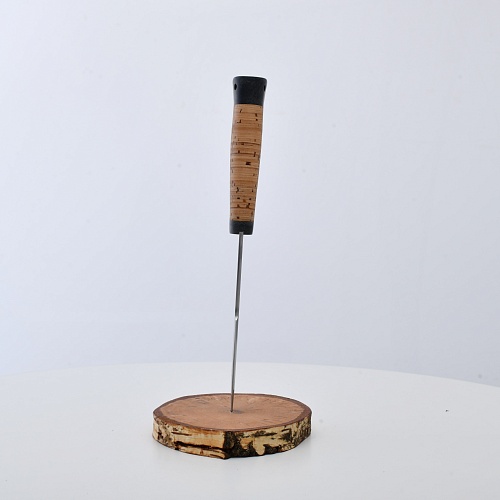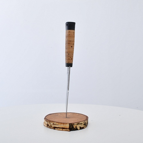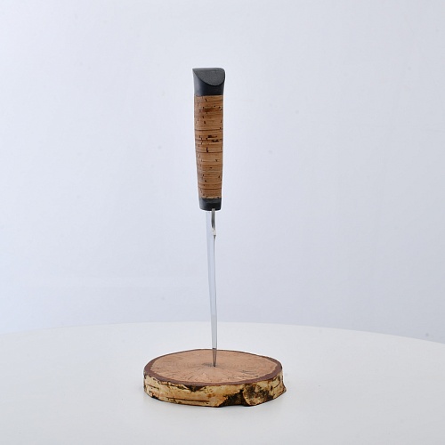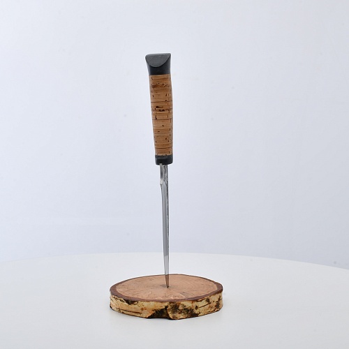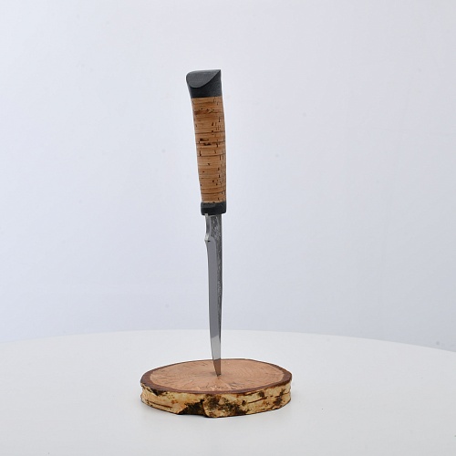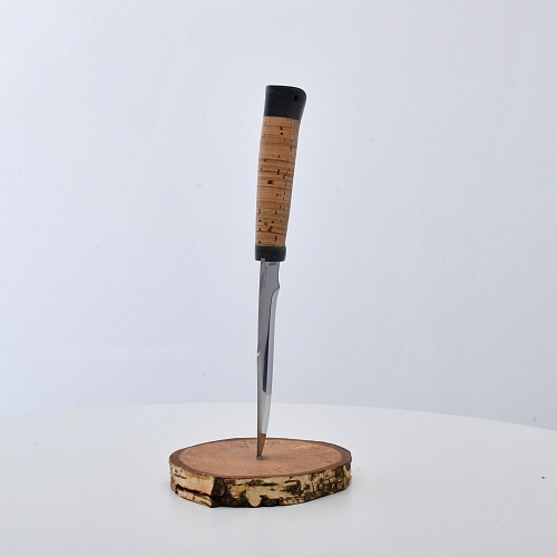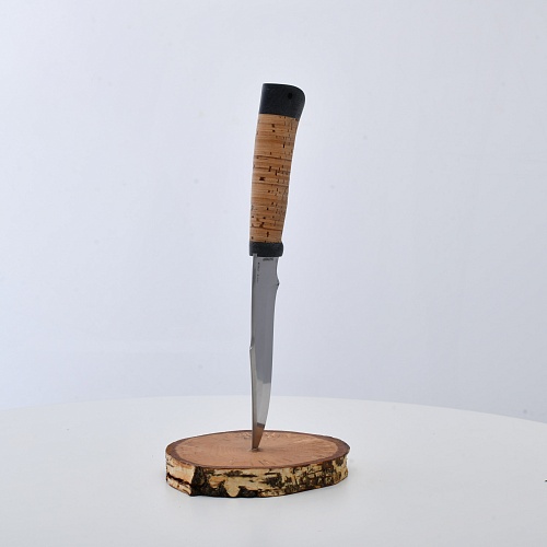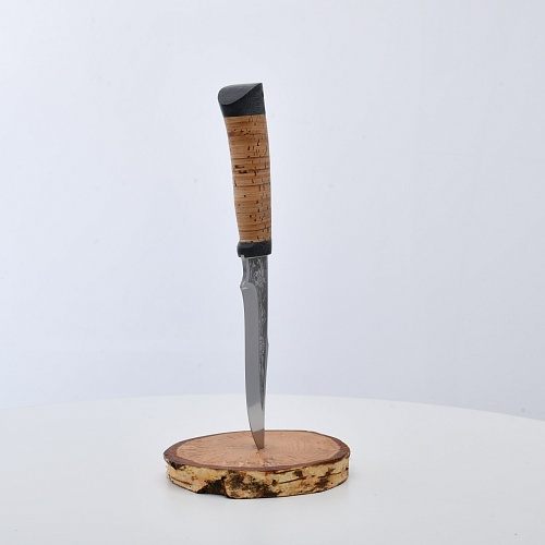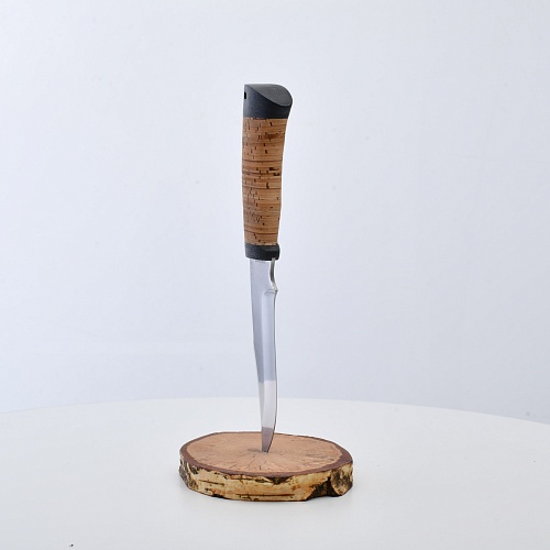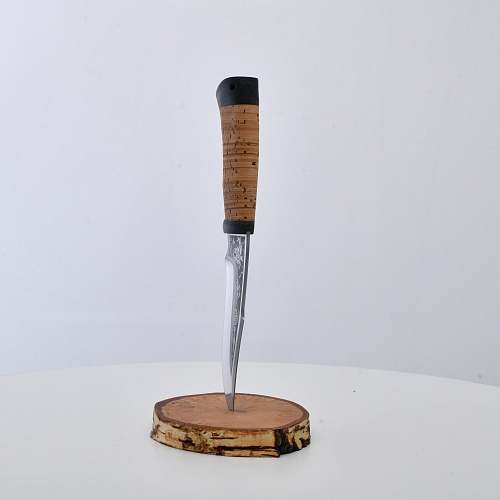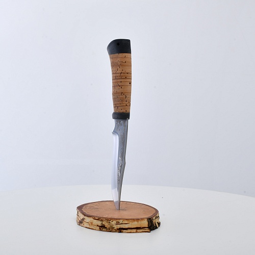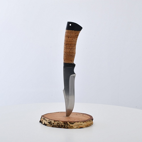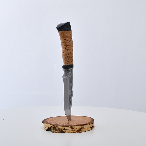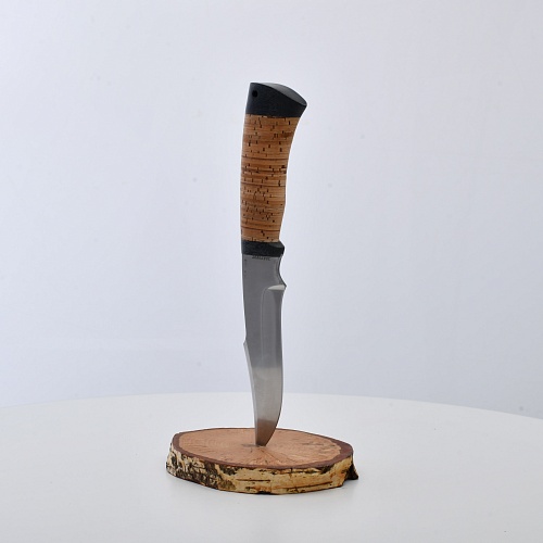 Купил этот нож, внешне очень понравился . Сталь 95х18 . Ручка удобная , но заточка.... Честно говоря удивился она ассиметрична и не острая . Это мой первый собственный нож ( до этого покупал на подарок другой компании ) но то что он шкурку помидора без давления не разрезал .... Да и жена повар отметила что он туповат . думаю заточка всё решит ... Гравировка методом травления видимо смотрится на любителя . Покупал из стали эи 107 нож соболь другой Златоустовской компании там гравировка объёмная ну это с точки зрения эстетики . Ручка береста это конечно класс лично мне нравится. Вообще думаю купить вулканус и точить самому .