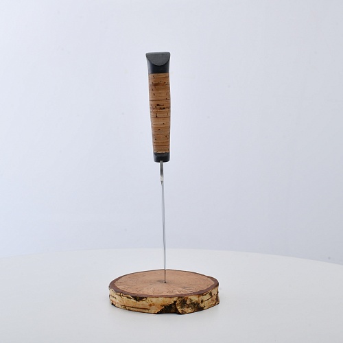 Средний универсальный прочный нож с хищным клинком восточного ятаганного вида, имеющим вогнутые линзовидные спуски от середины клинка, образующие тонкое, прекрасно режущее лезвие. Демонстрирует неплохие режущие качества. Весьма серьезный инструмент. Клинок толщиной обуха в 3 мм имеет прогнутое фальшлезвие двусторонней заточки, с углом заточки 60 градусов и может быть использовано для рубки мелких костей и хрящей. На пяте клинка есть подпальцевый вырез для указательного пальца. Форма рукояти удобна даже для большой руки, уверенно и прочно ложится в любую ладонь. Монтаж рукояти сквозной, неразборный. На навершии рукояти имеется отверстие под темляк. Отличный выбор для большинства видов работы в лесу.