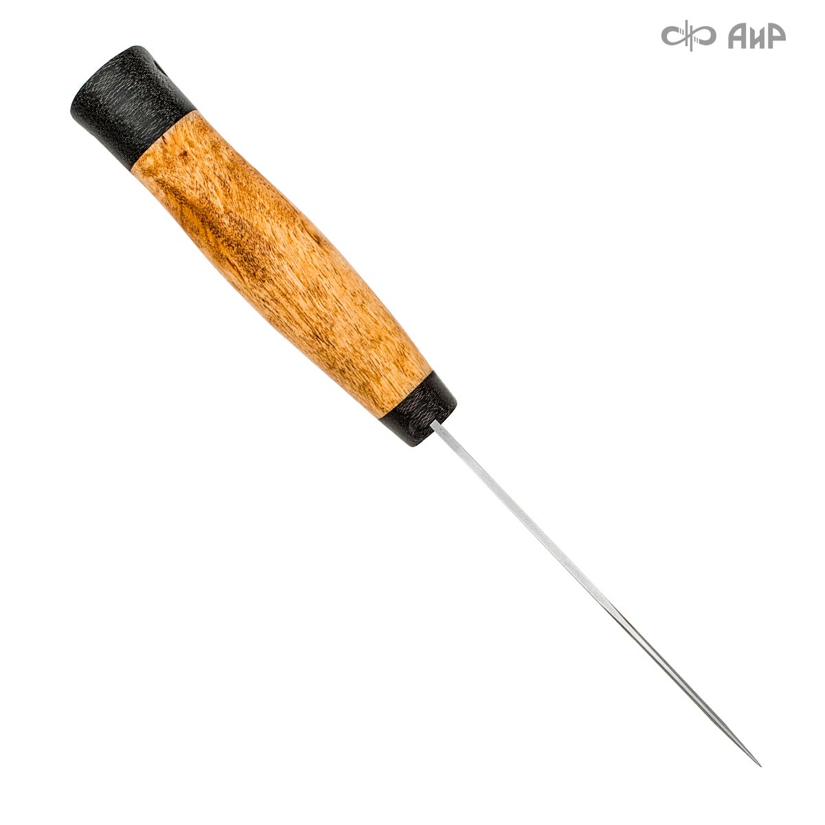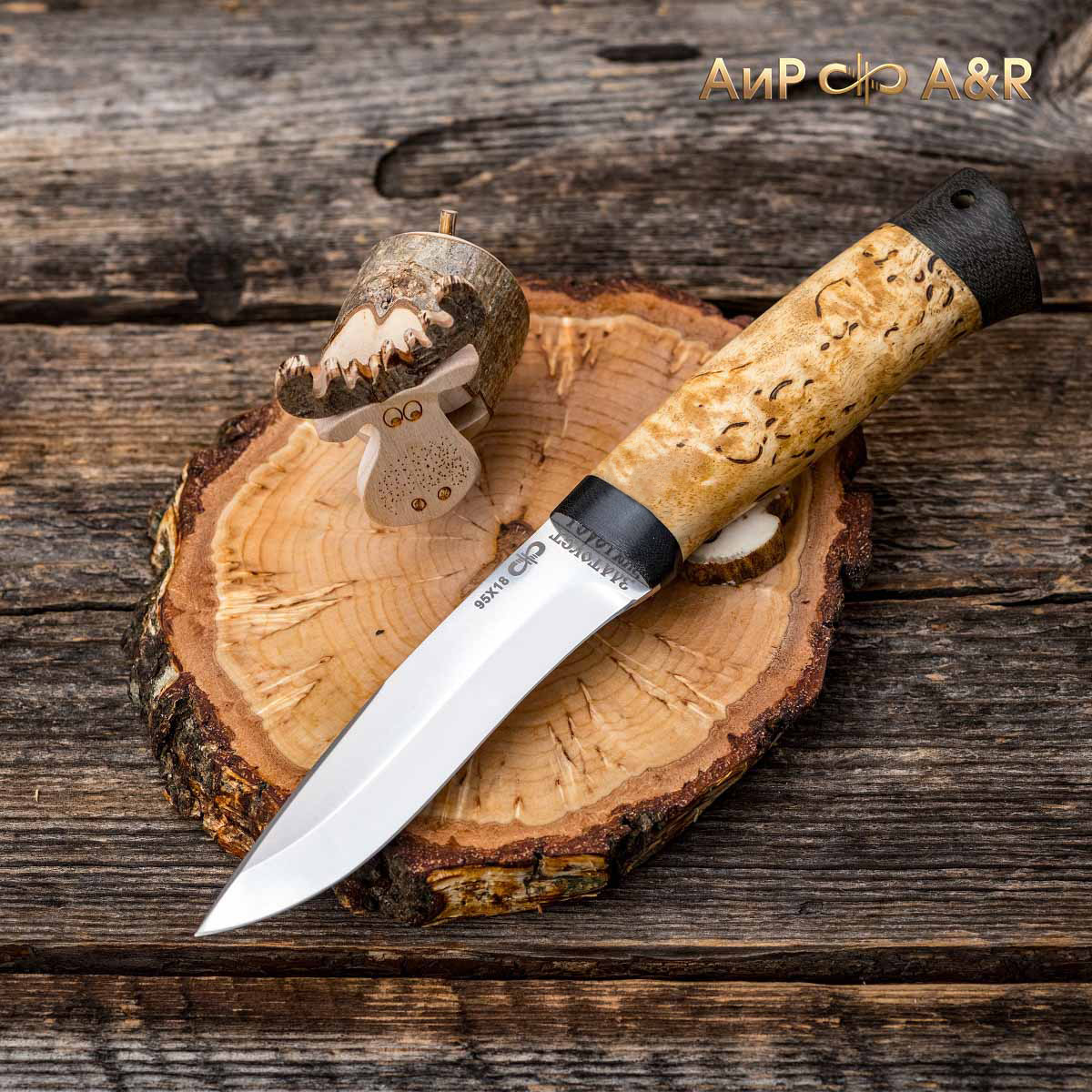 Небольшой универсальный, очень легкий и прочный нож с изогнутым клинком ятаганной формы. Клинок имеет вогнутые линзовидные спуски от середины ширины клинка. При толщине обуха в 2,0 мм имеет широкую голомень, что придает ему дополнительную прочность. Хороший нож для коротких прогулок в лес, на пикник или за грибами. Монтаж рукояти сквозной, неразборный. На навершии рукояти имеется отверстие под темляк. Форма клинка и отсутствие гарды делает этот нож хорошим помощником при работе с продуктами и разделке боровой и водоплавающей птицы, мелкого пушного зверя.
