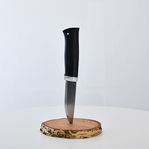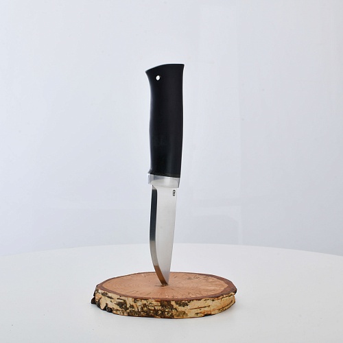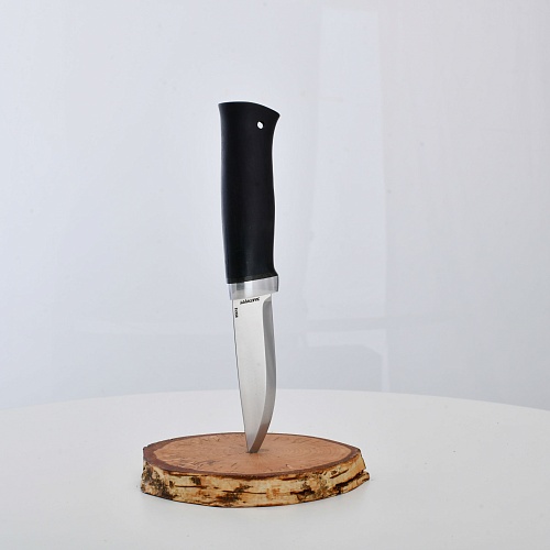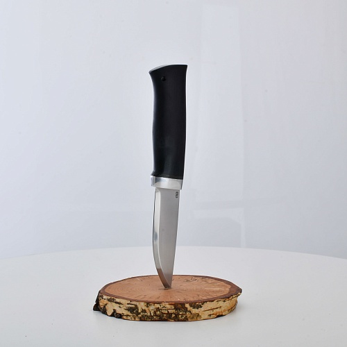 Небольшой универсальный, легкий и прочный нож классической скандинавской формы с нешироким клинком, имеющим популярные у скандинавов неширокие прямые спуски, образующие агрессивно режущее лезвие. Клинок имеет чуть приспущенный к острию обушок. Нож демонстрирует отличные режущие качества. Клинок с толщиной обуха в 2,4 мм имеет широкую голомень с обеих сторон, что придает ему дополнительную прочность. Скандинавская форма рукояти подкупает: она удобна даже для большой руки, уверенно и прочно ложится в любую, даже усталую ладонь. Оптимальной величины гарда не дает соскользнуть пальцам при резах от себя. Навершие рукояти «грибком» позволяет с большей уверенностью извлекать нож из глубоких ножен. Монтаж рукояти всадной, неразборный. На навершии рукояти имеется отверстие под темляк. Первоначально планировался как бюджетный нож с дамасским клинком и деревянной рукоятью, но по желанию покупателей стал выпускаться во всех вариантах исполнения, используемых компанией. «Кузюк» ‒ отличный выбор для большинства видов работы в лесу.