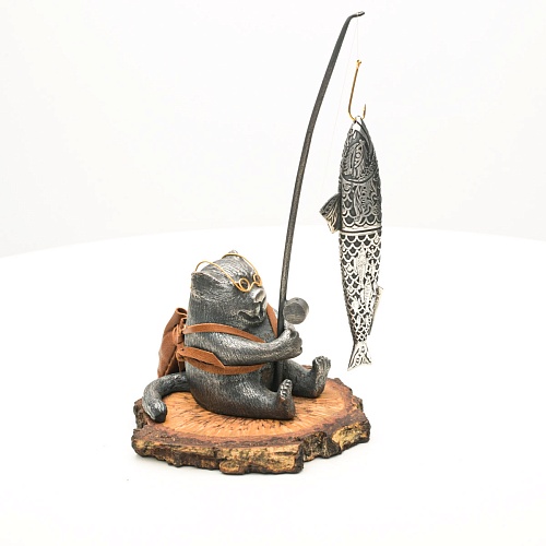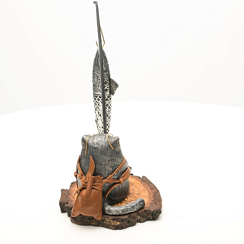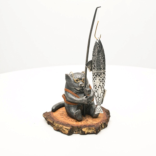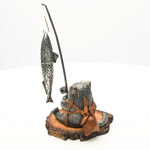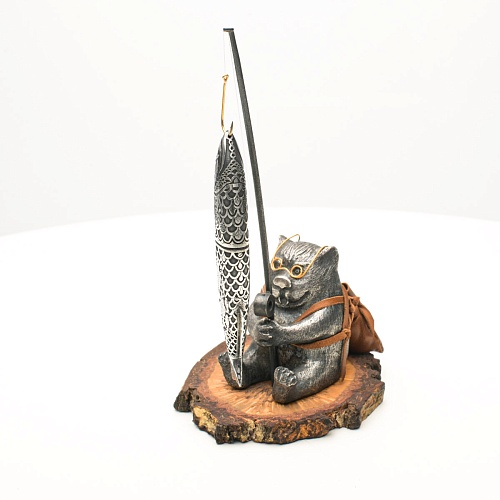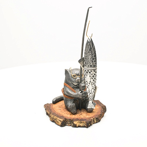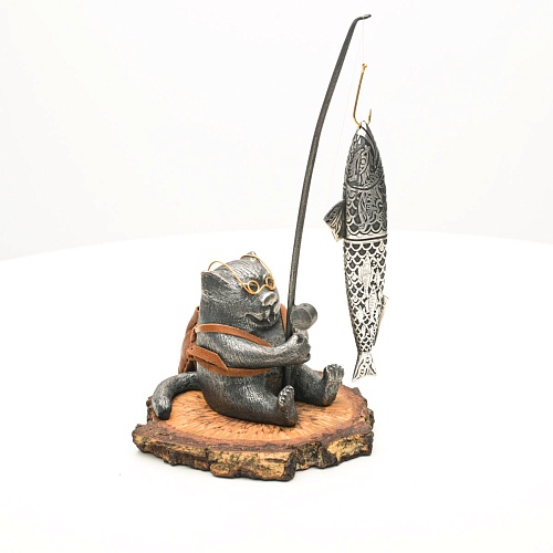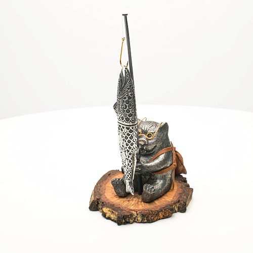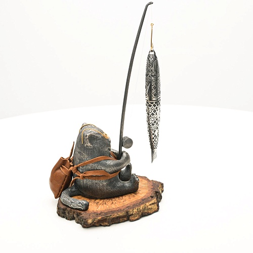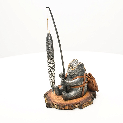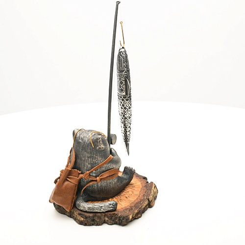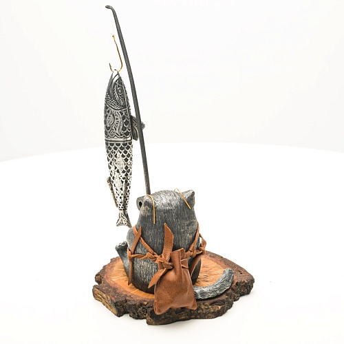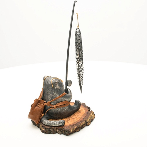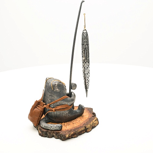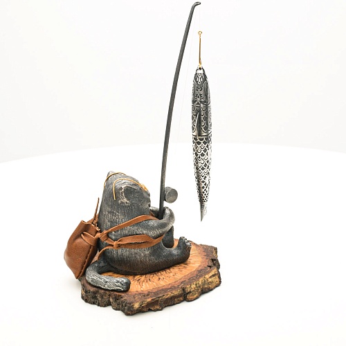 В лапах держит удочку. Сегодня профессору несказанно повезло, на крючок попалась не простая рыба, а особенная – с секретом. Внутри рыбины маленький клинок из дамасской стали Zladinox, ножнами для него служит хвостовая часть рыбы. Сама рыба покрыта серебром в технике патинирования, тонко проработаны форма, глаза, чешуя, плавники, а по бокам пристроилась стайка мелких рыбешек. Клинок, несмотря на малую величину – длиной всего 108 мм, вполне функциональный нож, которым можно резать.