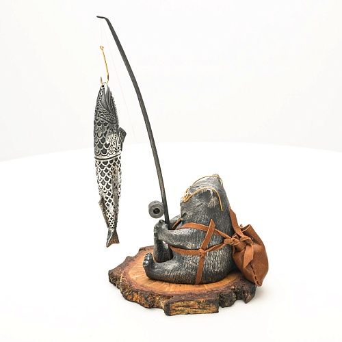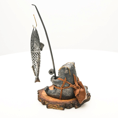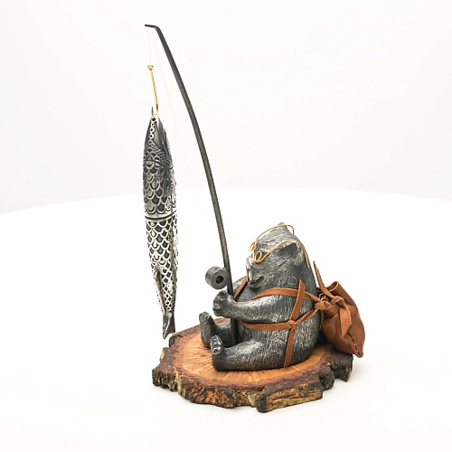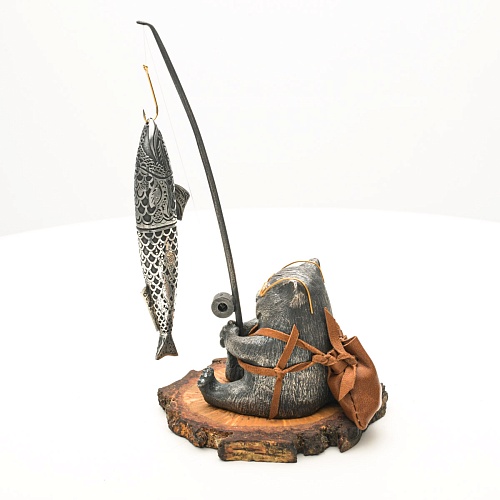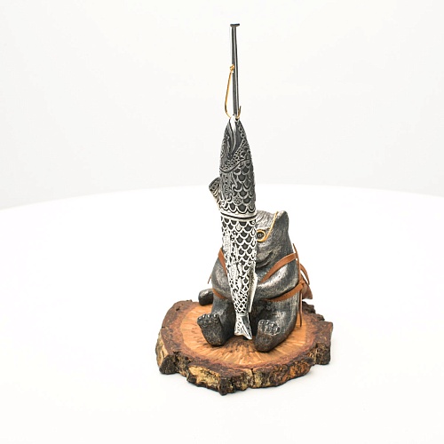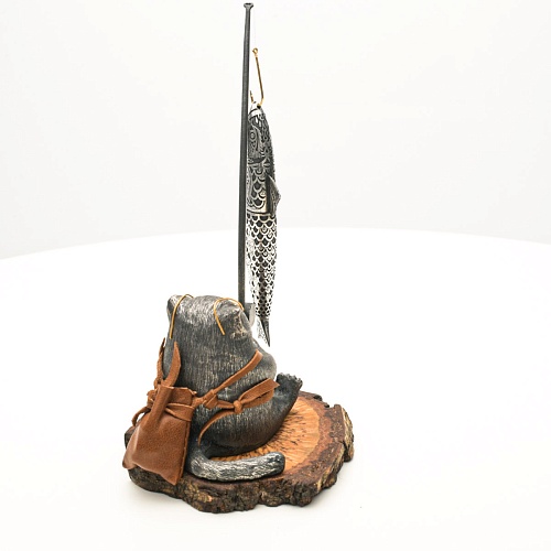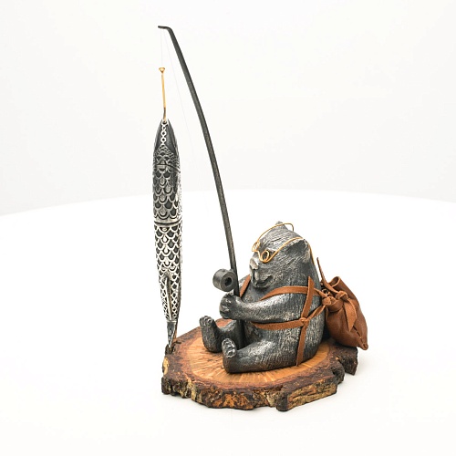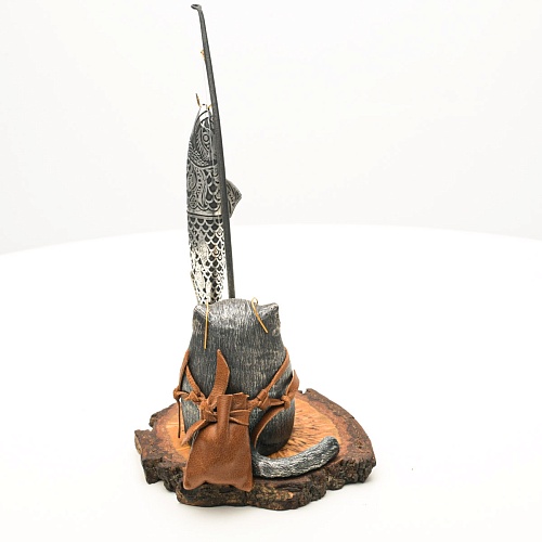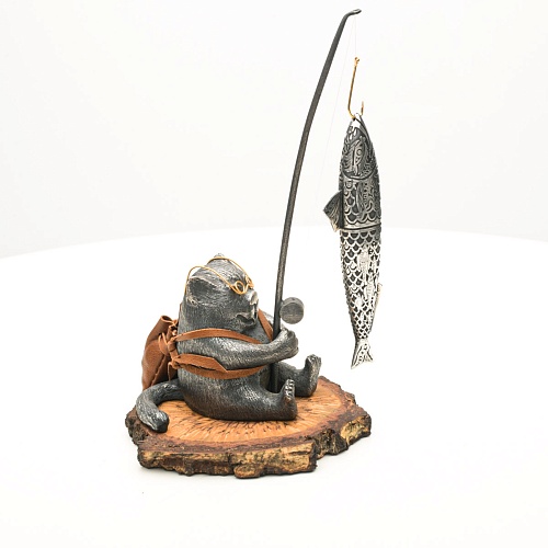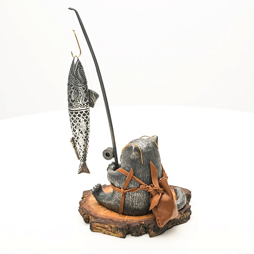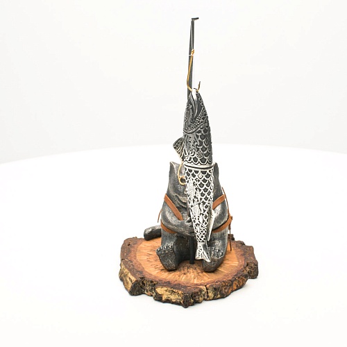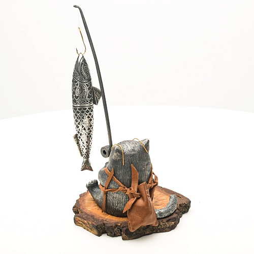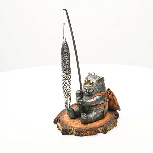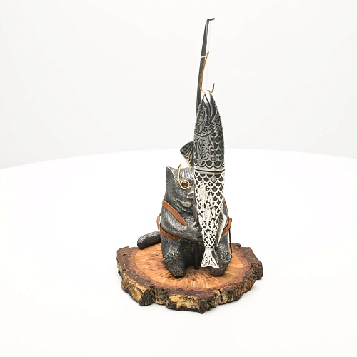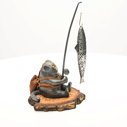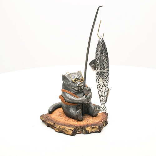 В лапах держит удочку. Сегодня профессору несказанно повезло, на крючок попалась не простая рыба, а особенная – с секретом. Внутри рыбины маленький клинок из дамасской стали Zladinox, ножнами для него служит хвостовая часть рыбы. Сама рыба покрыта серебром в технике патинирования, тонко проработаны форма, глаза, чешуя, плавники, а по бокам пристроилась стайка мелких рыбешек. Клинок, несмотря на малую величину – длиной всего 108 мм, вполне функциональный нож, которым можно резать.