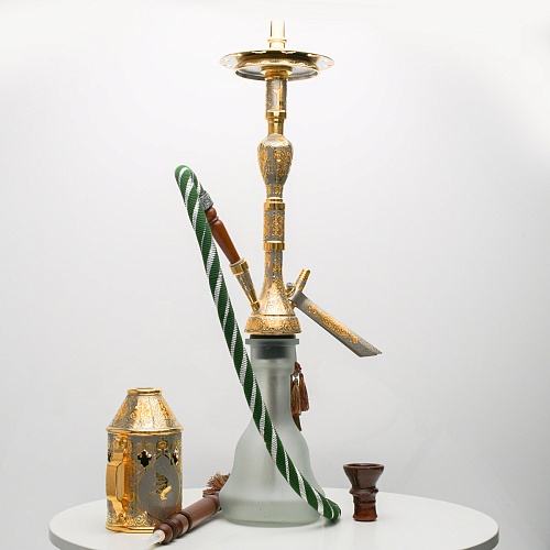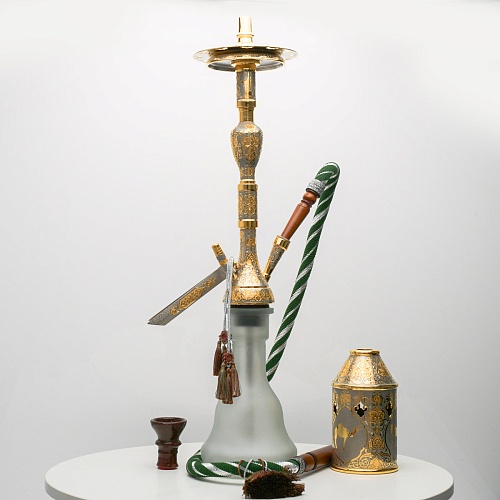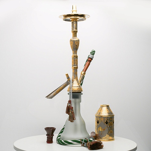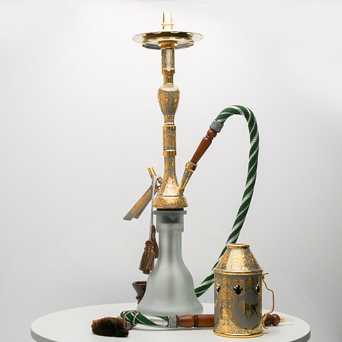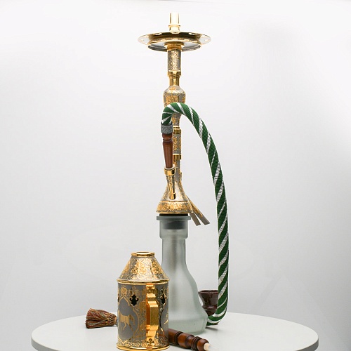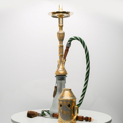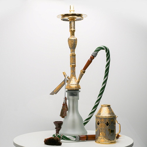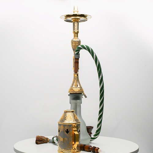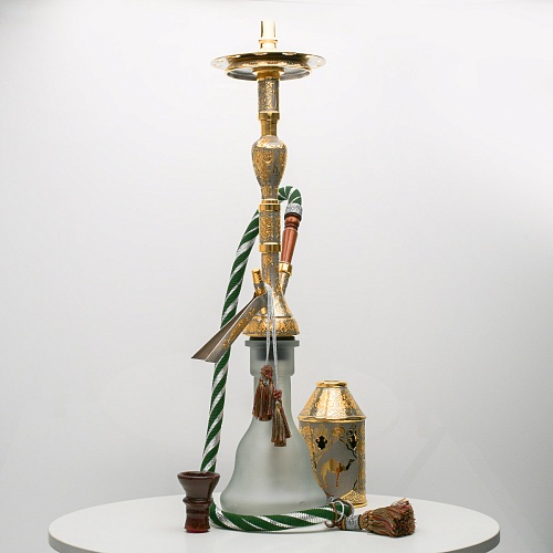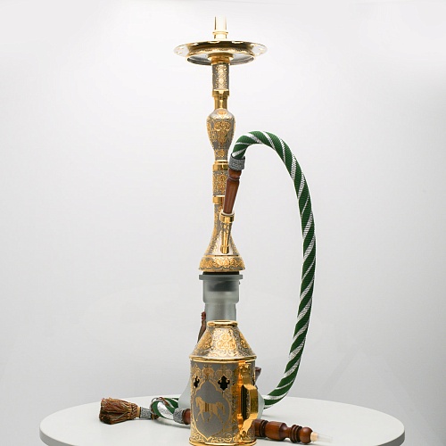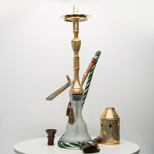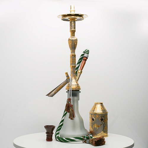 В изготовлении представленного кальяна принимали участие самые достойные мастера и художники Компании «АиР». Кальян украшен традиционными символами Востока: сокол – символ единства в стране; верблюд – символ хорошего предзнаменования, жизни, здоровья, любви; арабский жеребец – символ стремительности, выносливости, смелости и верности.