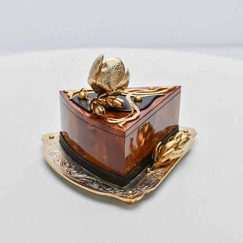 Шкатулка изготовлена из уральской яшмы насыщенных красок. Выполнена в форме кусочка торта на блюдце. Ягода физалиса служит стилизованной ручкой для съемной крышки. Подставка и крышка шкатулки украшены накладками в стиле златоустовской гравюры на металле. Элементы шкатулки покрыты золотом, которое придает всему изделию элегантный вид.