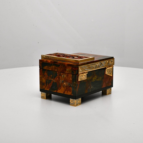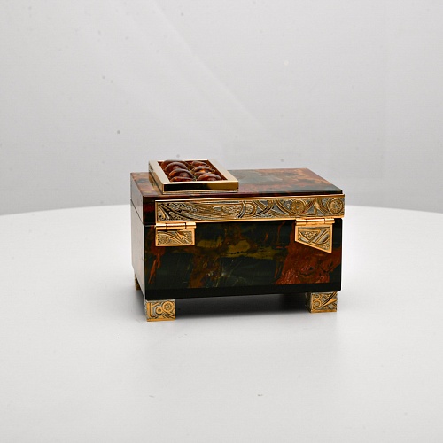 Шкатулка "Энергия солнца" изготовлена из яшмы Пикассо редкой красоты и украшена кабошонами янтаря. Ножки, боковые стороны и крышка шкатулки украшены накладками в стиле златоустовской гравюры на металле. Эта шкатулка хранит тепло рук мастеров, она - как кладовая солнца, которое запечатано в янтаре и природном камне.